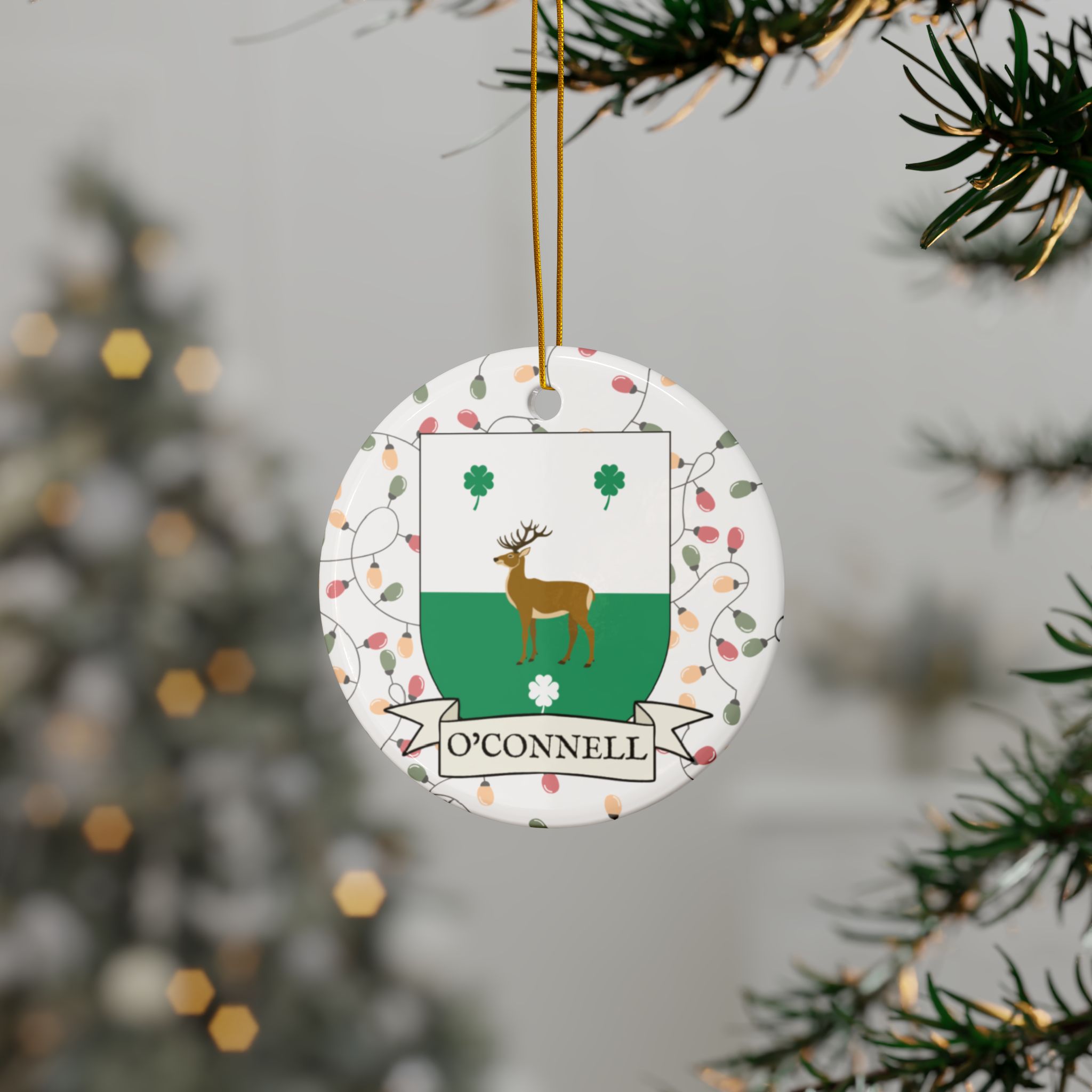 Celebrate the Holidays (and your Irish Heritage) with Irish Family Coat of Arms Christmas Tree Ornaments! Your family’s coat of arms printed on a 100% ceramic ornament with a festive Christmas Tree lights background. Great gift idea for the Irish Americans in your life. It’s sure to become a Christmas tradition!