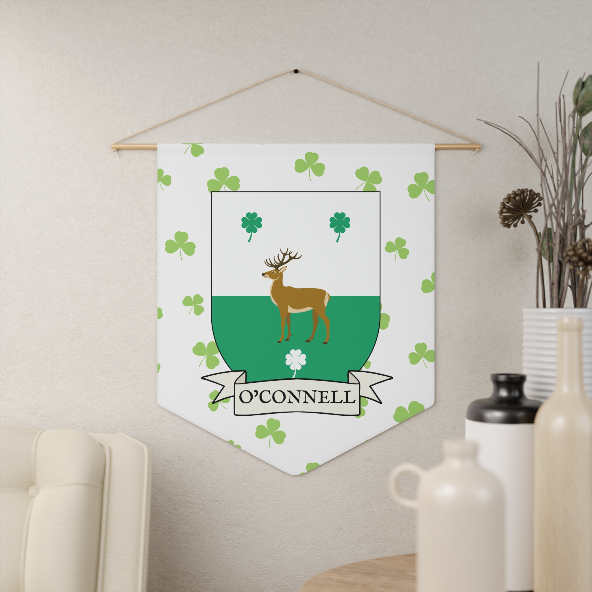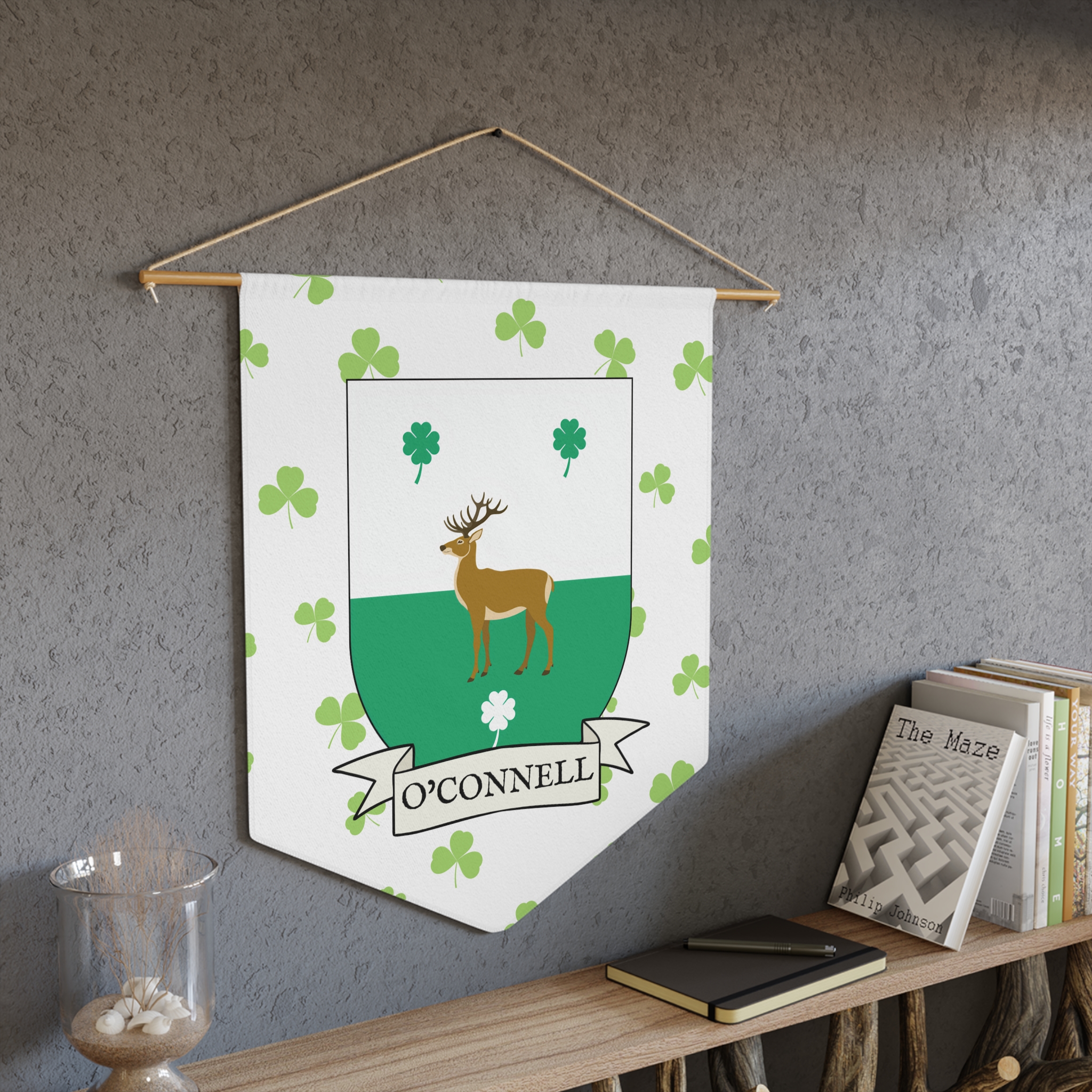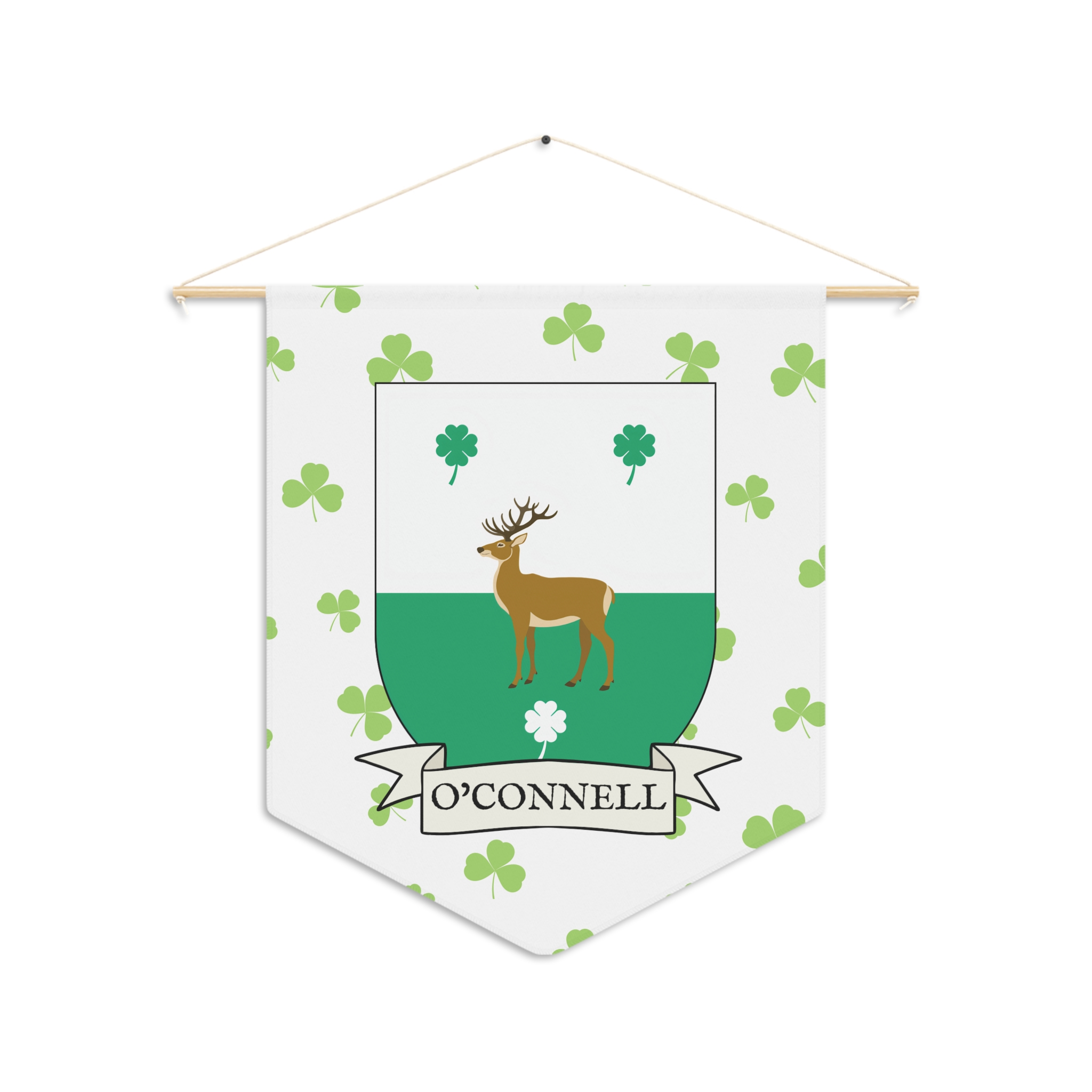 Uplift any room and show off your Irish American roots with this O’Connell Family Coat of Arms Indoor Pennant. Pennant is printed on durable poly twill and comes with a wooden dowel/twine frame for easy hanging. Features your family Coat of Arms printed over a restrained shamrock patterned background.