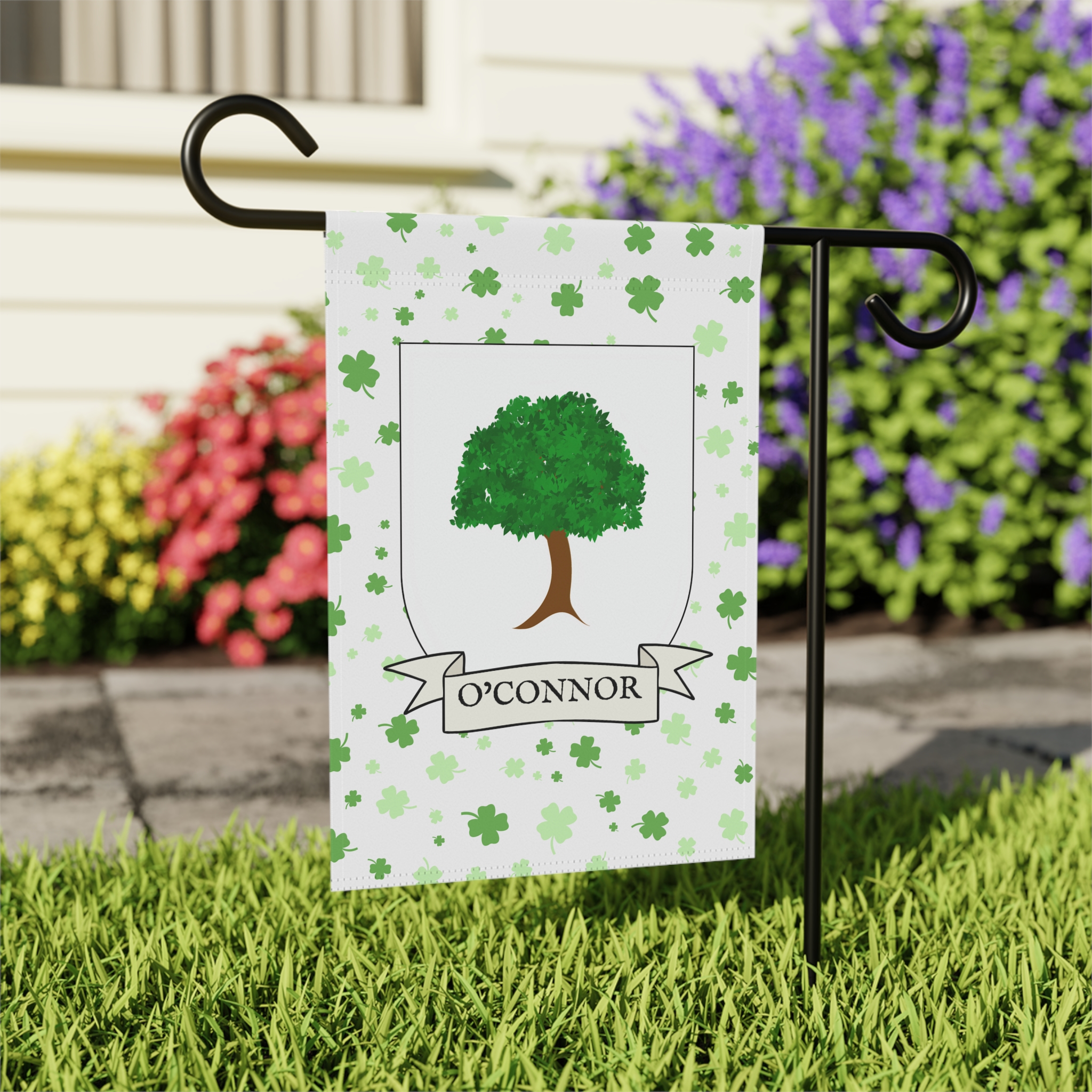 This welcoming Garden Banner will be a great addition to your garden or yard. It displays the O’Connor Family Coat of Arms over a subtle background showing a field of four-leaf shamrocks. Both sides show identical images.