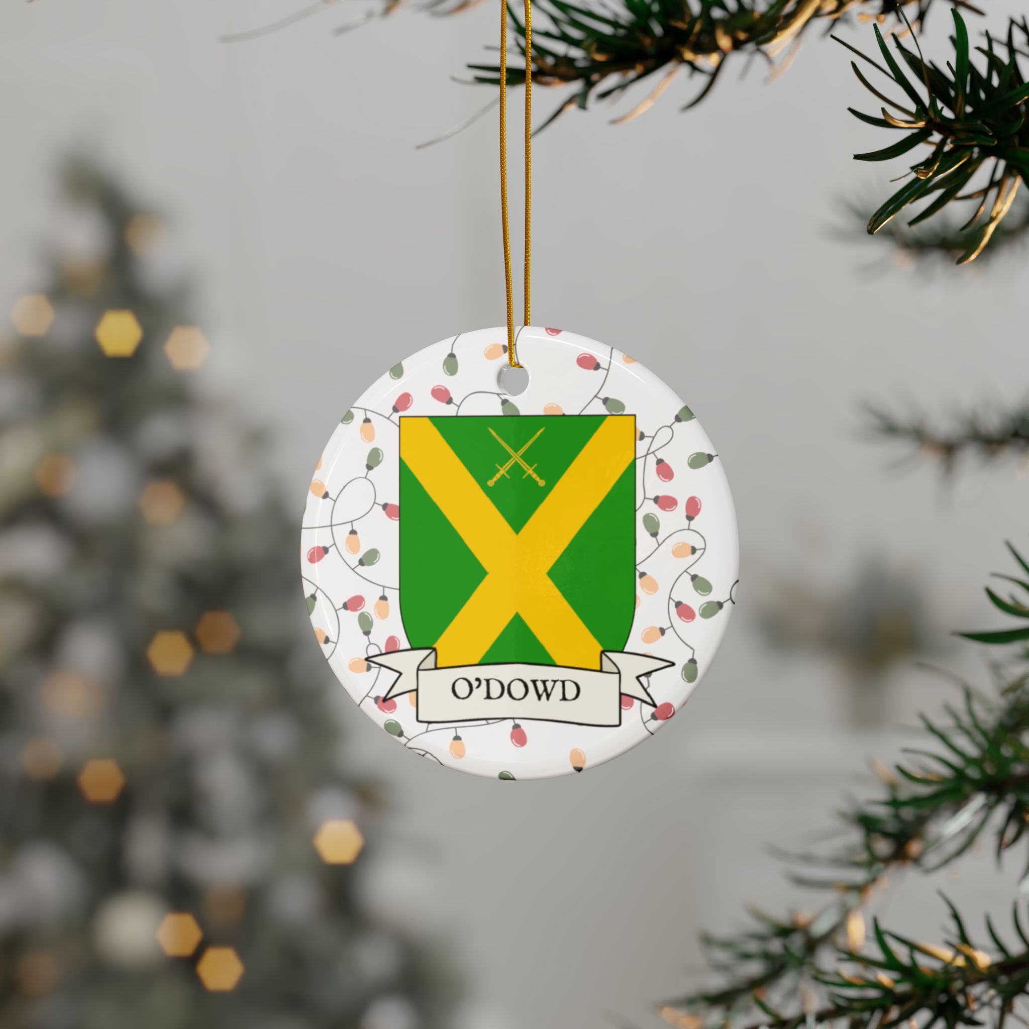 Celebrate the Holidays (and your Irish Heritage) with Irish Family Coat of Arms Christmas Tree Ornaments! Your family’s coat of arms printed on a 100% ceramic ornament with a festive Christmas Tree lights background. Great gift idea for the Irish Americans in your life. It’s sure to become a Christmas tradition!