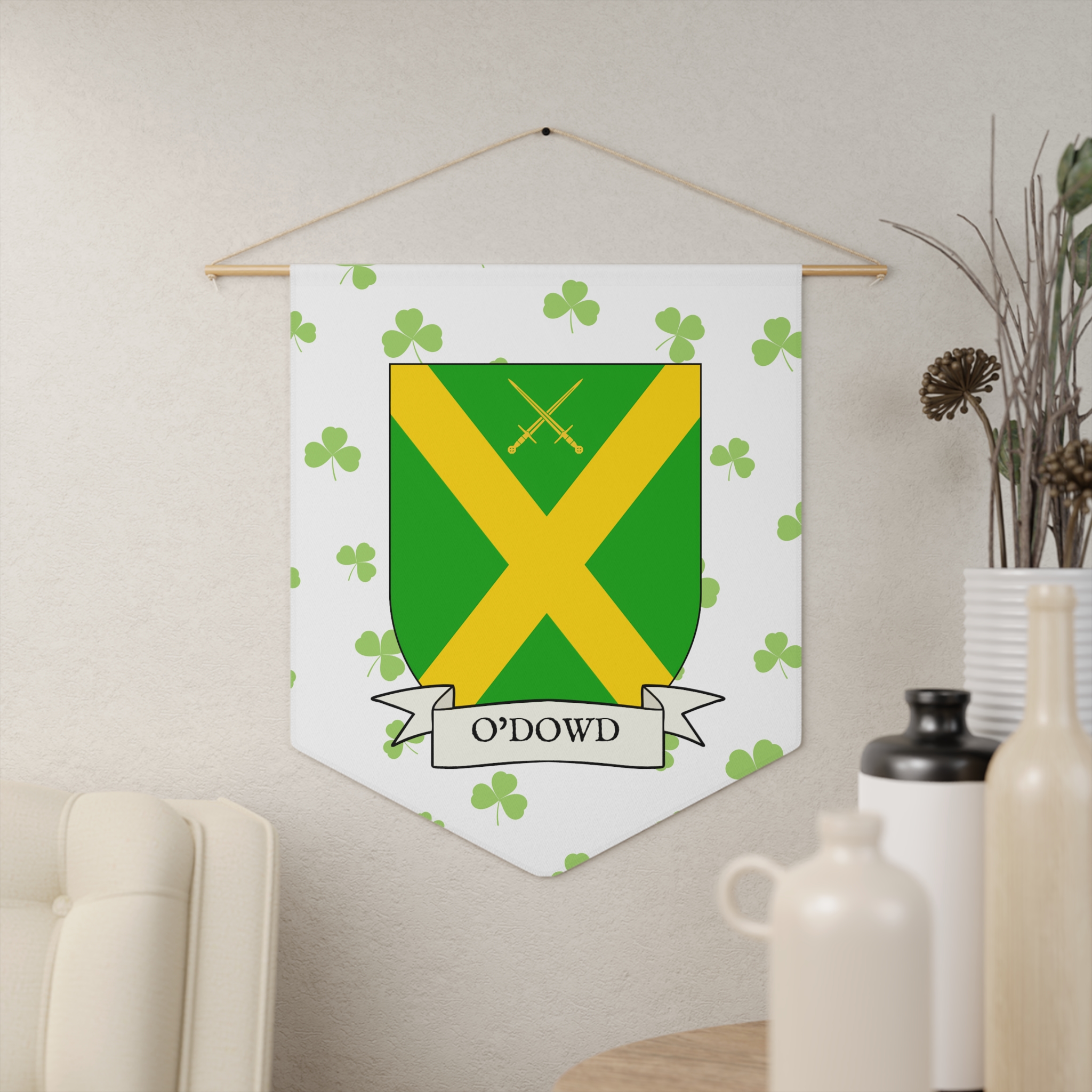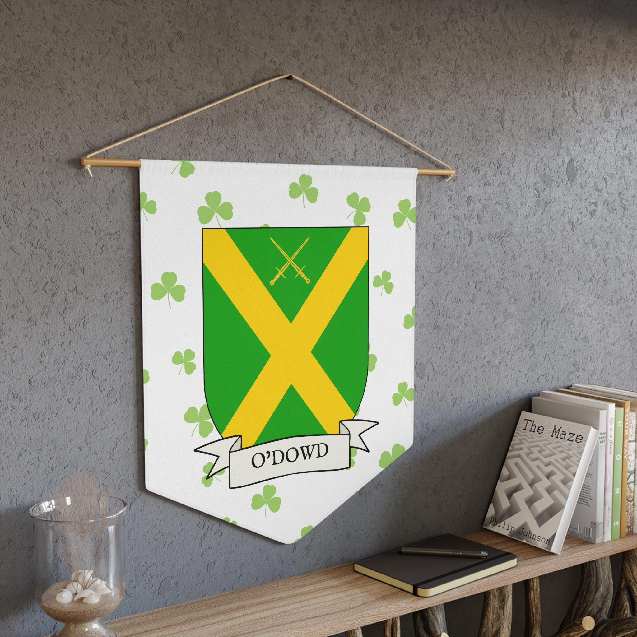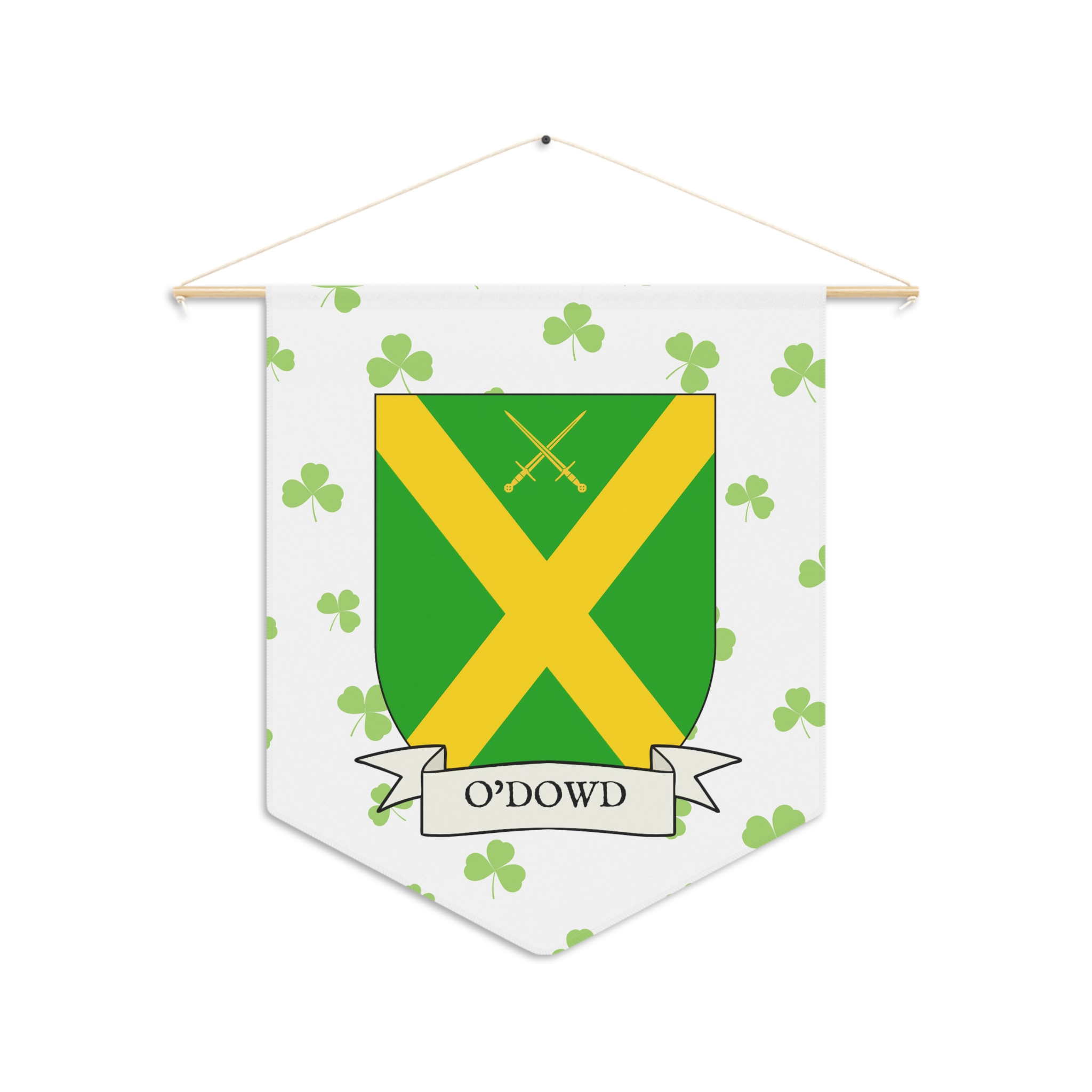 Uplift any room and show off your Irish American roots with this O’Dowd Family Coat of Arms Indoor Pennant. Pennant is printed on durable poly twill and comes with a wooden dowel/twine frame for easy hanging. Features your family’s Coat of Arms printed over a restrained shamrock patterned background.