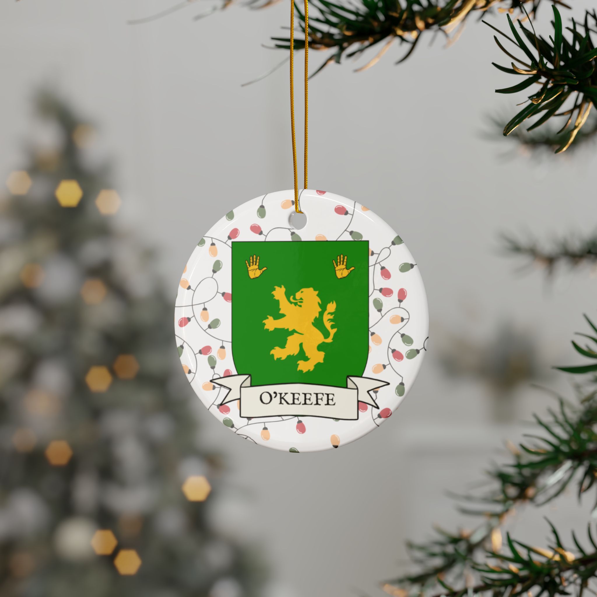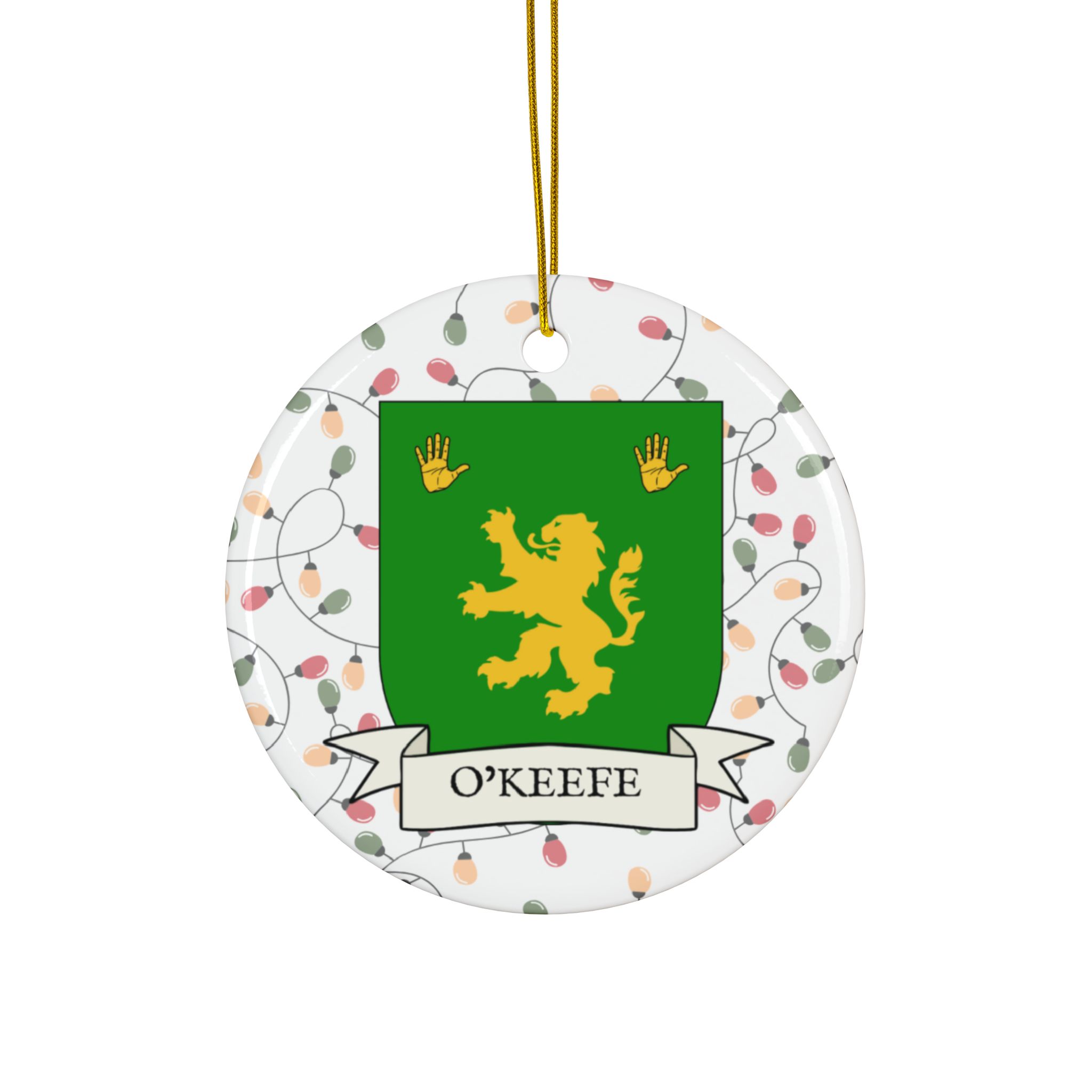 Celebrate the Holidays (and your Irish Heritage) with Irish Family Coat of Arms Christmas Tree Ornaments! Your family’s coat of arms printed on a 100% ceramic ornament with a festive Christmas Tree lights background. Great gift idea for the Irish Americans in your life. It’s sure to become a Christmas tradition!