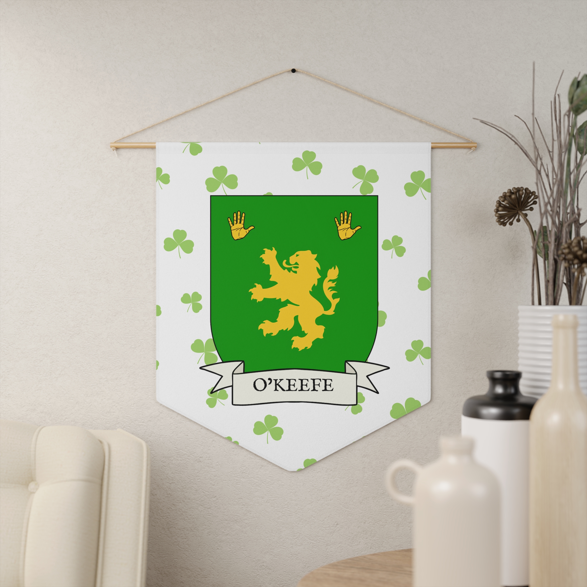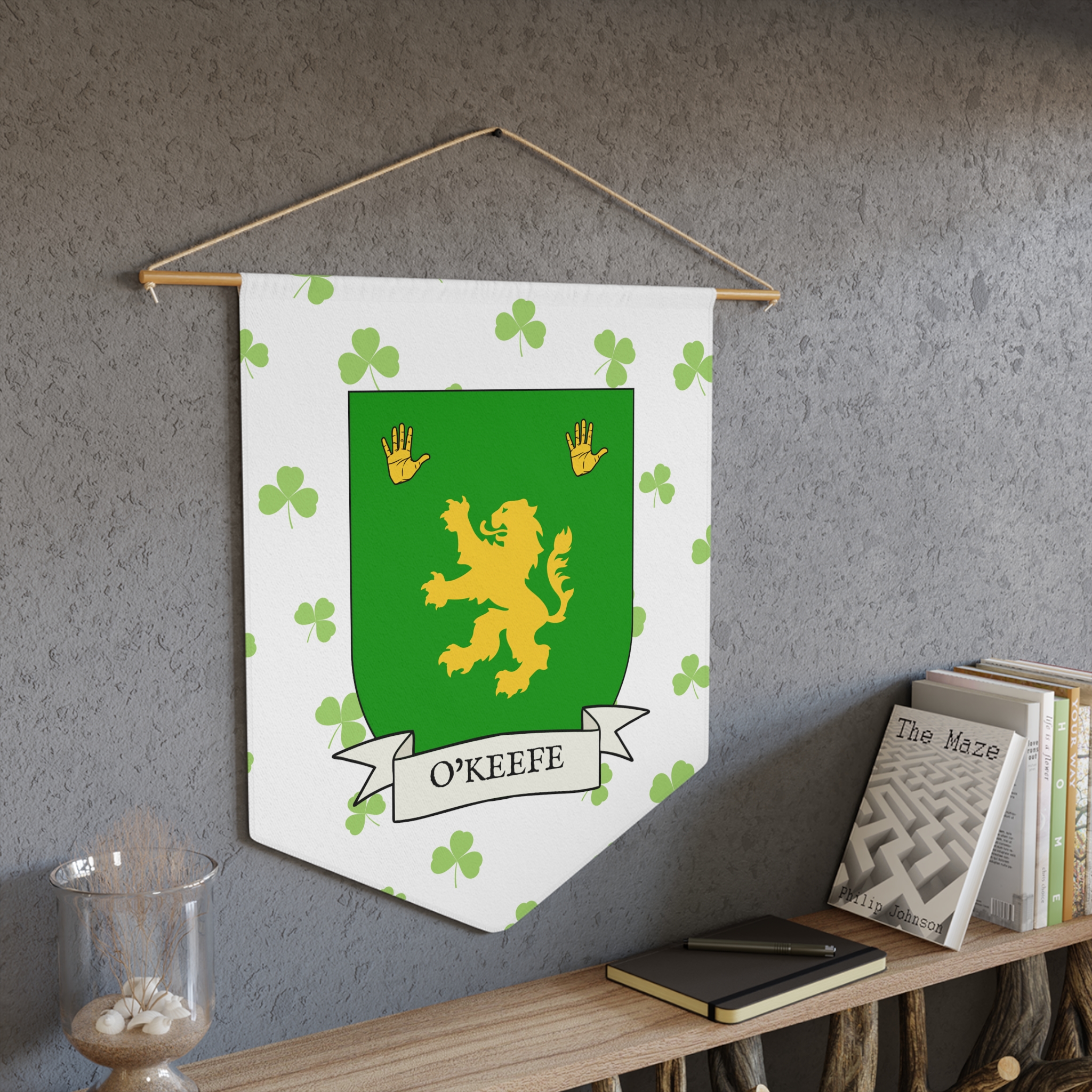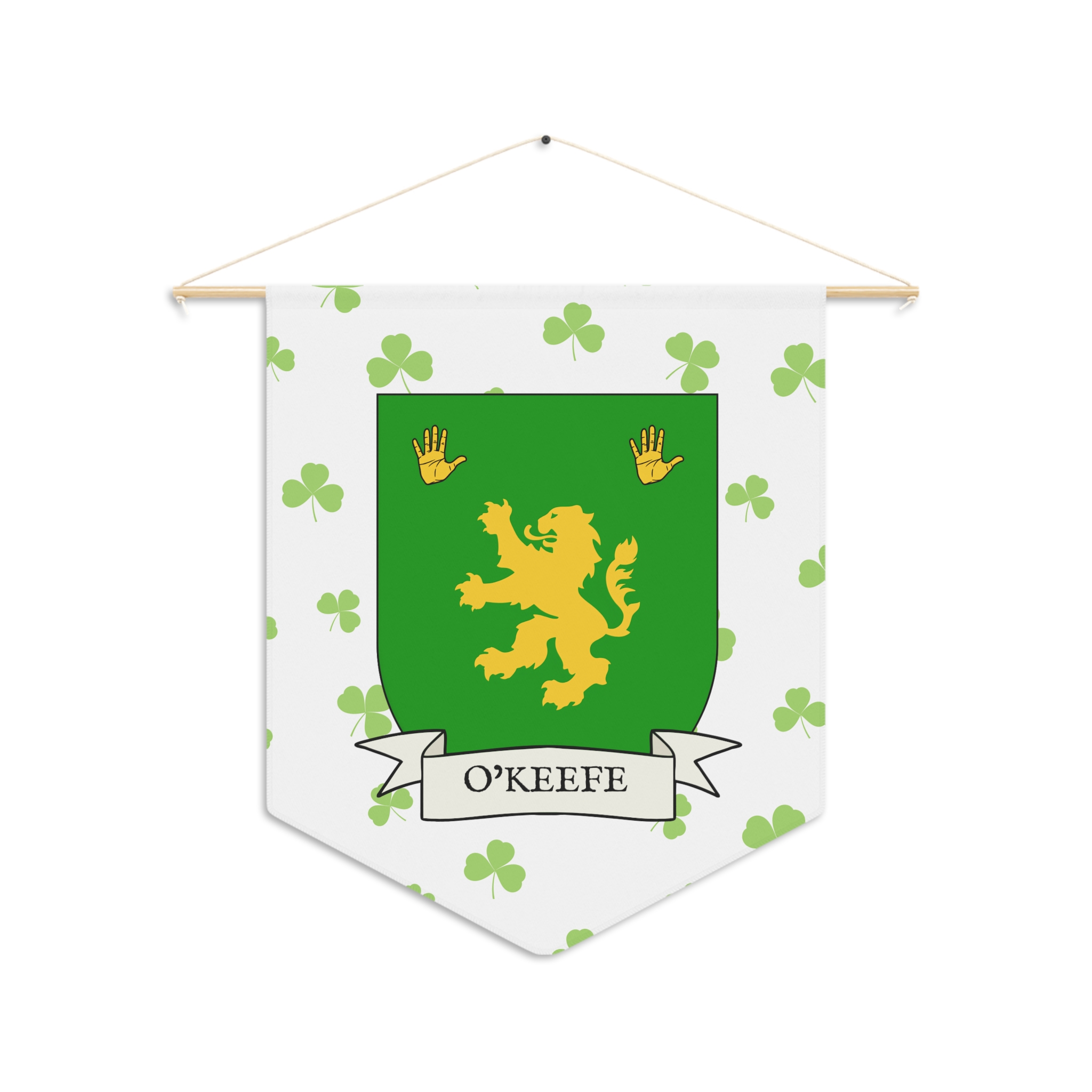 Uplift any room and show off your Irish American roots with this O’Keefe Family Coat of Arms Indoor Pennant. Pennant is printed on durable poly twill and comes with a wooden dowel/twine frame for easy hanging. Features your family Coat of Arms printed over a restrained shamrock patterned background.