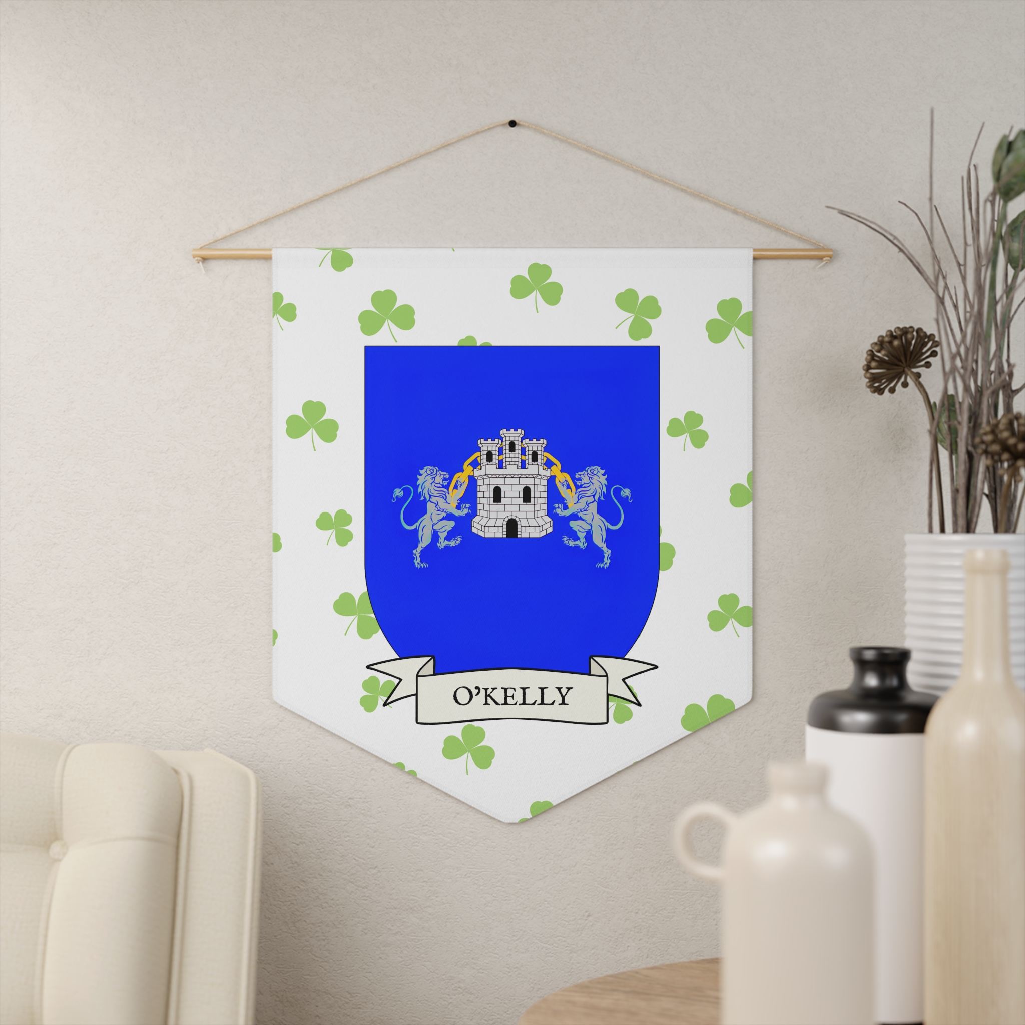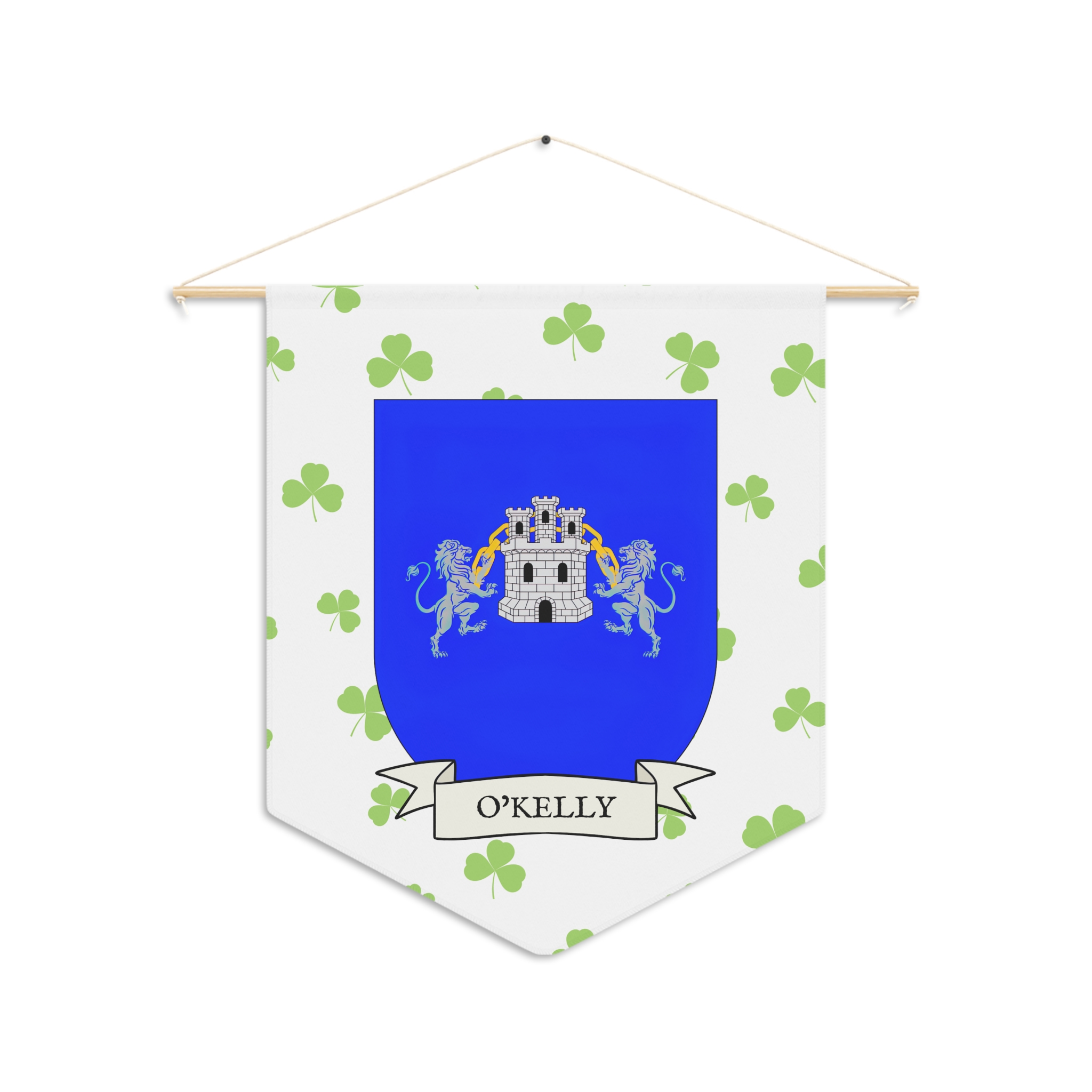 Uplift any room and show off your Irish American roots with this O’Kelly Family Coat of Arms Indoor Pennant. Pennant is printed on durable poly twill and comes with a wooden dowel/twine frame for easy hanging. Features your family Coat of Arms printed over a restrained shamrock patterned background.