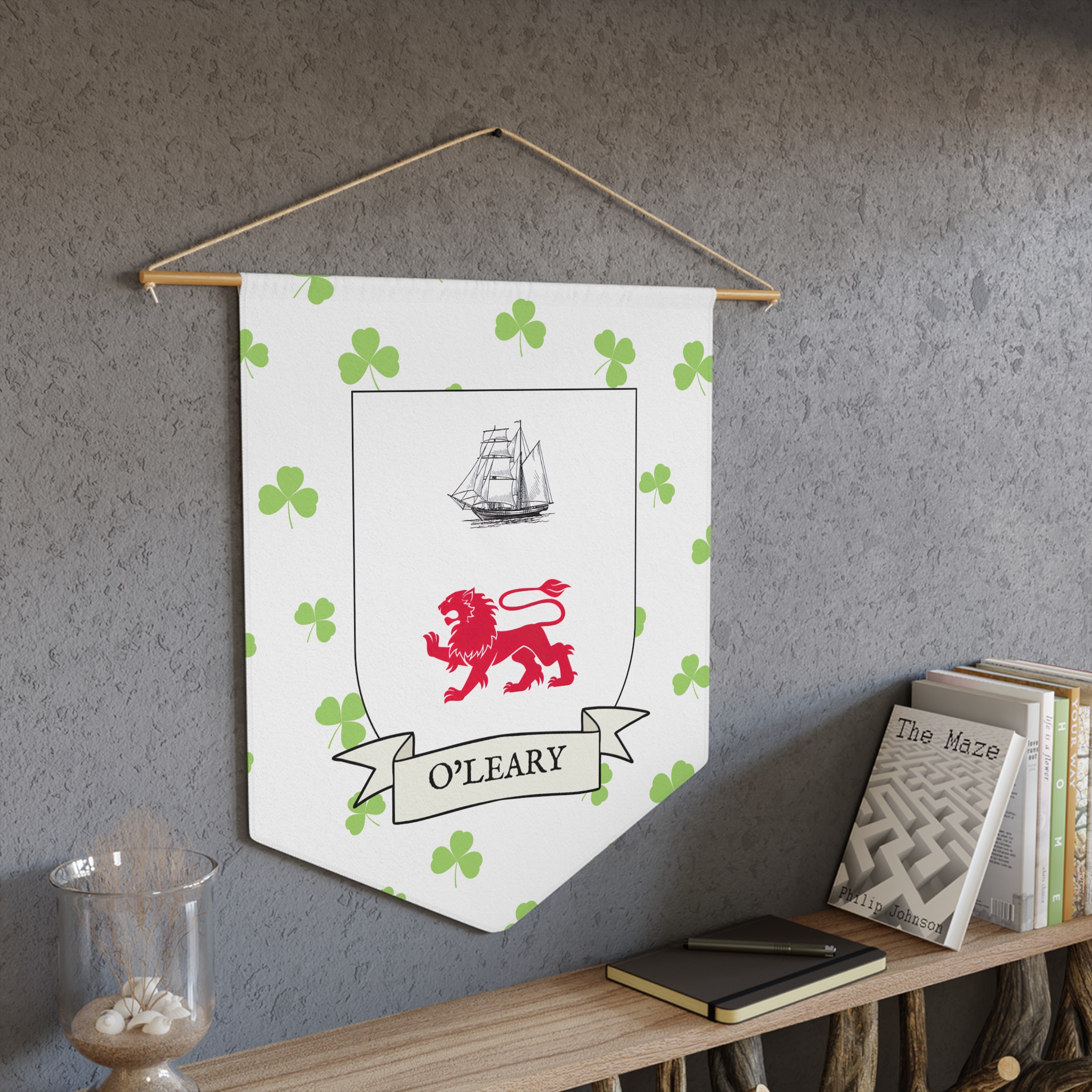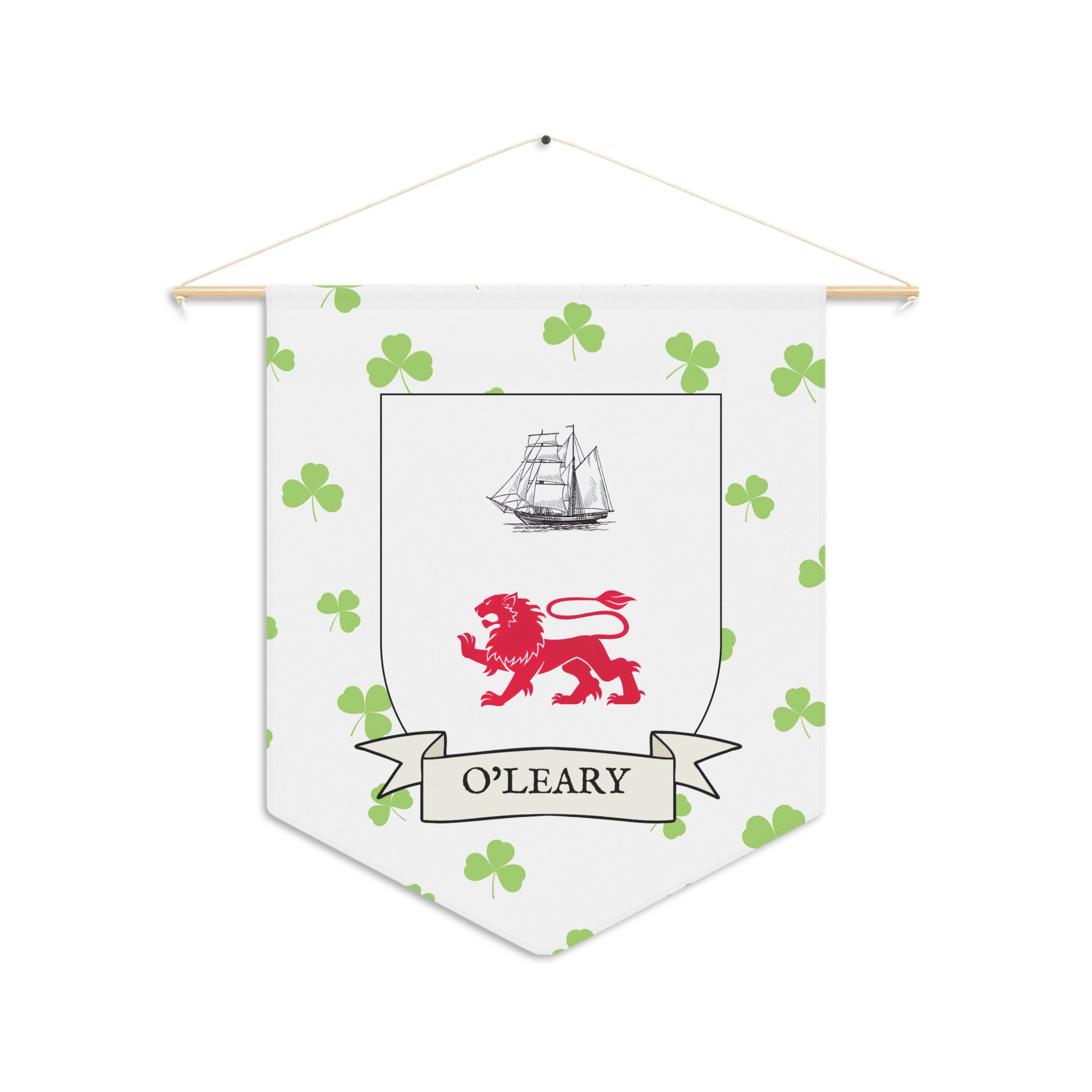 Uplift any room and show off your Irish American roots with this O’Leary Family Coat of Arms Indoor Pennant. Pennant is printed on durable poly twill and comes with a wooden dowel/twine frame for easy hanging. Features your family Coat of Arms printed over a restrained shamrock patterned background.