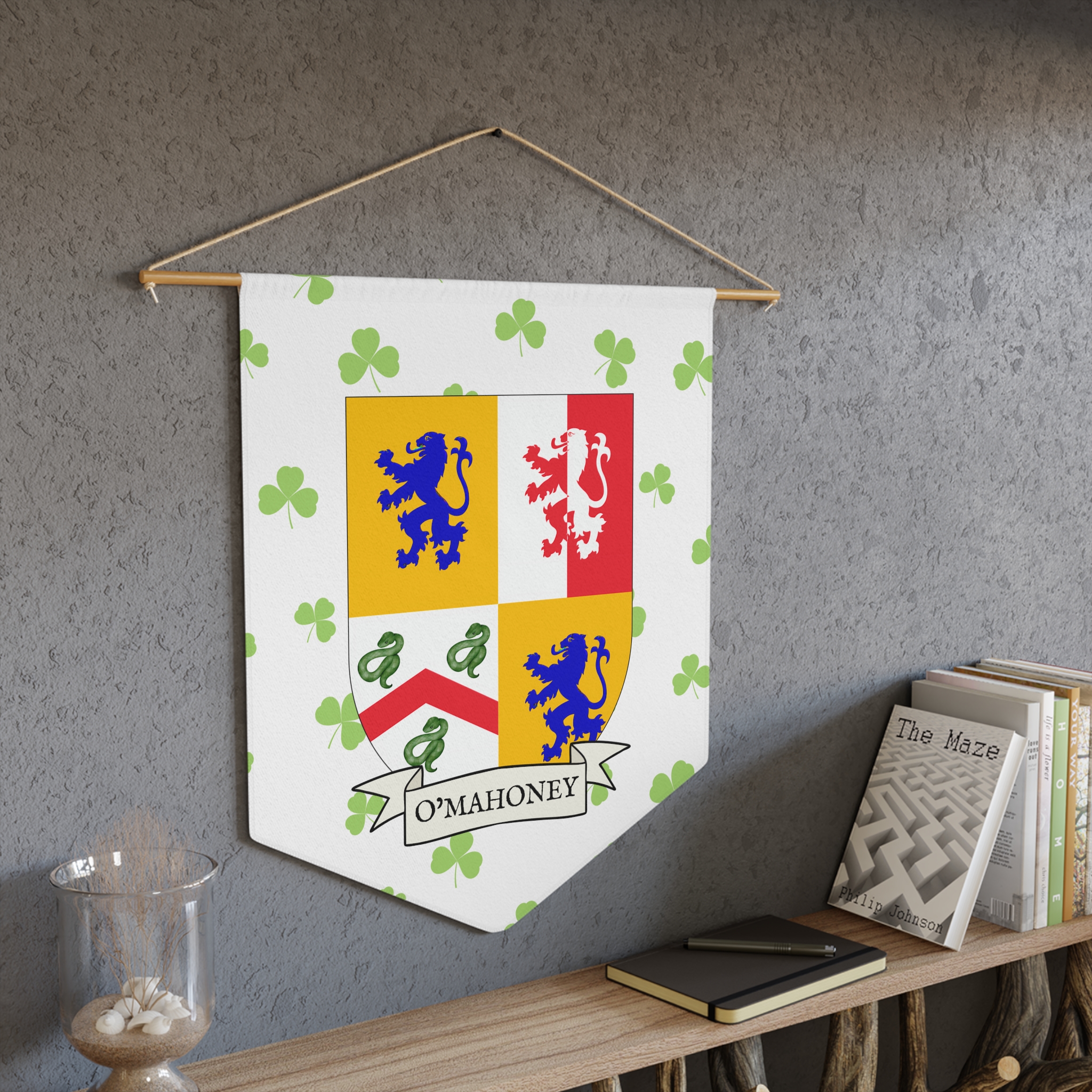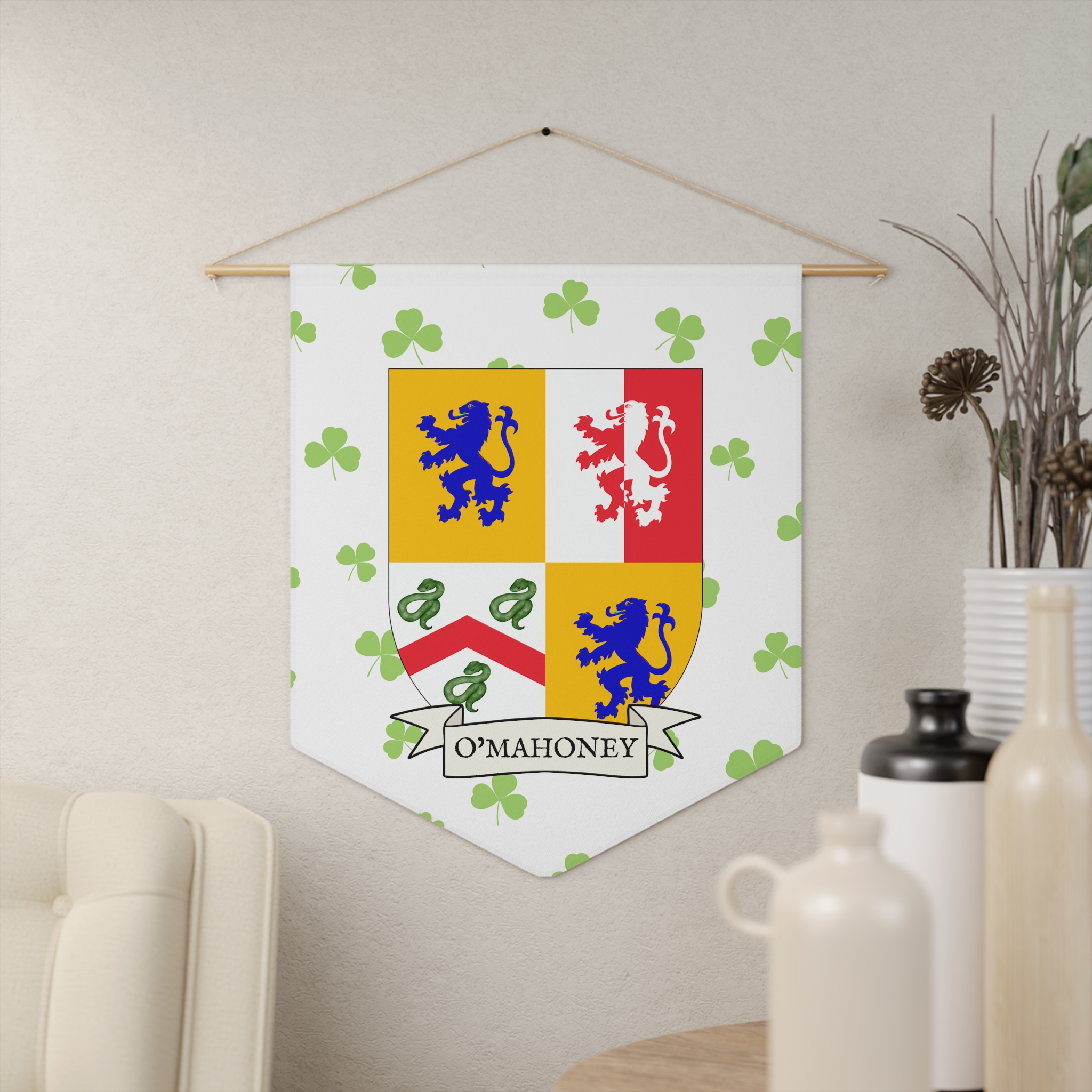Uplift any room and show off your Irish American roots with this O’Mahoney Family Coat of Arms Indoor Pennant. Pennant is printed on durable poly twill and comes with a wooden dowel/twine frame for easy hanging. Features your family Coat of Arms printed over a restrained shamrock patterned background.