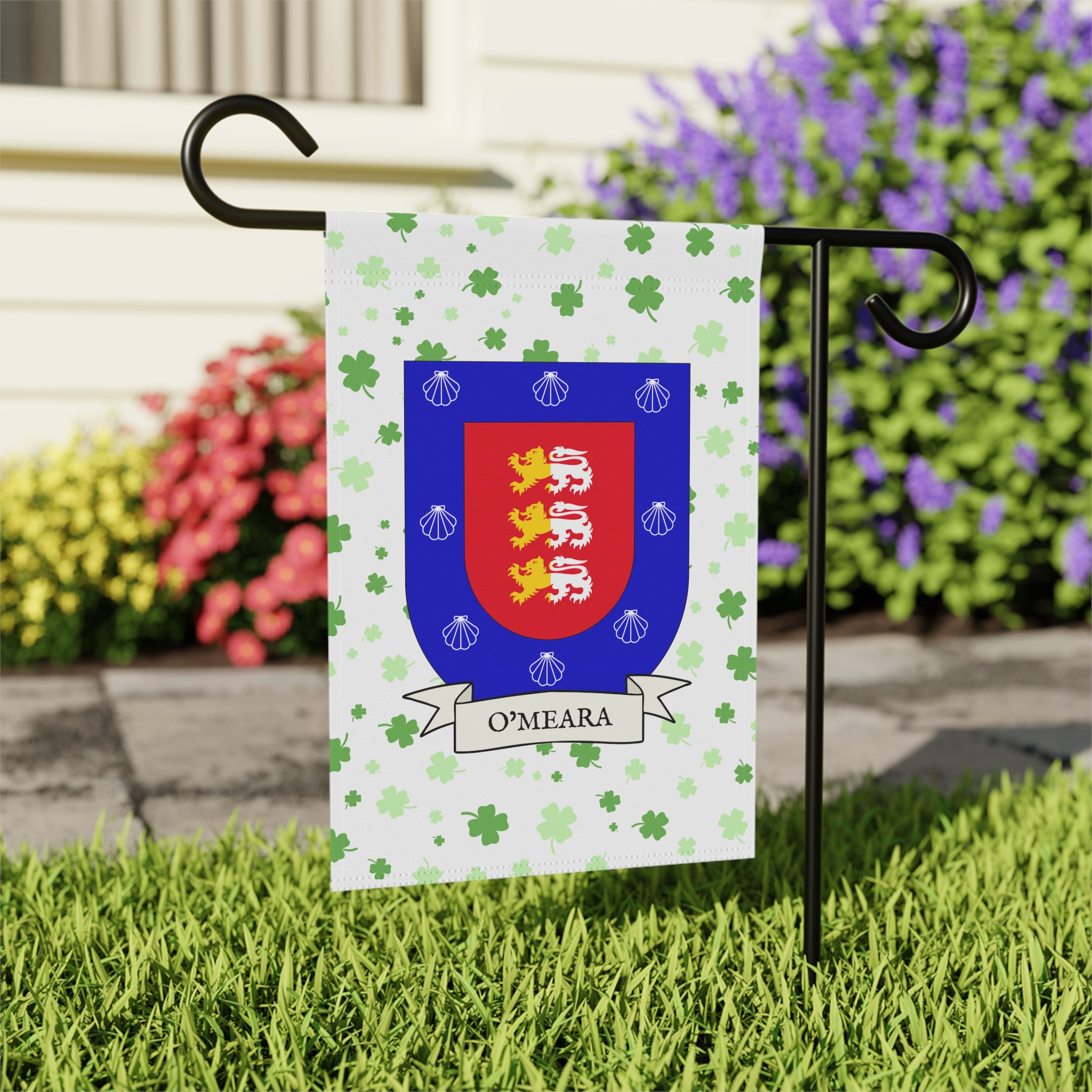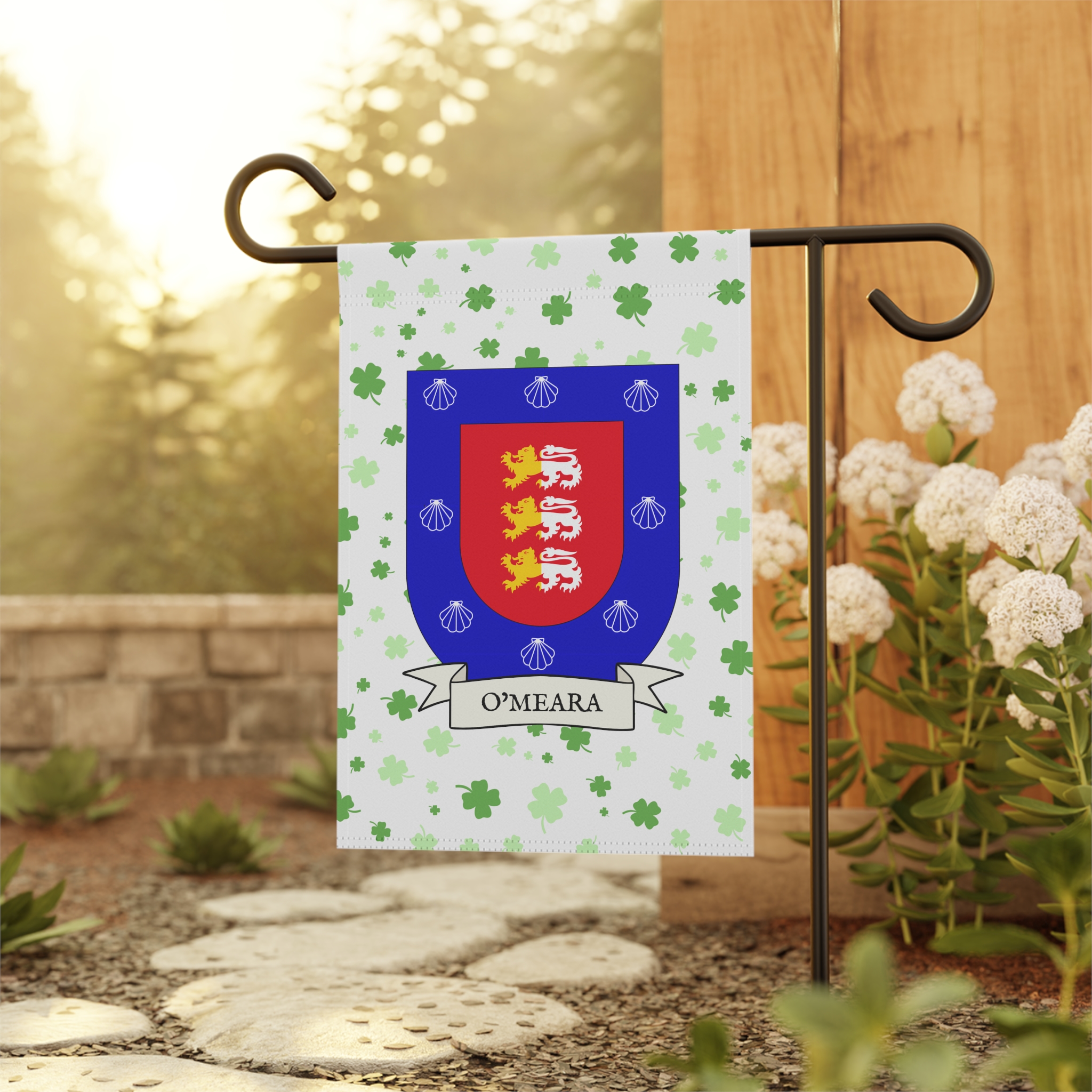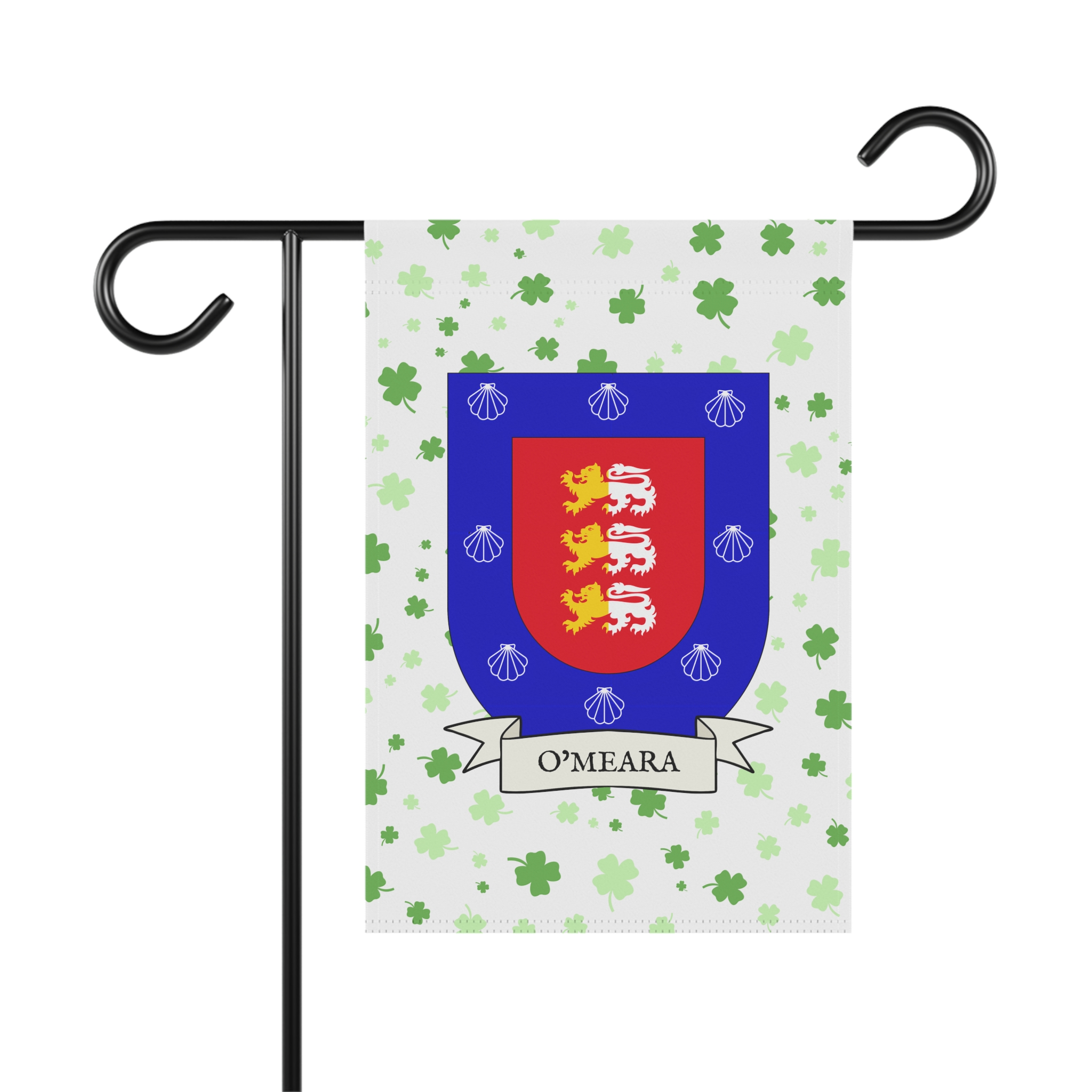 This welcoming Garden Banner will be a great addition to your garden or yard. It displays the O’Meara Family Coat of Arms over a subtle background showing a field of four-leaf shamrocks. Both sides show identical images.