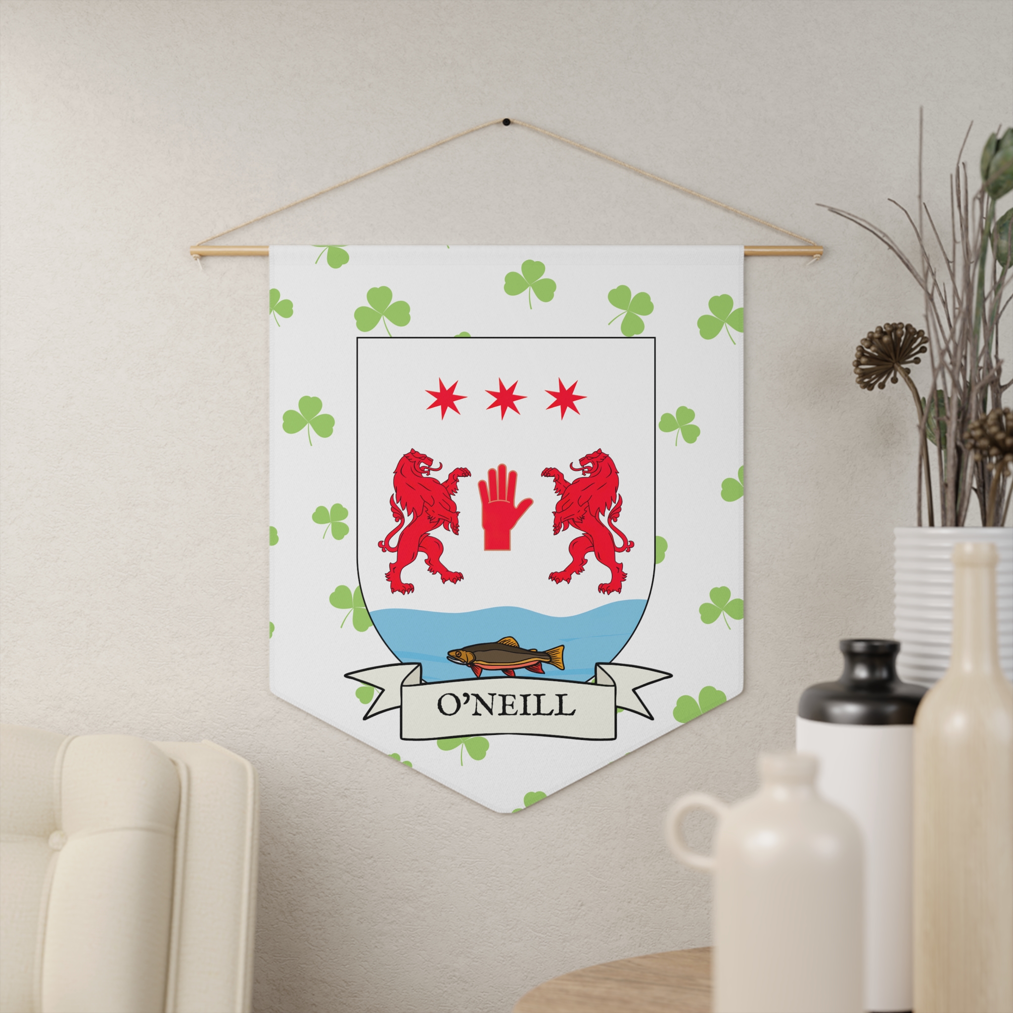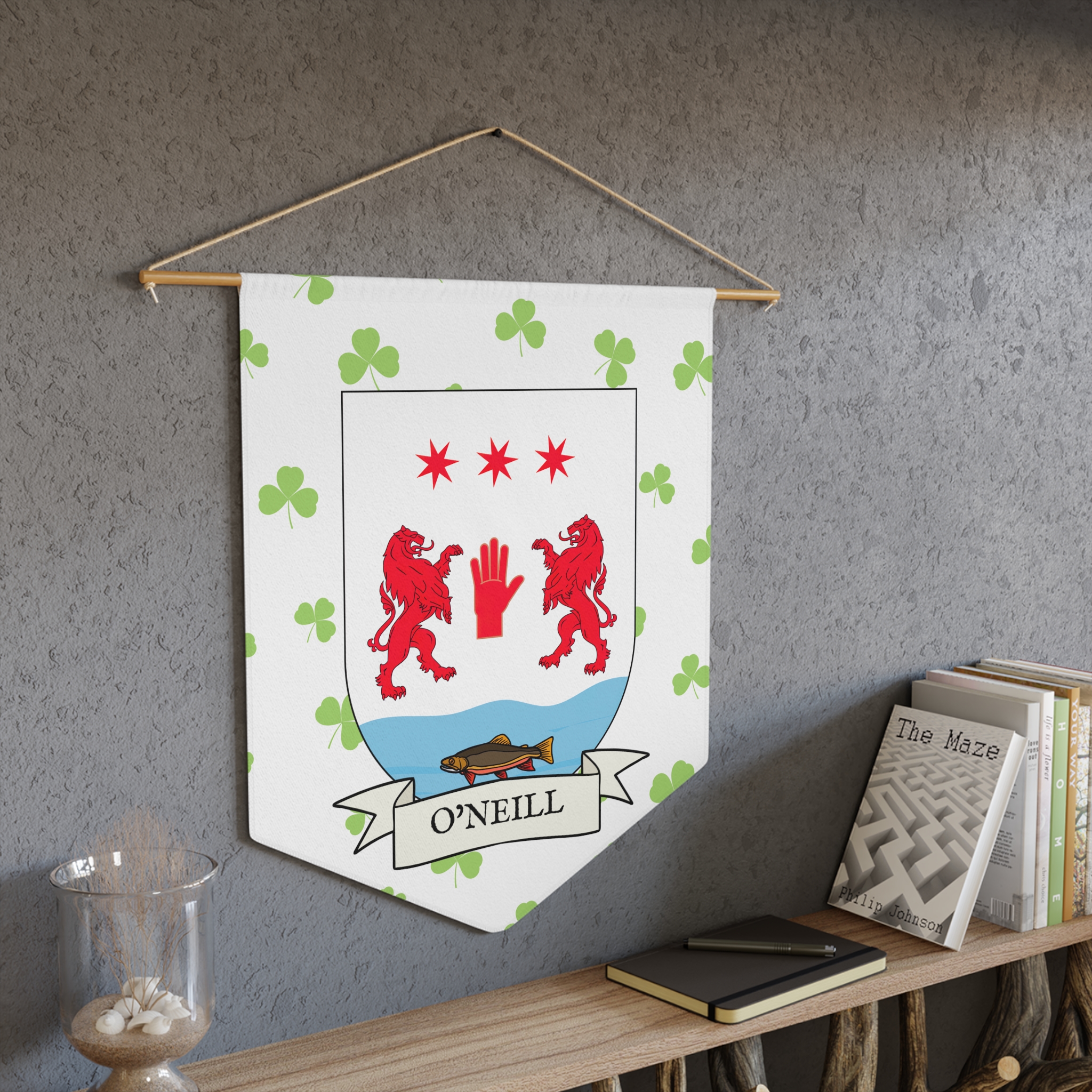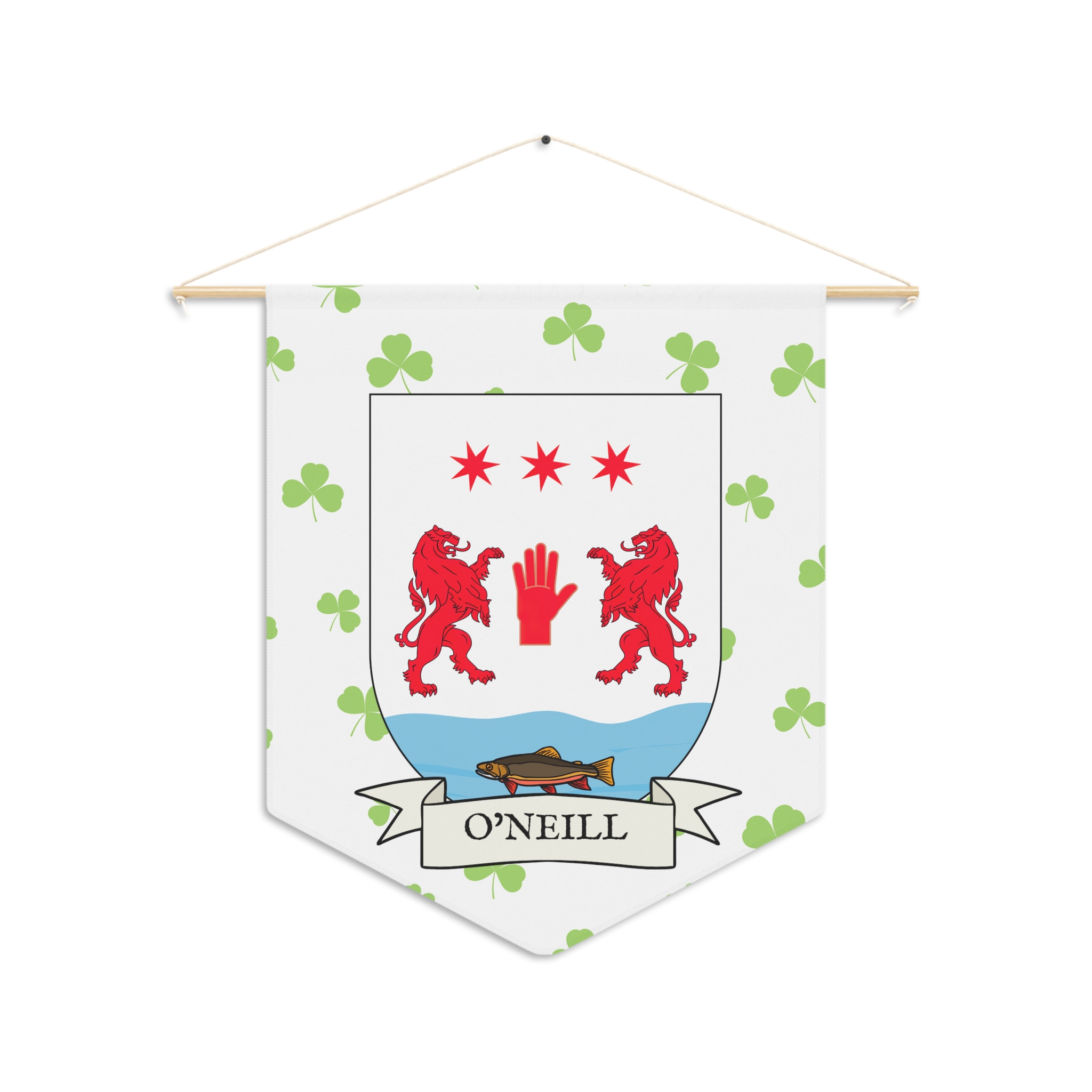 Uplift any room and show off your Irish American roots with this O’Neill Family Coat of Arms Indoor Pennant. Pennant is printed on durable poly twill and comes with a wooden dowel/twine frame for easy hanging. Features your family Coat of Arms printed over a restrained shamrock patterned background.