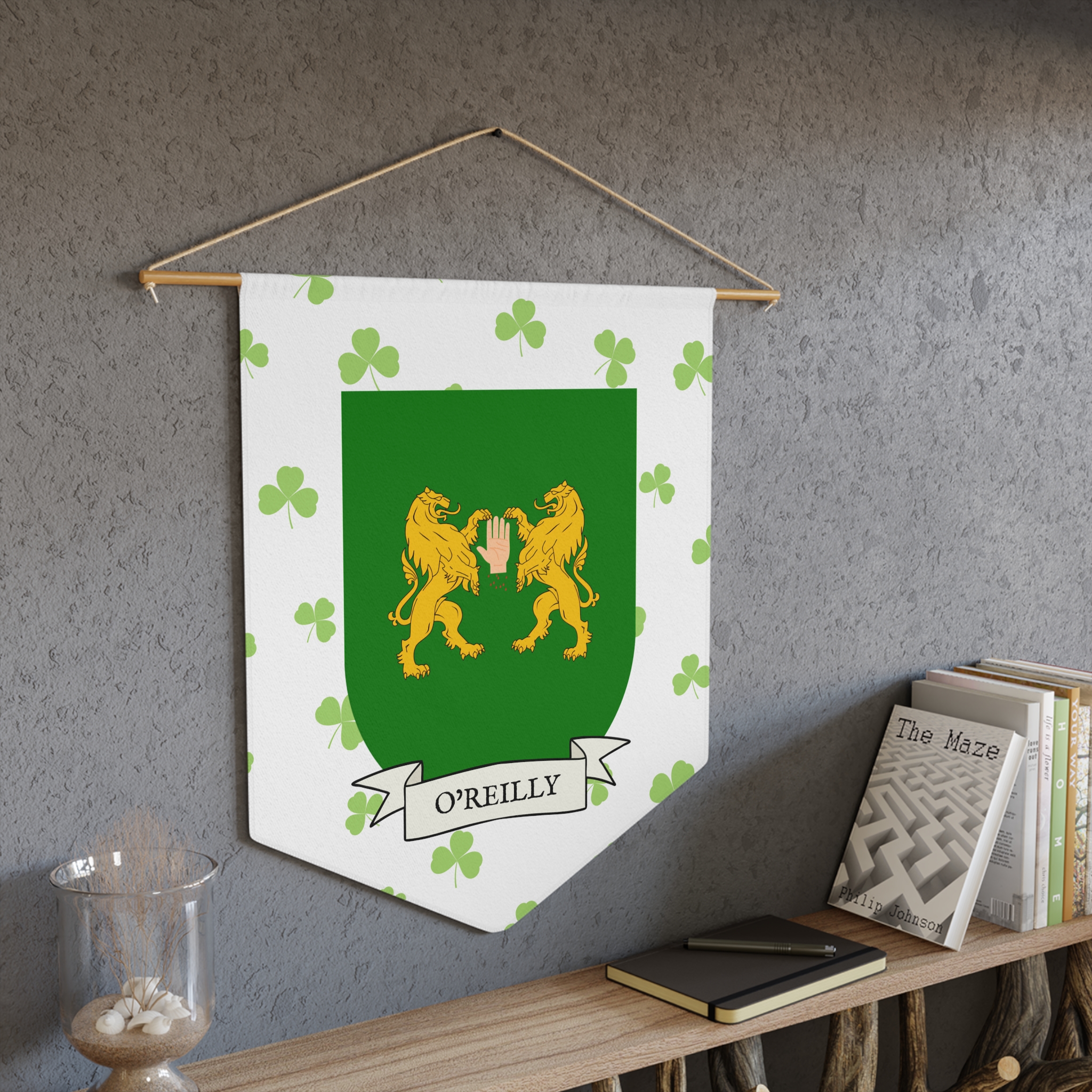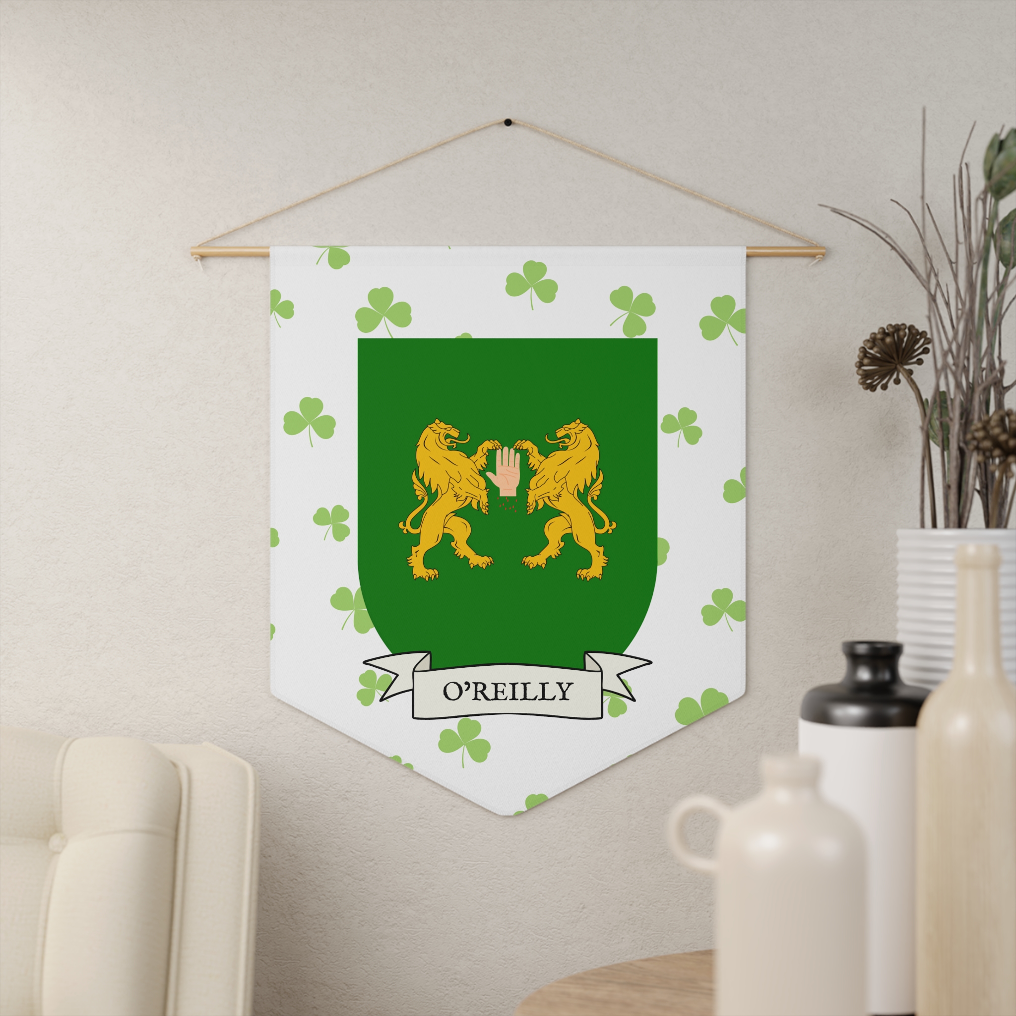 Uplift any room and show off your Irish American roots with this O’Reilly Family Coat of Arms Indoor Pennant. Pennant is printed on durable poly twill and comes with a wooden dowel/twine frame for easy hanging. Features your family Coat of Arms printed over a restrained shamrock patterned background.