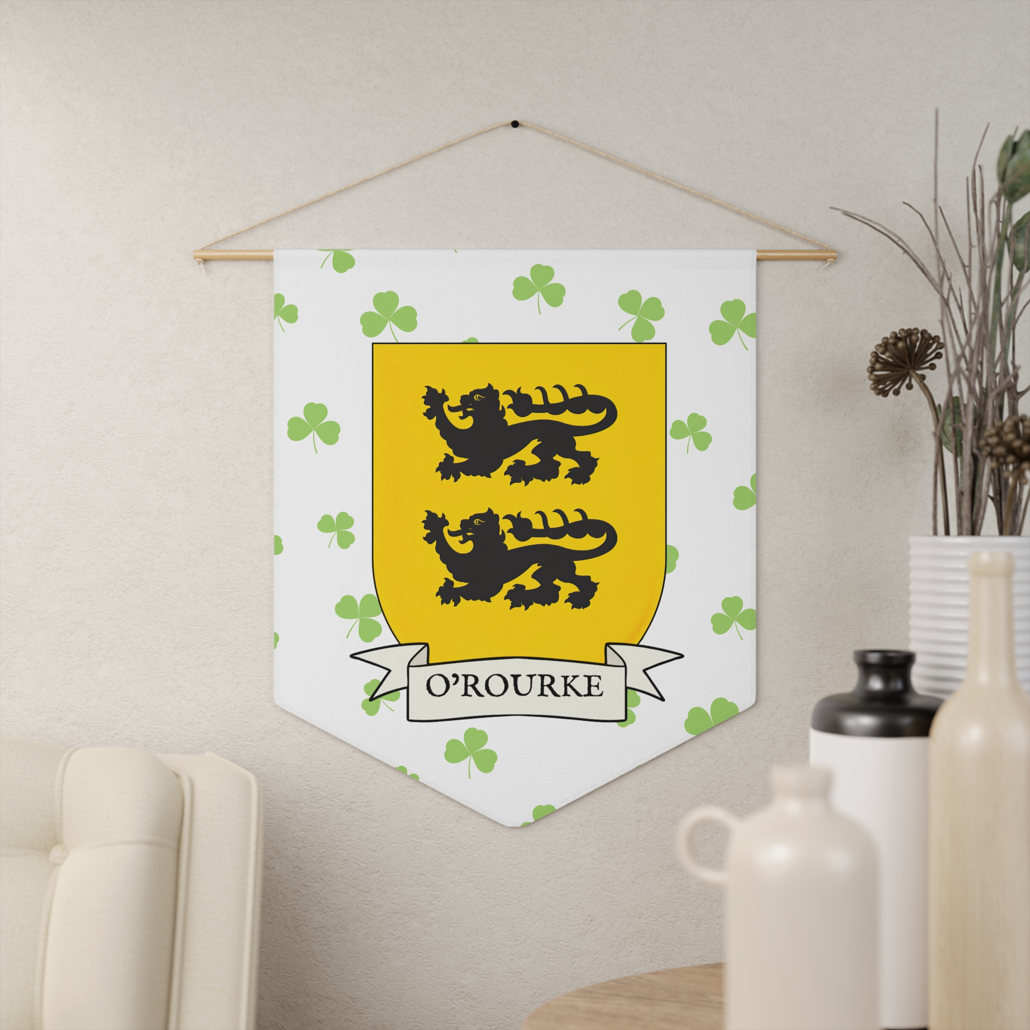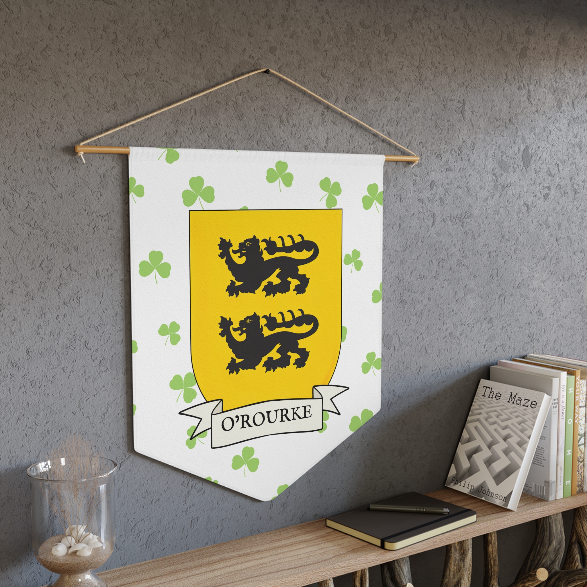 Uplift any room and show off your Irish American roots with this O’Rourke Family Coat of Arms Indoor Pennant. Pennant is printed on durable poly twill and comes with a wooden dowel/twine frame for easy hanging. Features your family Coat of Arms printed over a restrained shamrock patterned background.