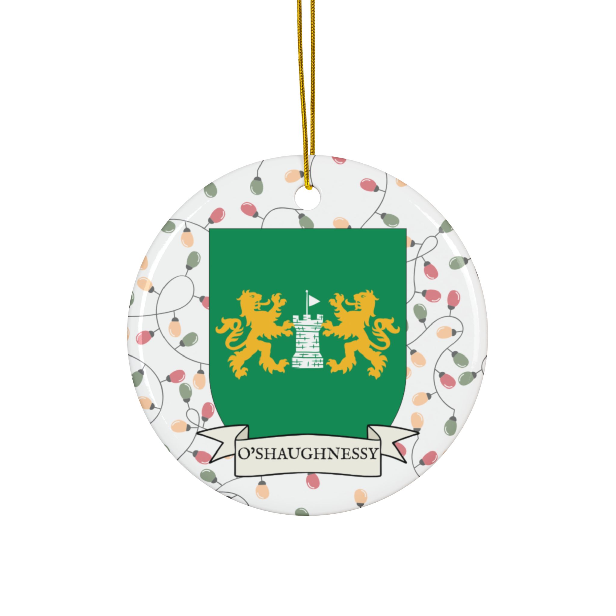 Celebrate the Holidays (and your Irish Heritage) with Irish Family Coat of Arms Christmas Tree Ornaments! Your family’s coat of arms printed on a 100% ceramic ornament with a festive Christmas Tree lights background. Great gift idea for the Irish Americans in your life. It’s sure to become a Christmas tradition!