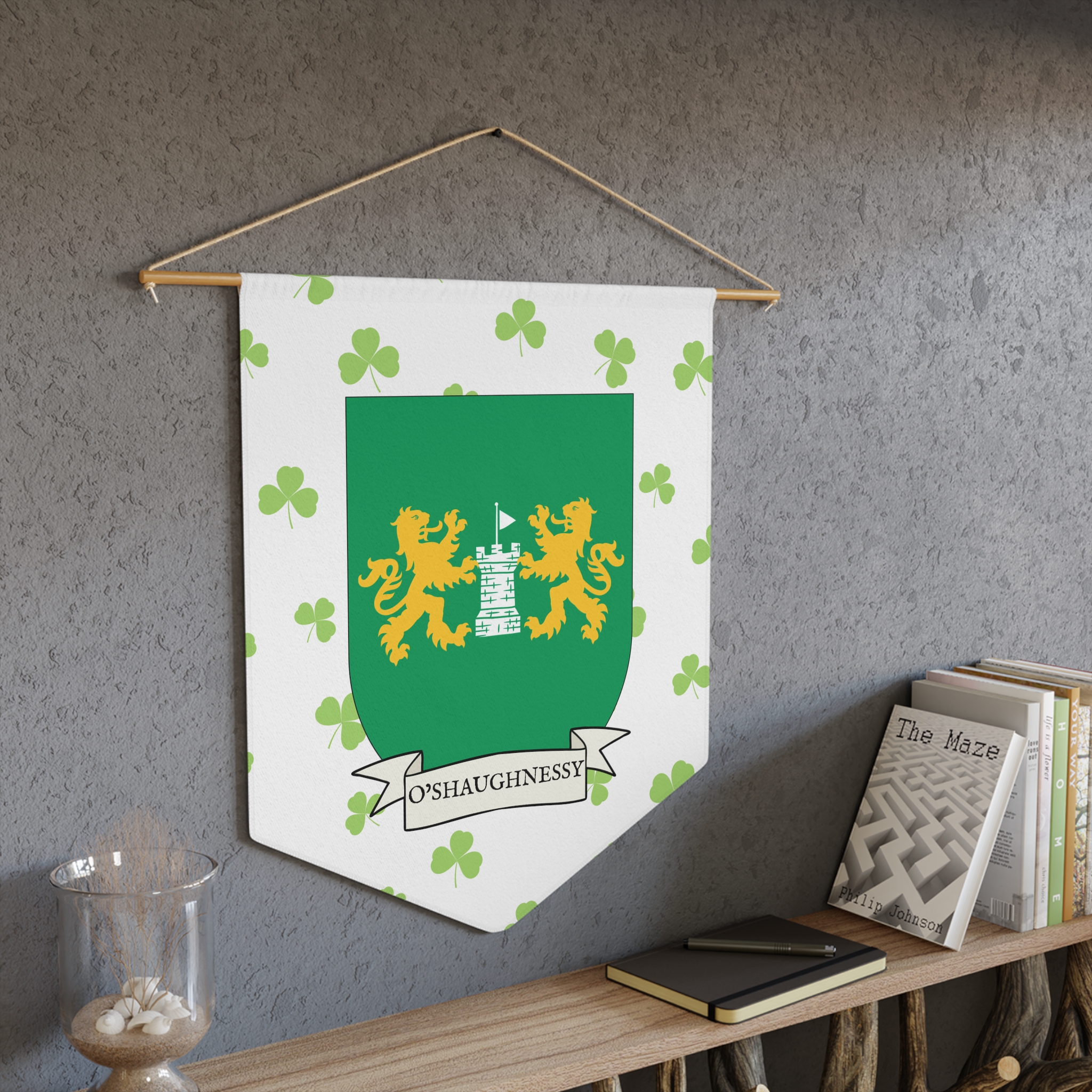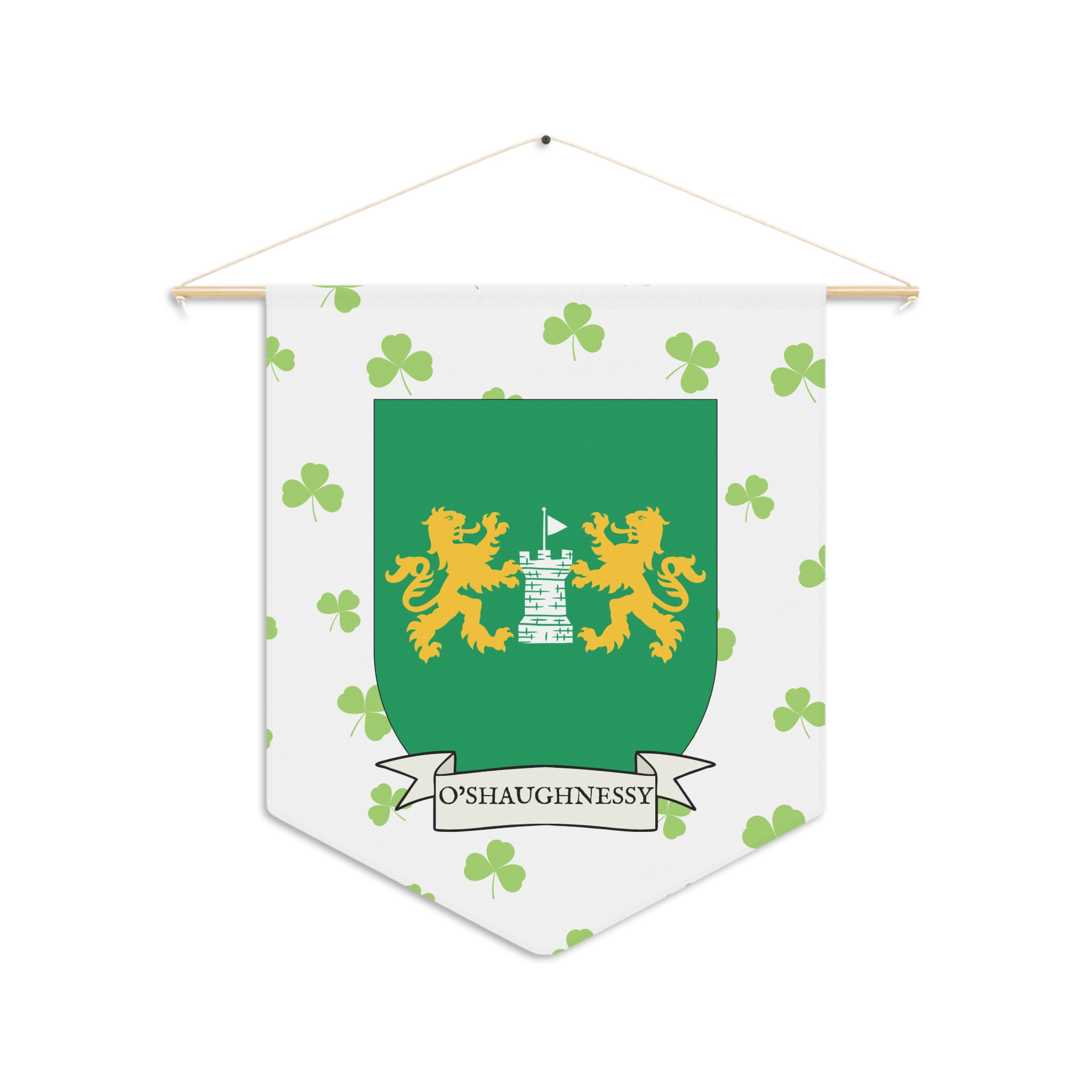 Uplift any room and show off your Irish American roots with this O’Shaughnessy Family Coat of Arms Indoor Pennant. Pennant is printed on durable poly twill and comes with a wooden dowel/twine frame for easy hanging. Features your family Coat of Arms printed over a restrained shamrock patterned background.