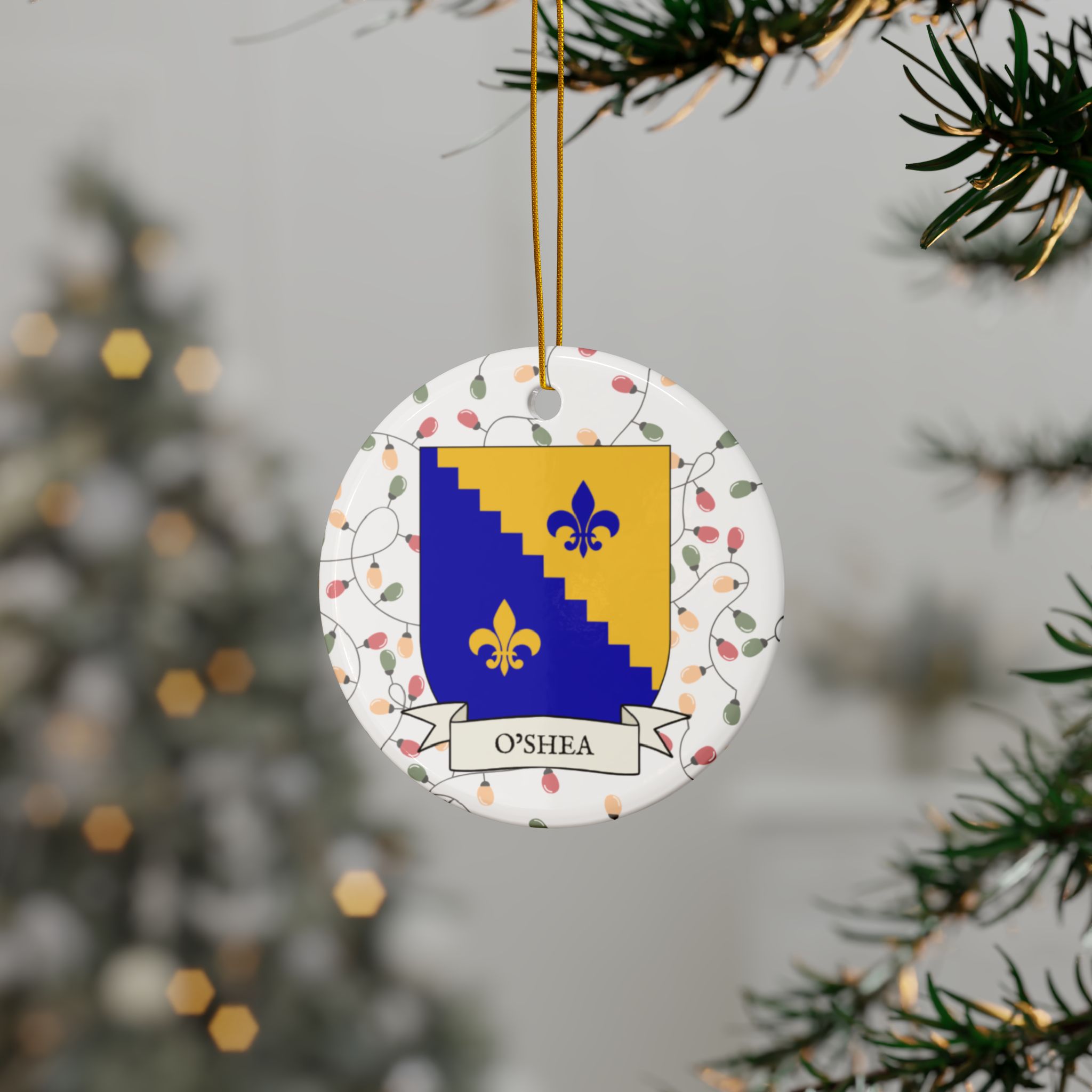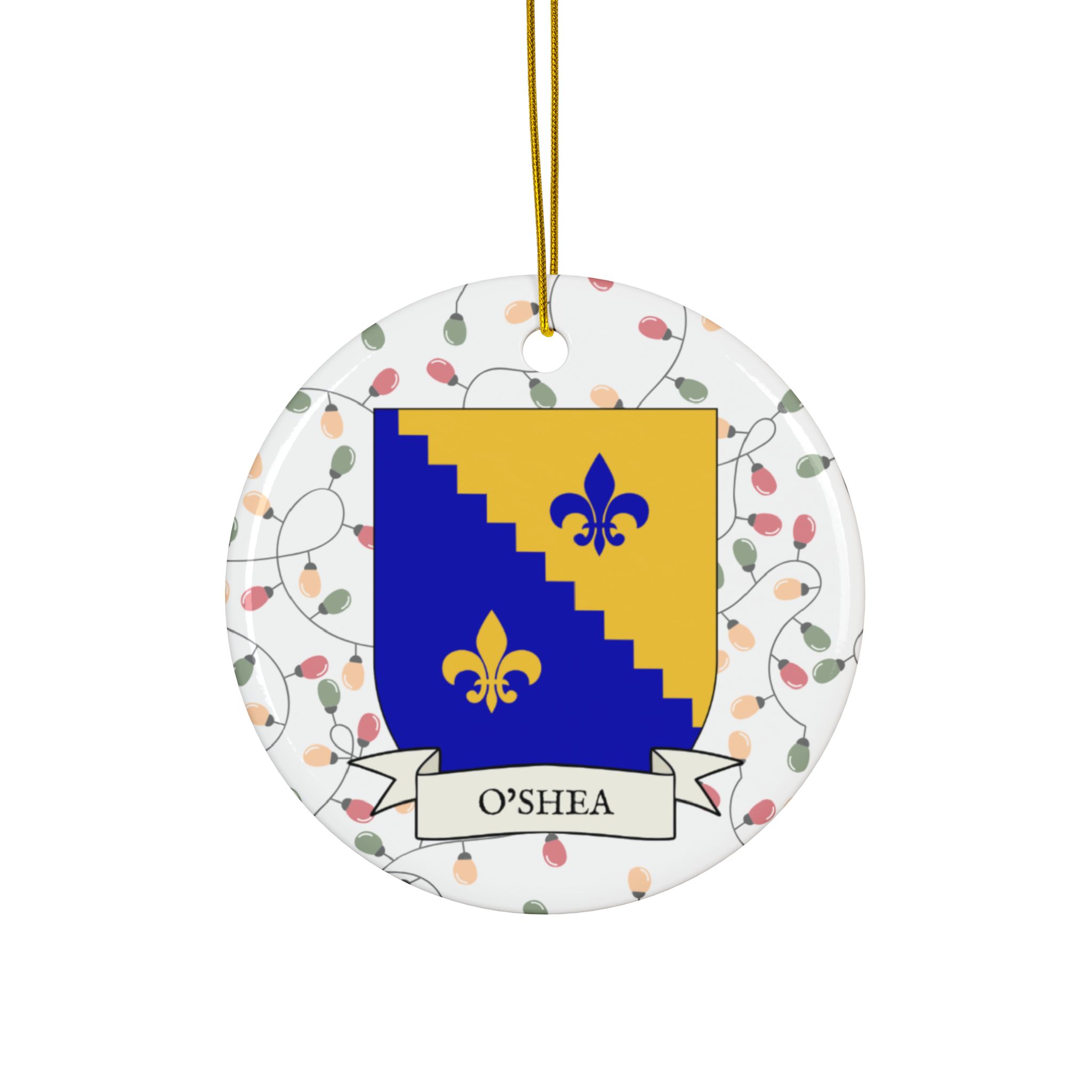 Celebrate the Holidays (and your Irish Heritage) with Irish Family Coat of Arms Christmas Tree Ornaments! Your family’s coat of arms printed on a 100% ceramic ornament with a festive Christmas Tree lights background. Great gift idea for the Irish Americans in your life. It’s sure to become a Christmas tradition!