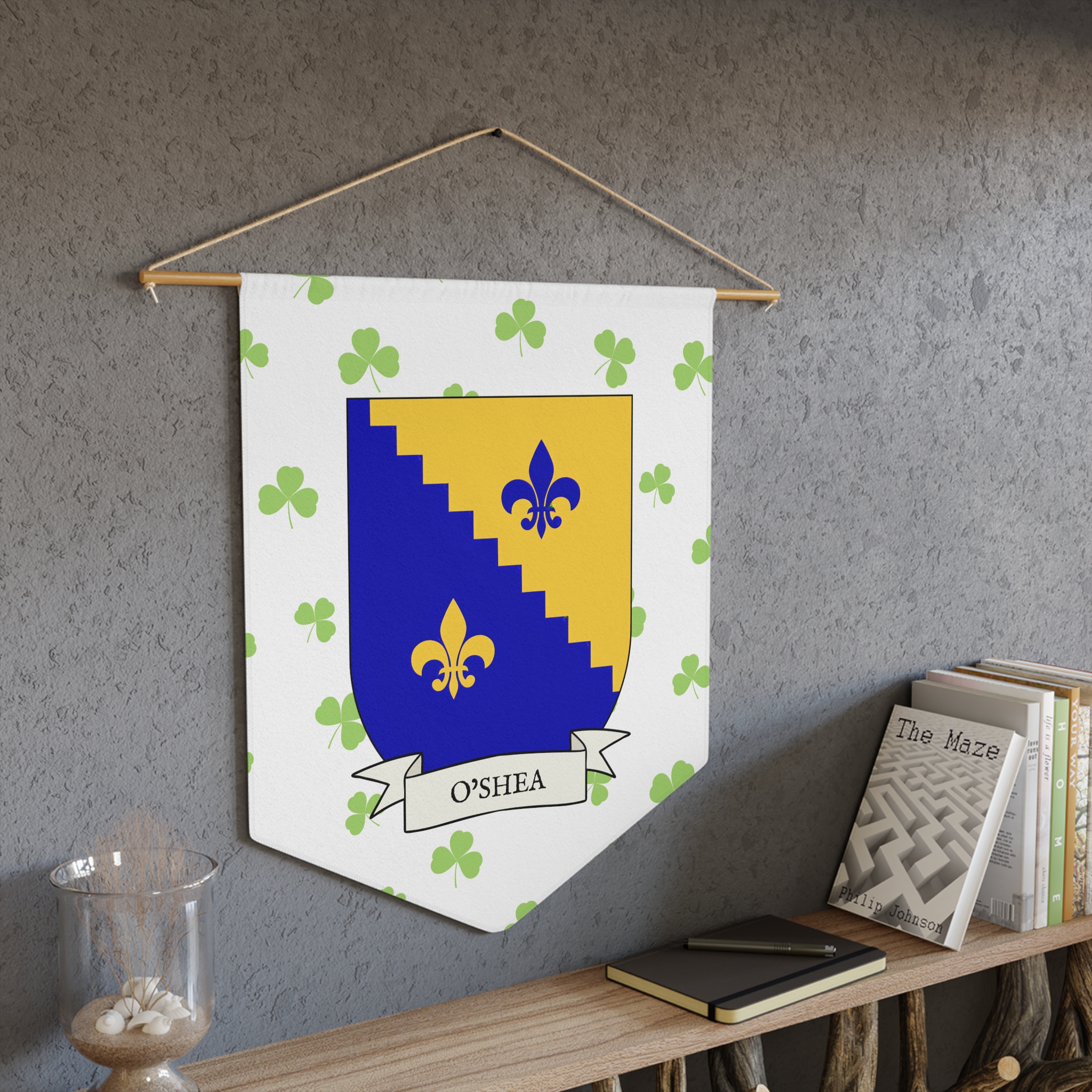 Uplift any room and show off your Irish American roots with this O’Shea Family Coat of Arms Indoor Pennant. Pennant is printed on durable poly twill and comes with a wooden dowel/twine frame for easy hanging. Features your family Coat of Arms printed over a restrained shamrock patterned background.