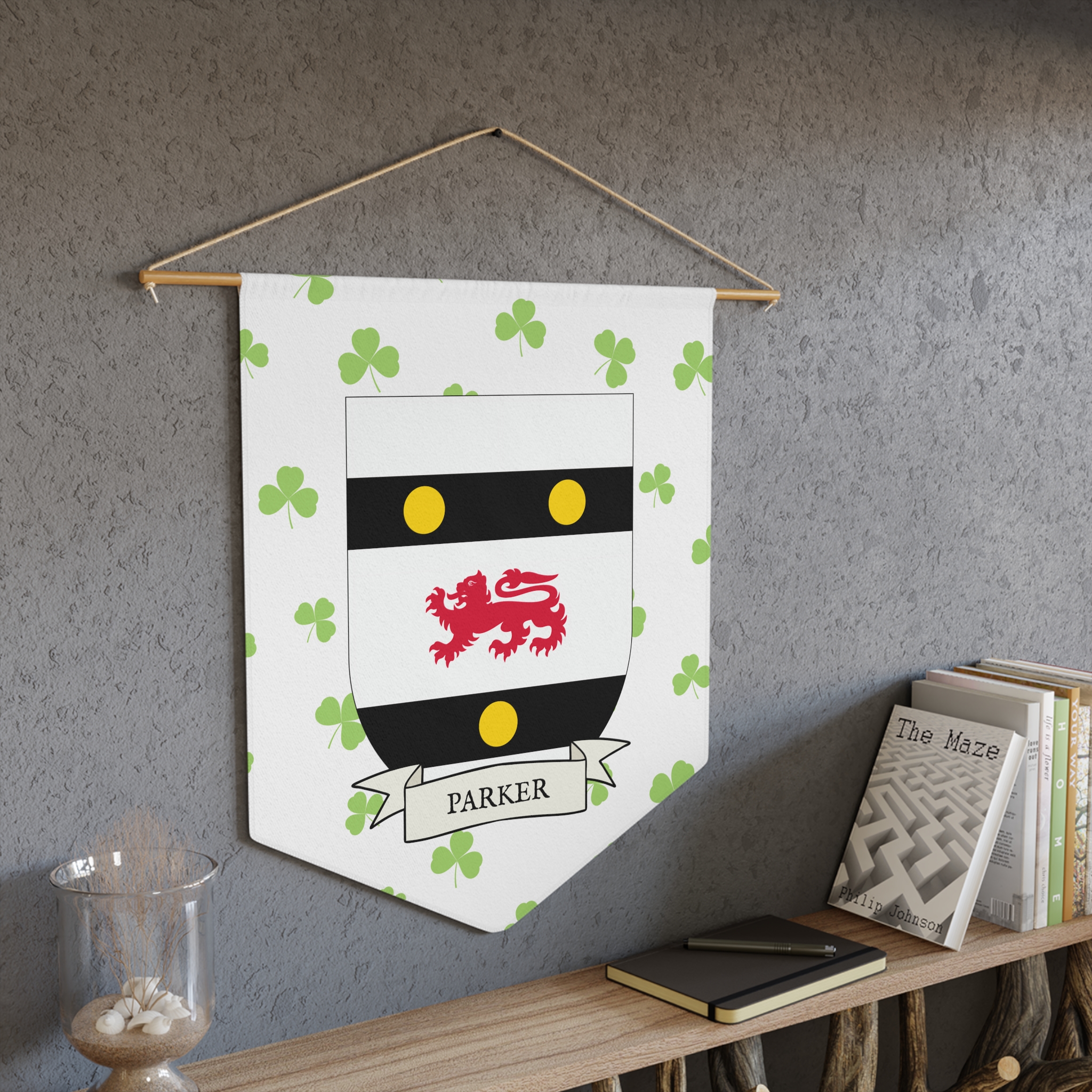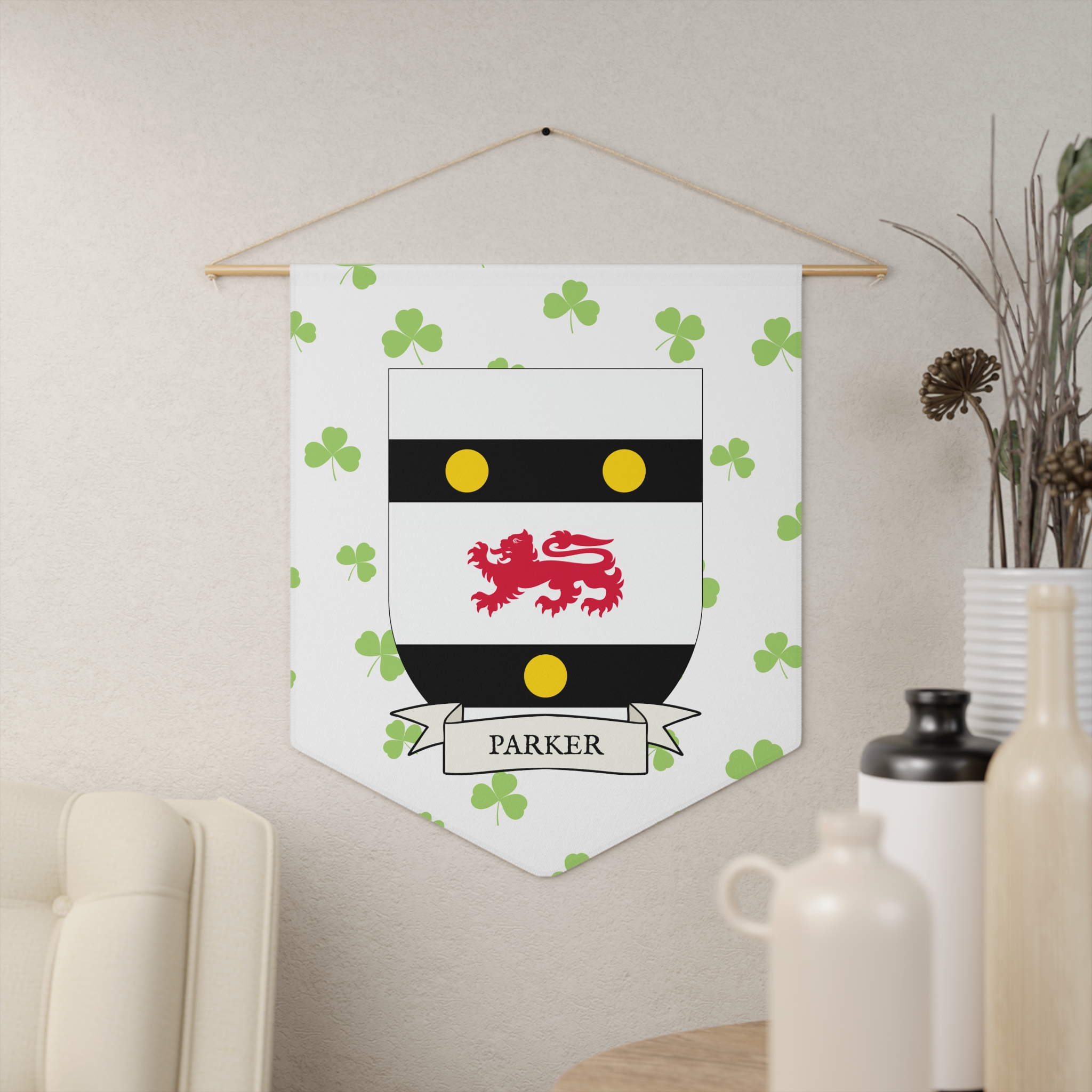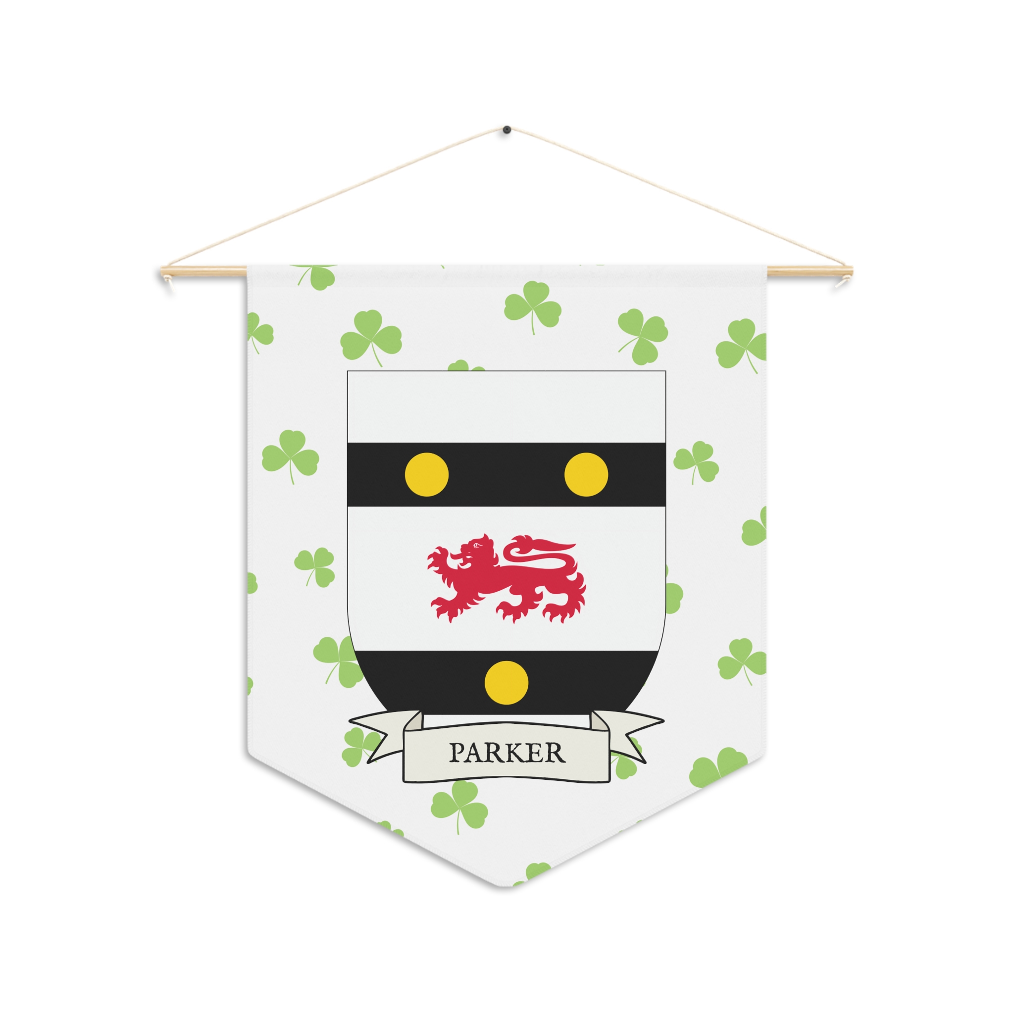 Uplift any room and show off your Irish American roots with this Parker Family Coat of Arms Indoor Pennant. Pennant is printed on durable poly twill and comes with a wooden dowel/twine frame for easy hanging. Features your family Coat of Arms printed over a restrained shamrock patterned background.