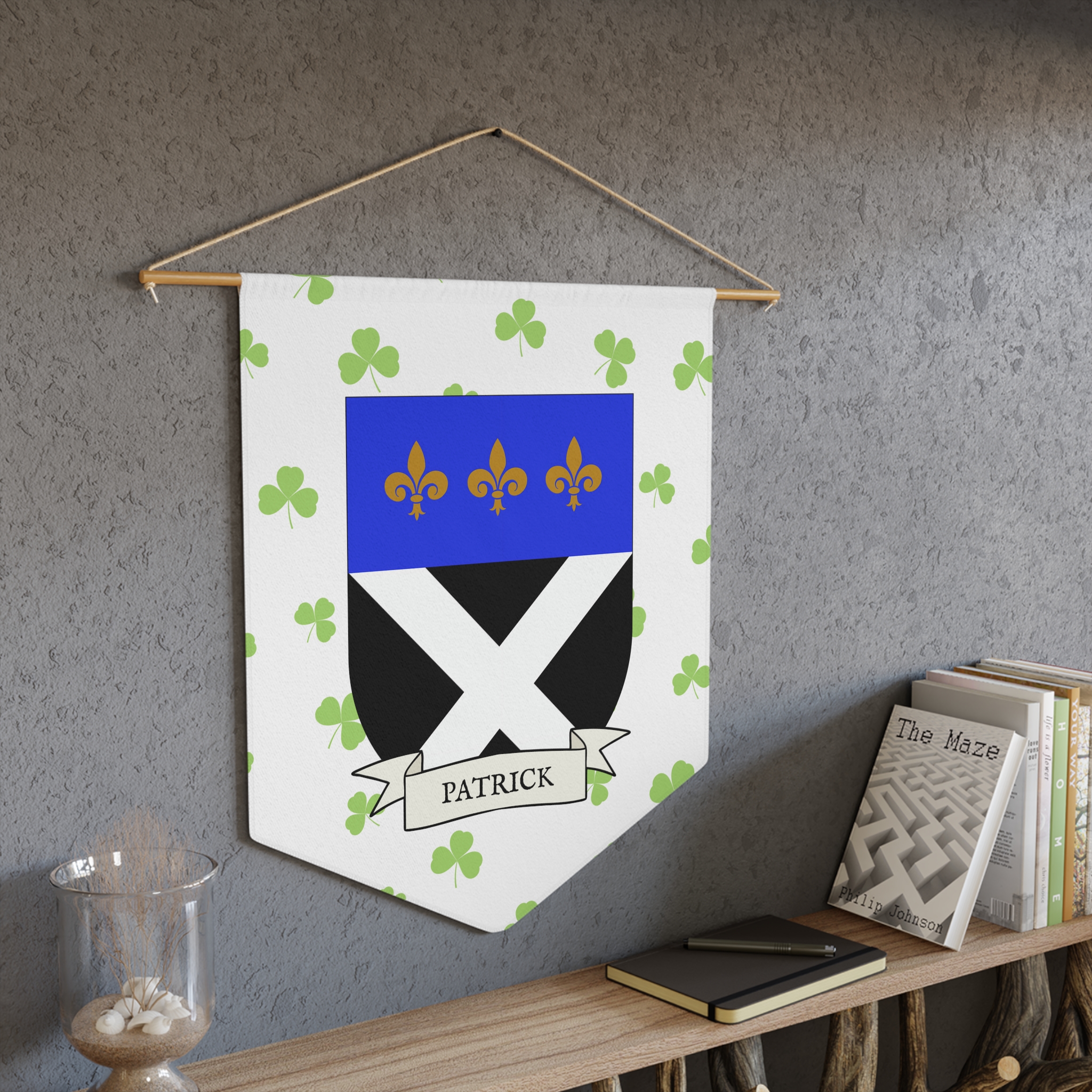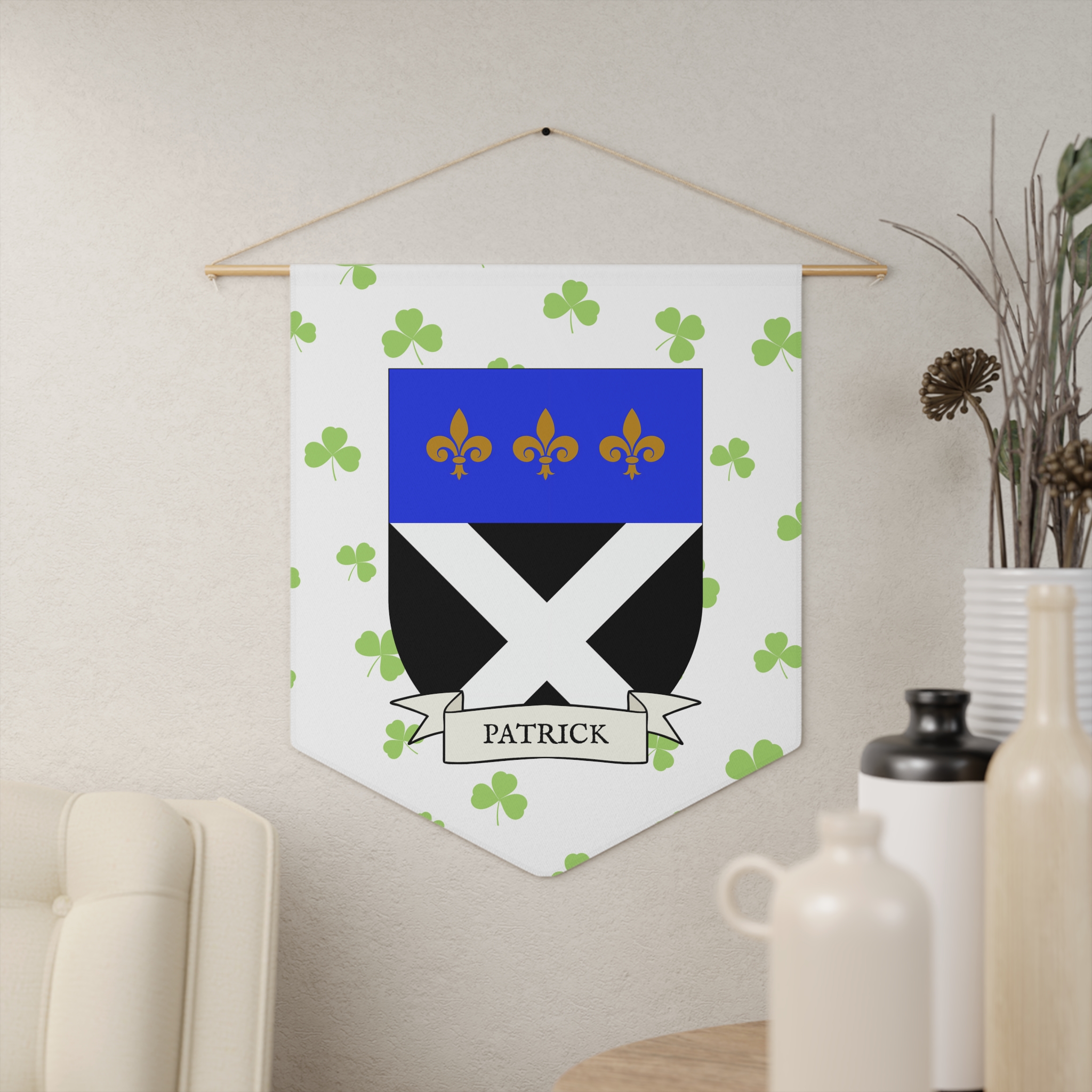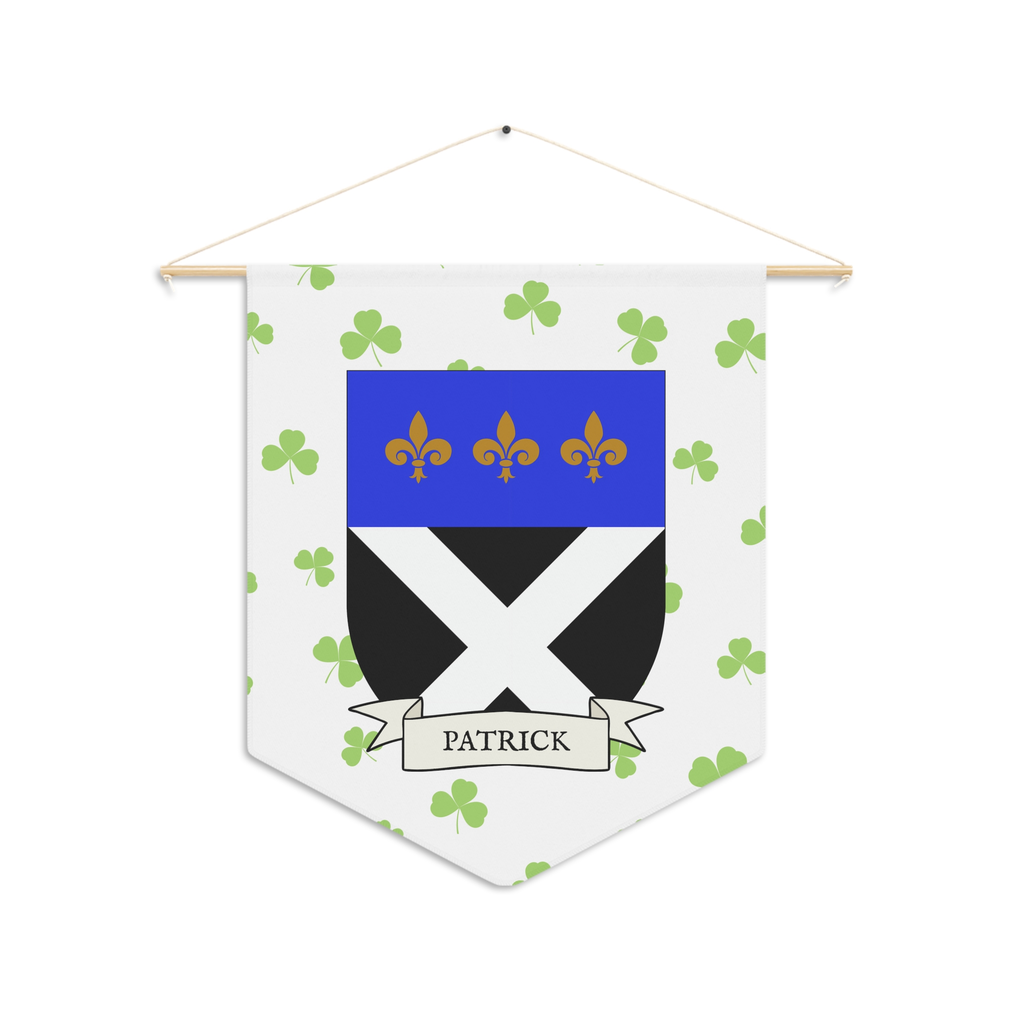 Uplift any room and show off your Irish American roots with this Patrick Family Coat of Arms Indoor Pennant. Pennant is printed on durable poly twill and comes with a wooden dowel/twine frame for easy hanging. Features your family Coat of Arms printed over a restrained shamrock patterned background.