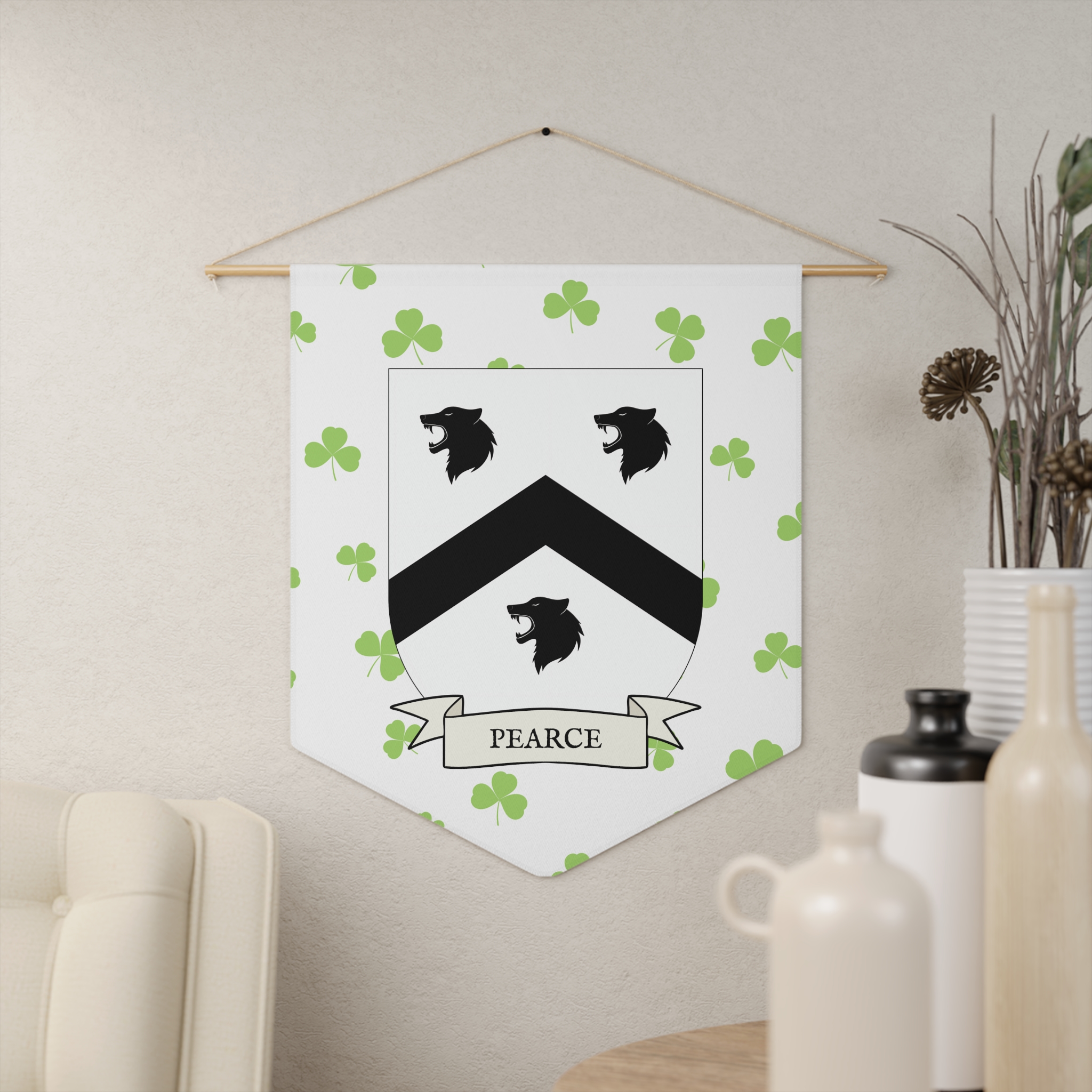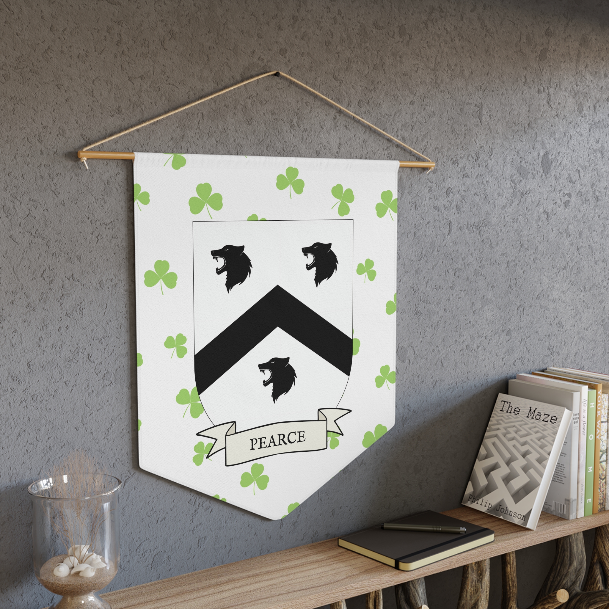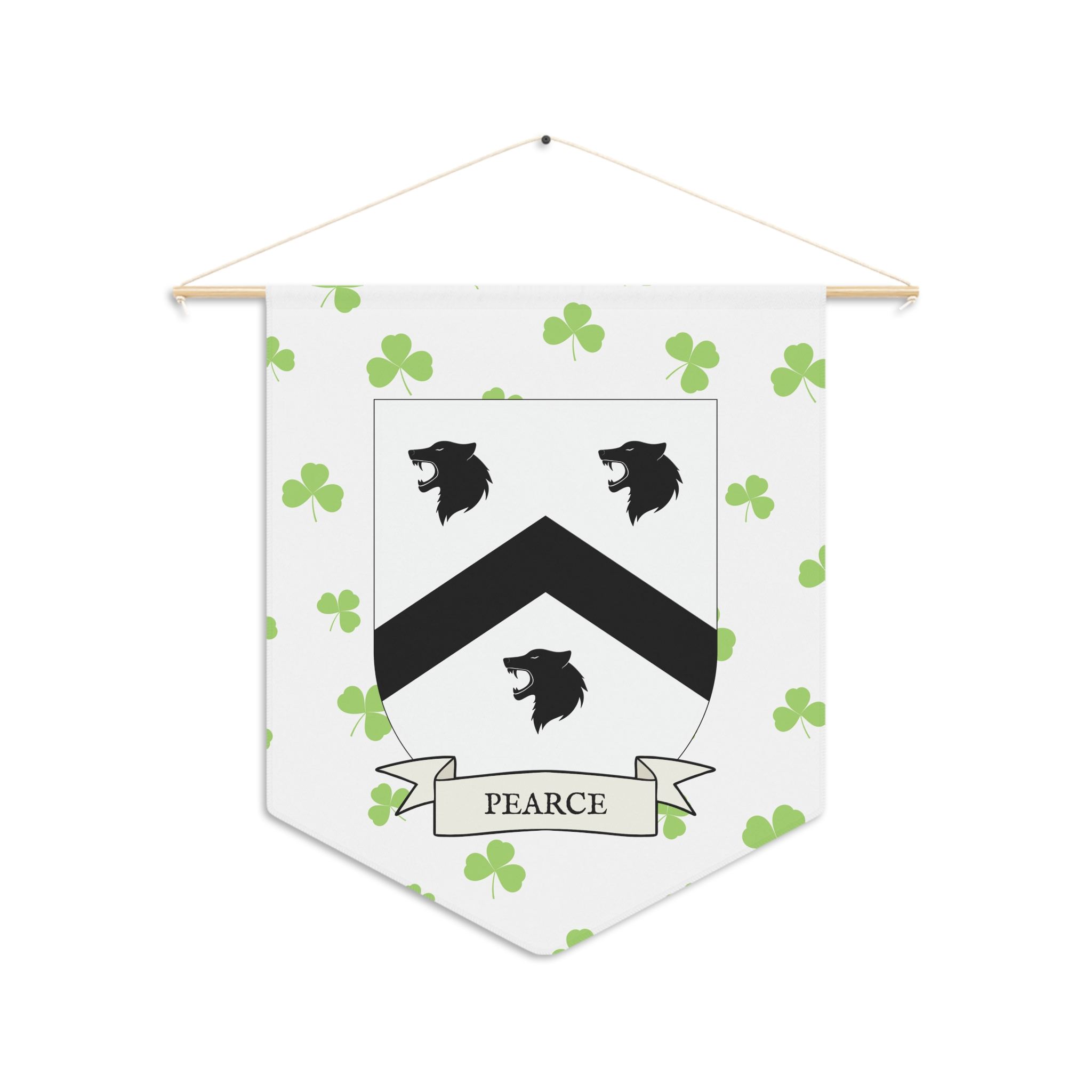 Uplift any room and show off your Irish American roots with this Pearce Family Coat of Arms Indoor Pennant. Pennant is printed on durable poly twill and comes with a wooden dowel/twine frame for easy hanging. Features your family Coat of Arms printed over a restrained shamrock patterned background.