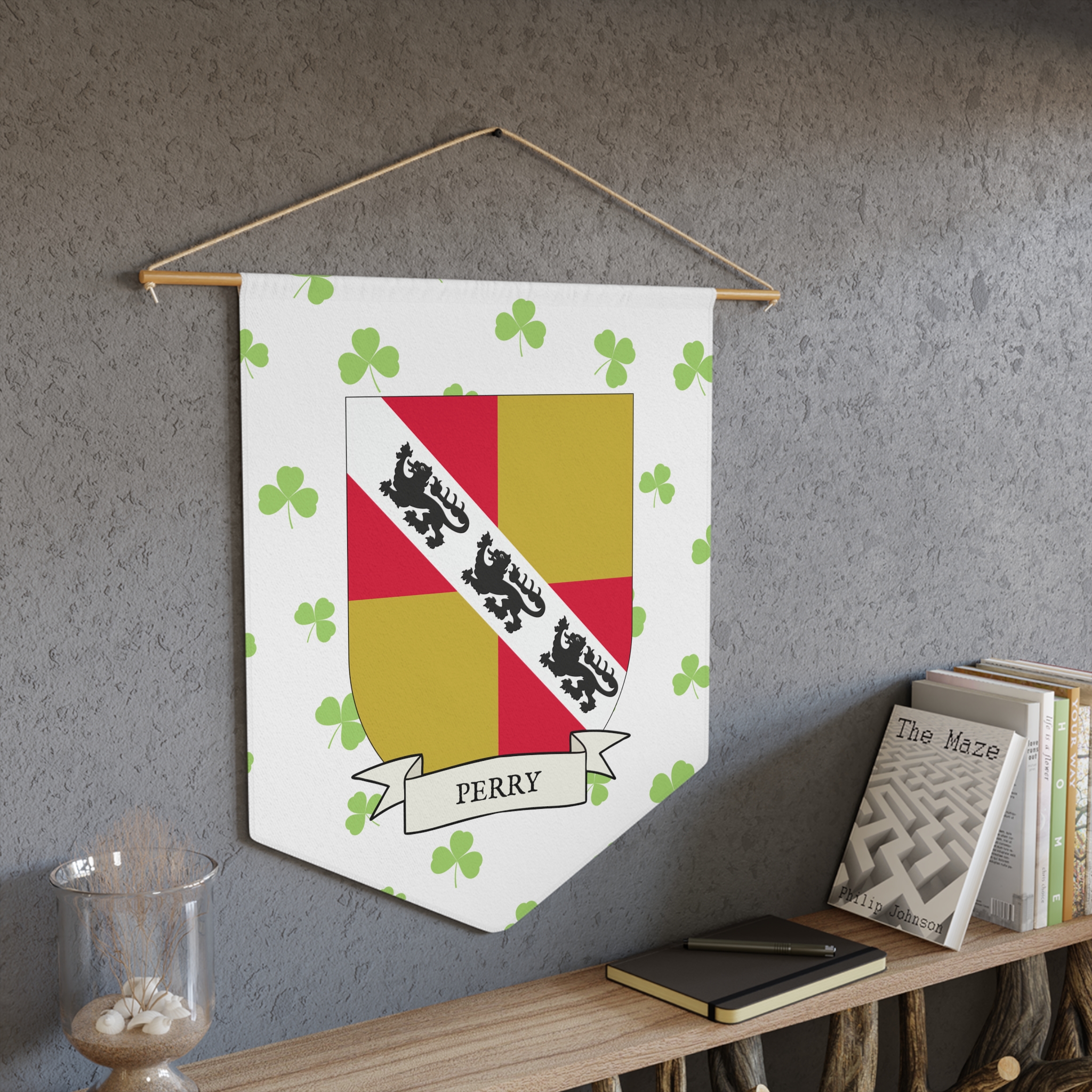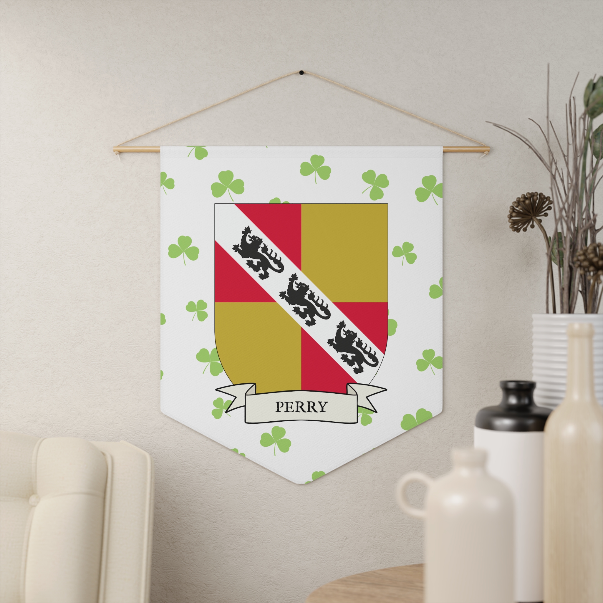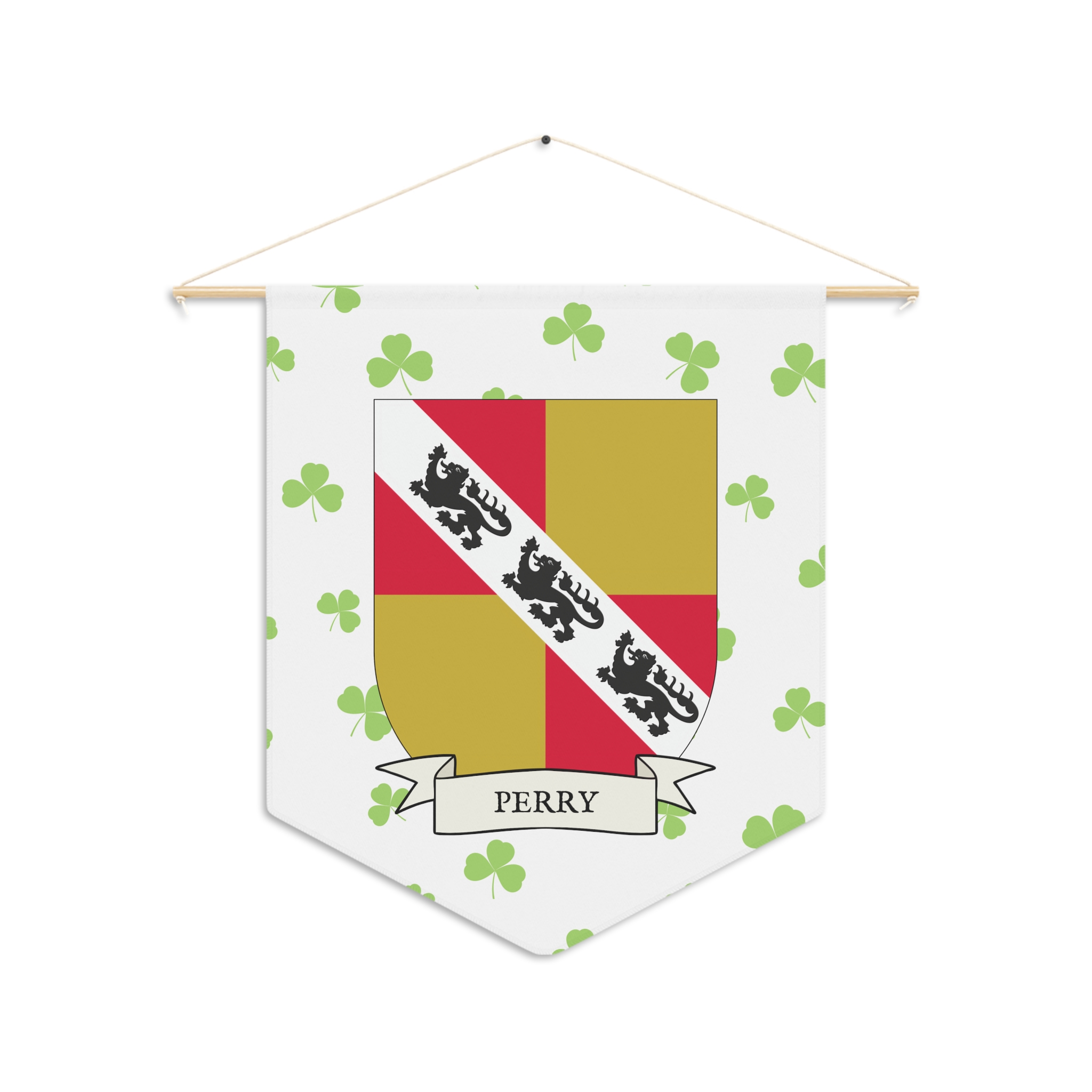 Uplift any room and show off your Irish American roots with this Perry Family Coat of Arms Indoor Pennant. Pennant is printed on durable poly twill and comes with a wooden dowel/twine frame for easy hanging. Features your family Coat of Arms printed over a restrained shamrock patterned background.