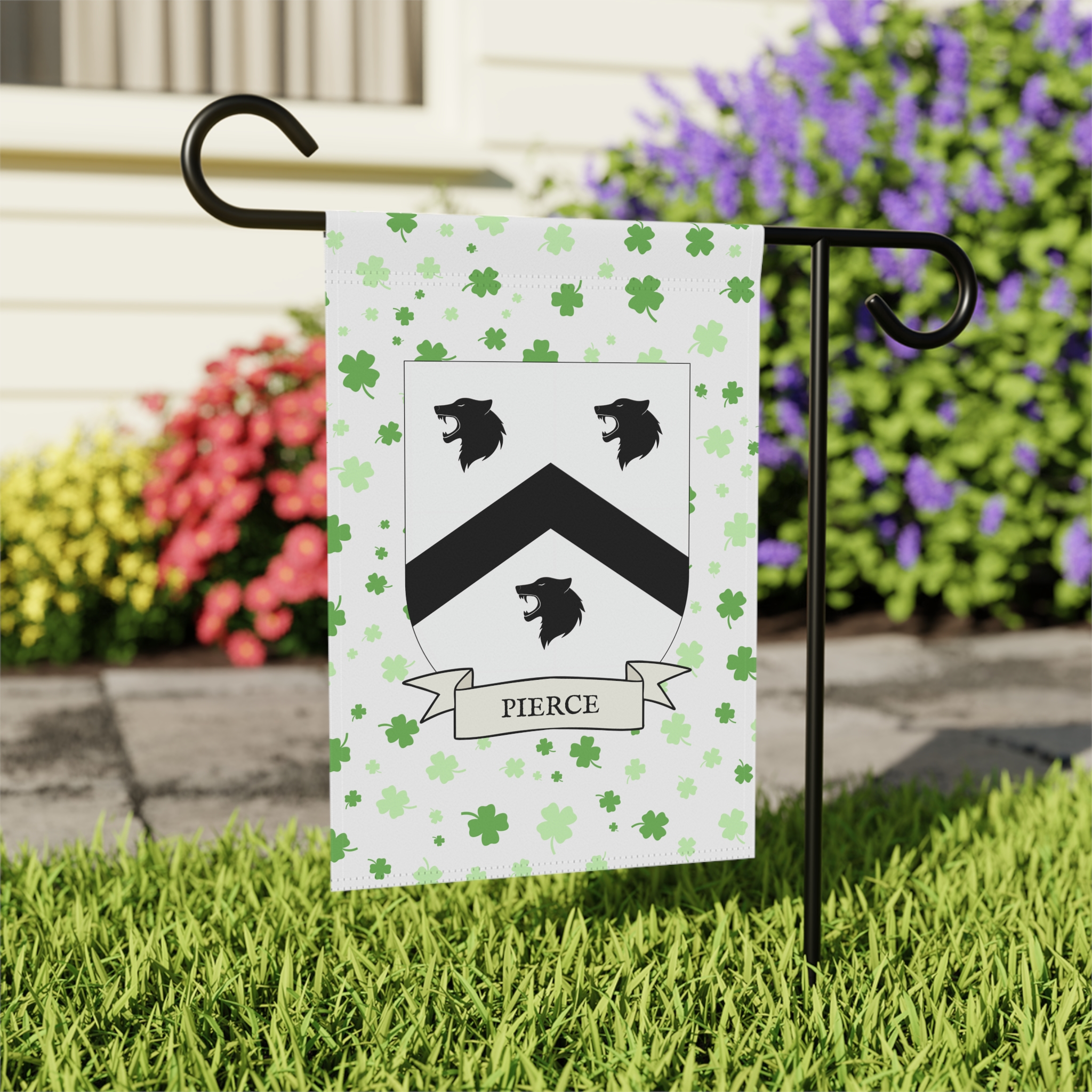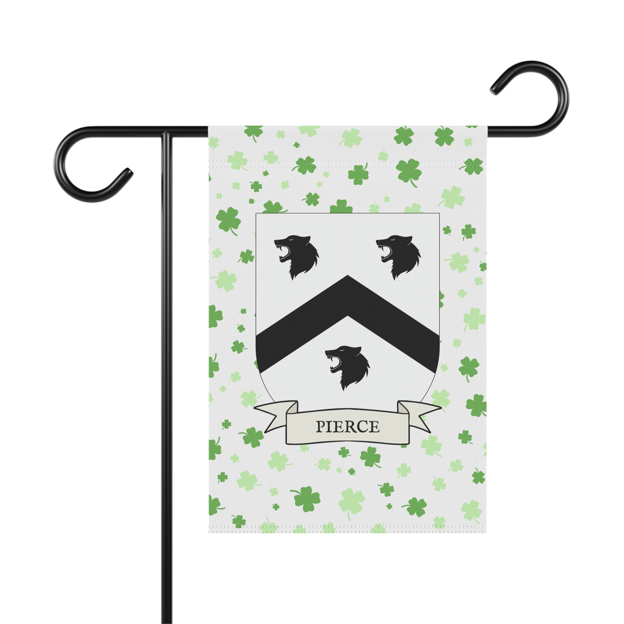 This welcoming Garden Banner will be a great addition to your garden or yard. It displays the Pierce Family Coat of Arms over a subtle background showing a field of four-leaf shamrocks. Both sides show identical images.