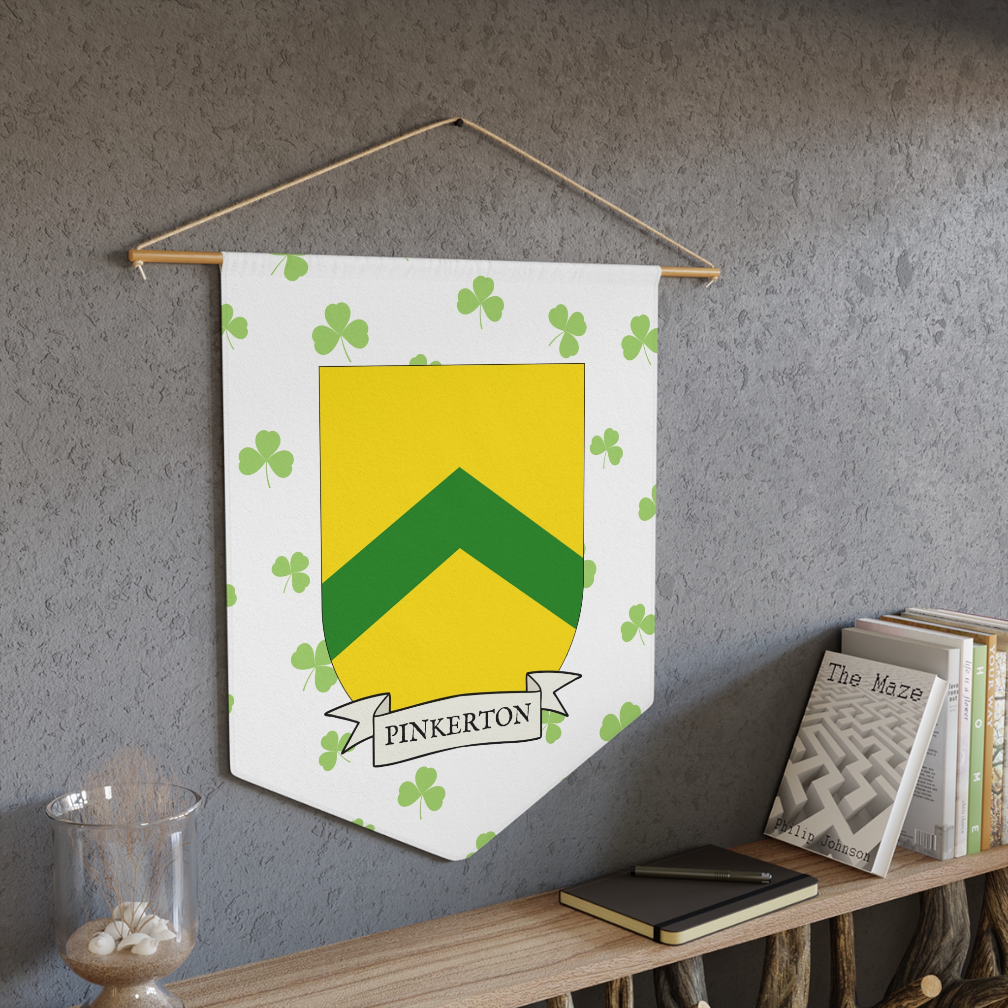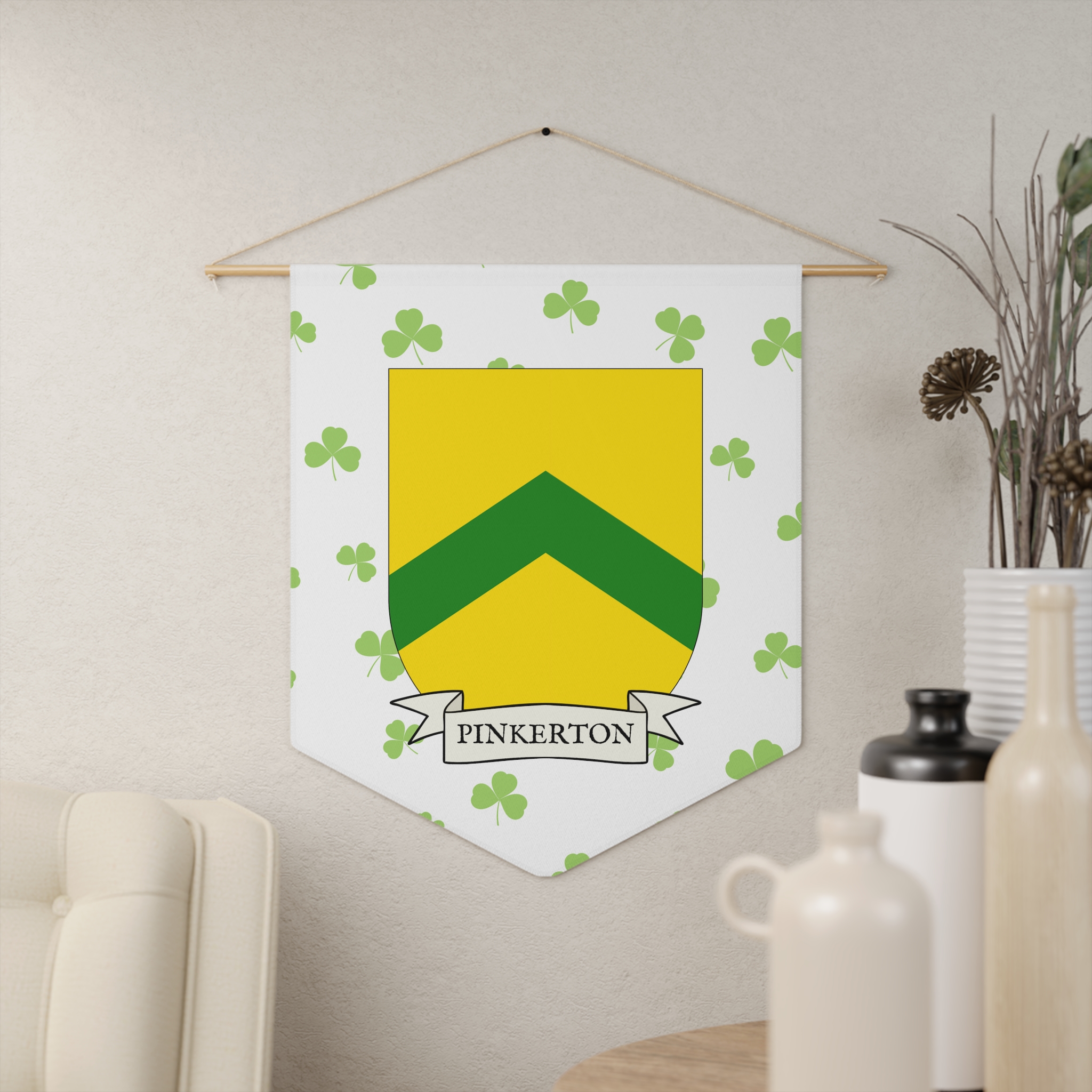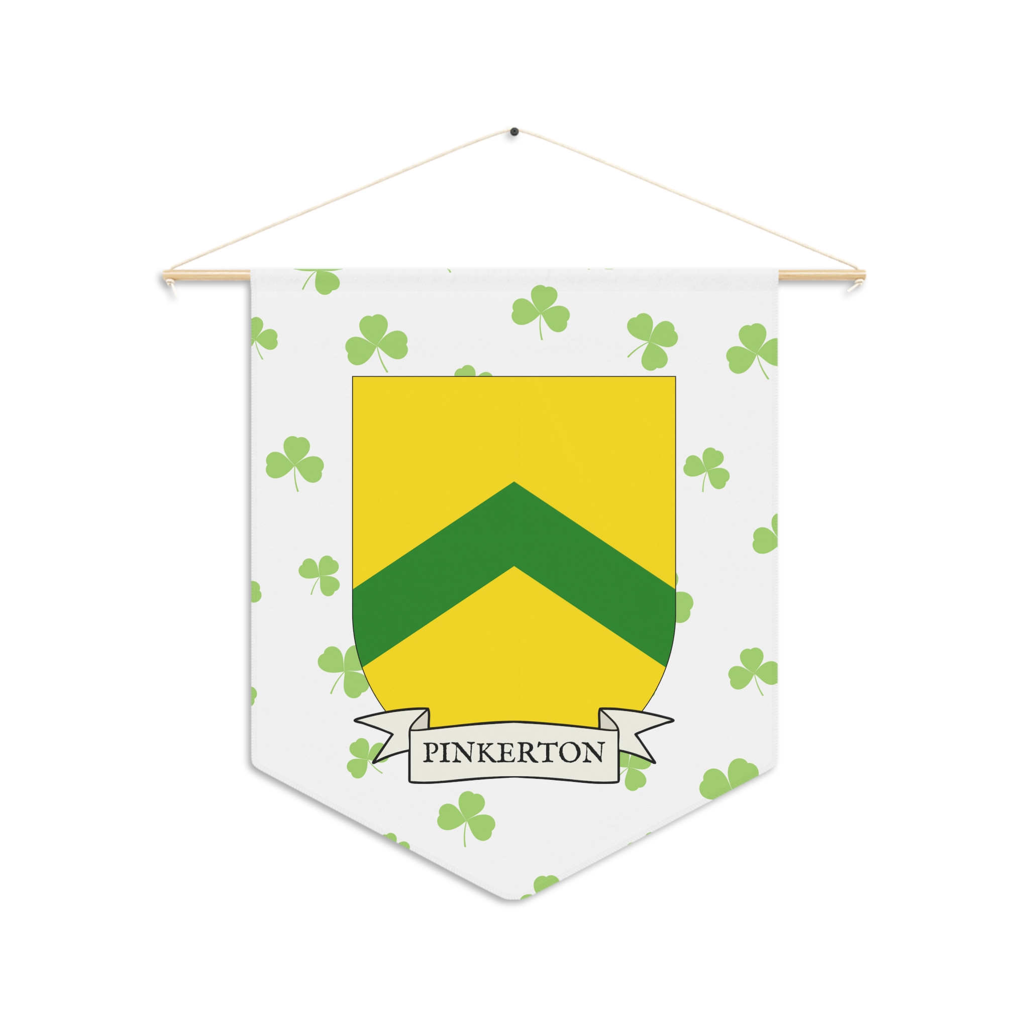 Uplift any room and show off your Irish American roots with this Pinkerton Family Coat of Arms Indoor Pennant. Pennant is printed on durable poly twill and comes with a wooden dowel/twine frame for easy hanging. Features your family Coat of Arms printed over a restrained shamrock patterned background.