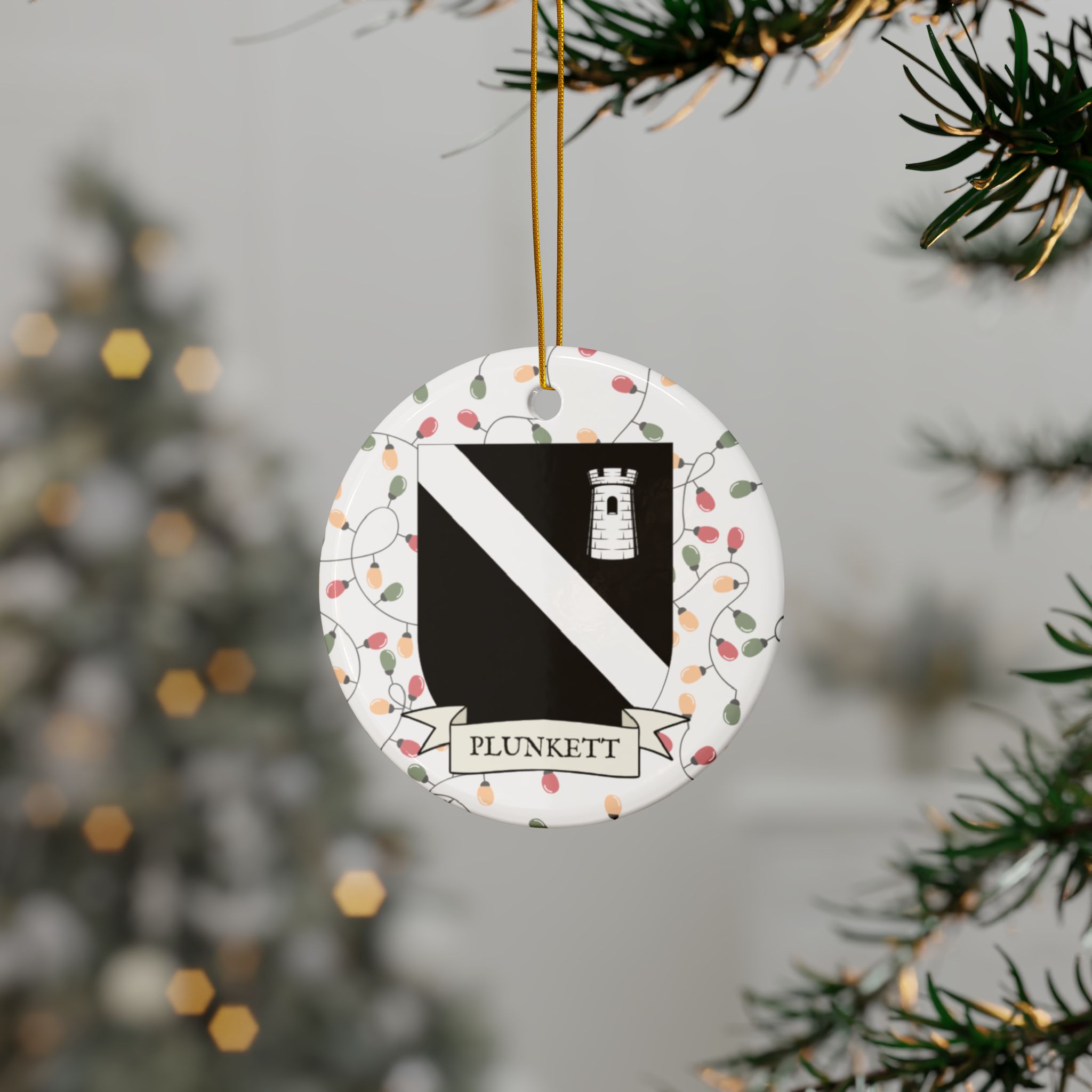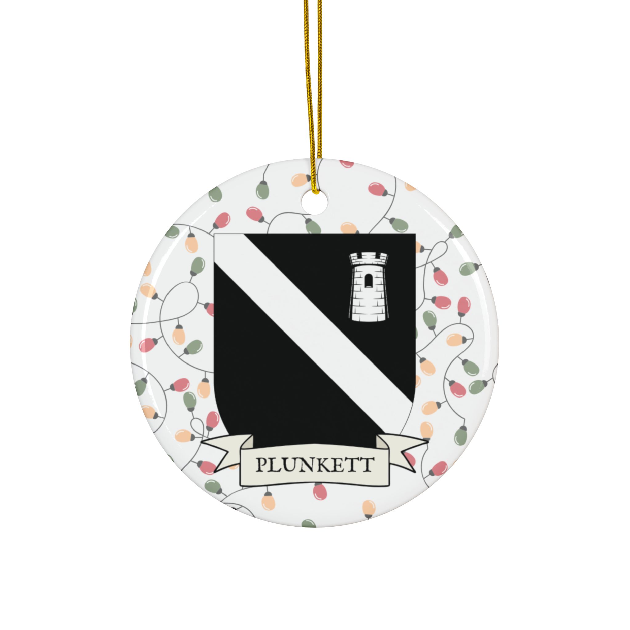 Celebrate the Holidays (and your Irish Heritage) with Irish Family Coat of Arms Christmas Tree Ornaments! Your family’s coat of arms printed on a 100% ceramic ornament with a festive Christmas Tree lights background. Great gift idea for the Irish Americans in your life. It’s sure to become a Christmas tradition!