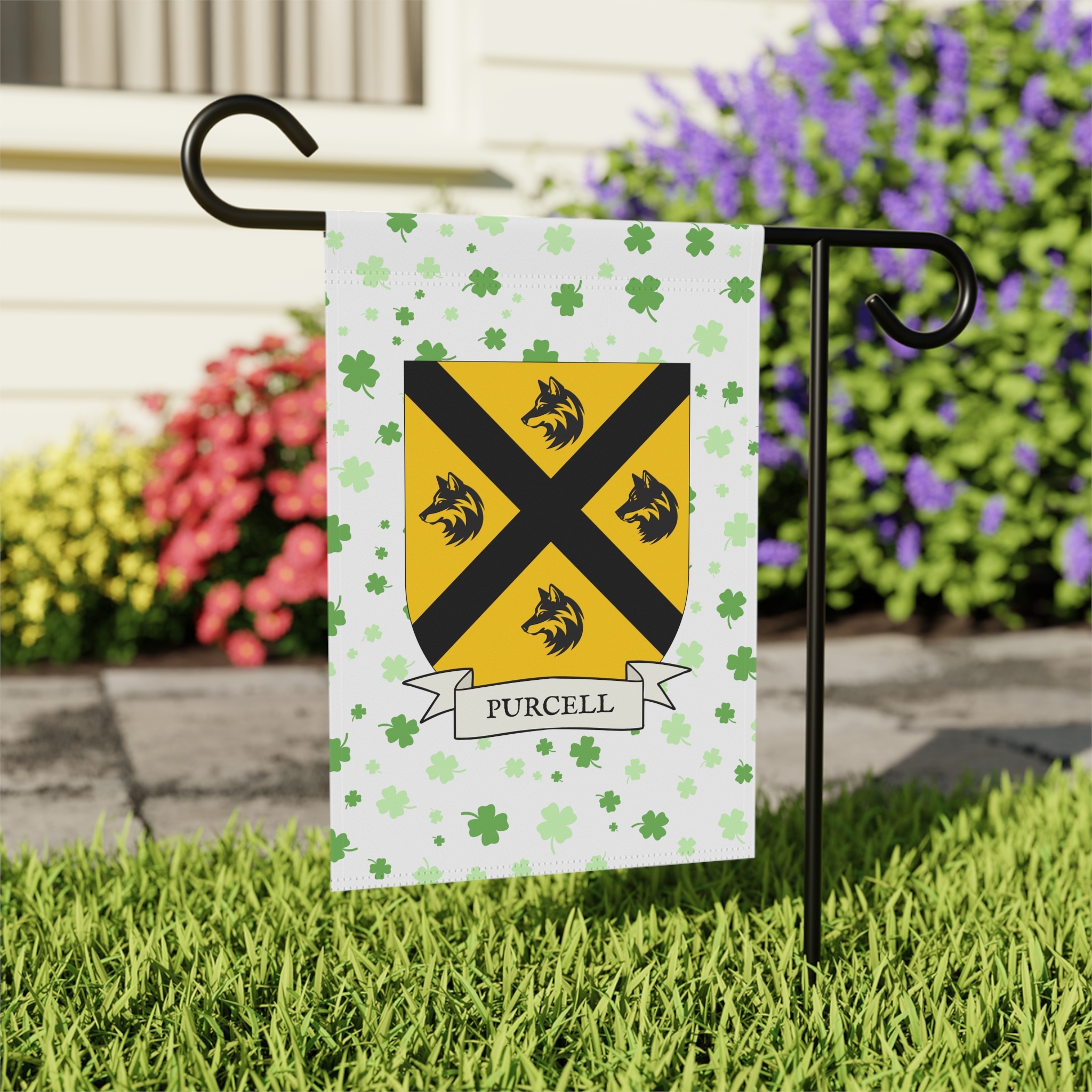 This welcoming Garden Banner will be a great addition to your garden or yard. It displays the Purcell Family Coat of Arms over a subtle background showing a field of four-leaf shamrocks. Both sides show identical images.