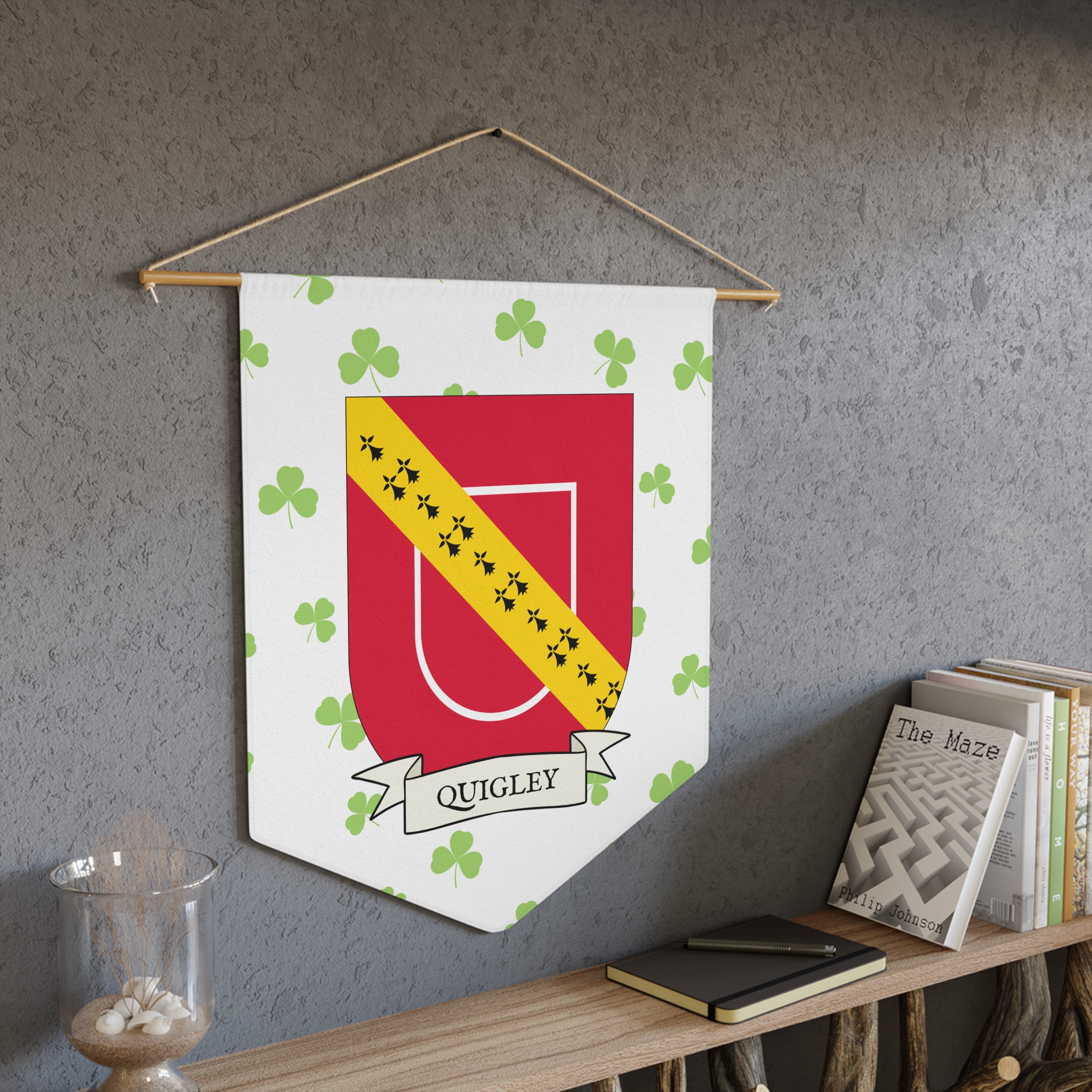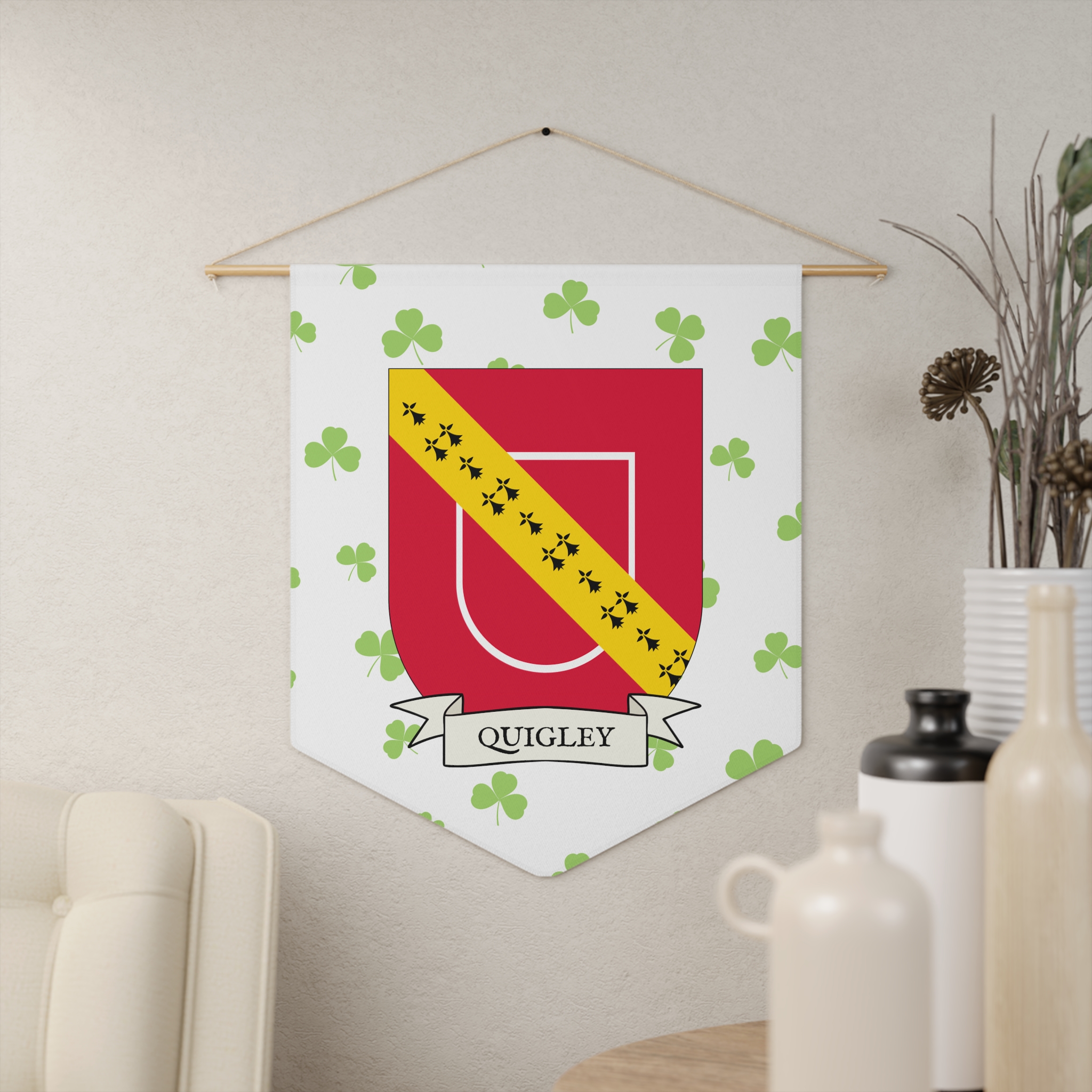 Uplift any room and show off your Irish American roots with this Quigley Family Coat of Arms Indoor Pennant. Pennant is printed on durable poly twill and comes with a wooden dowel/twine frame for easy hanging. Features your family Coat of Arms printed over a restrained shamrock patterned background.