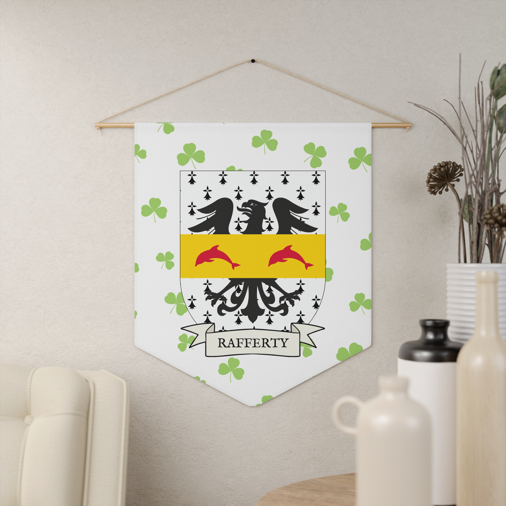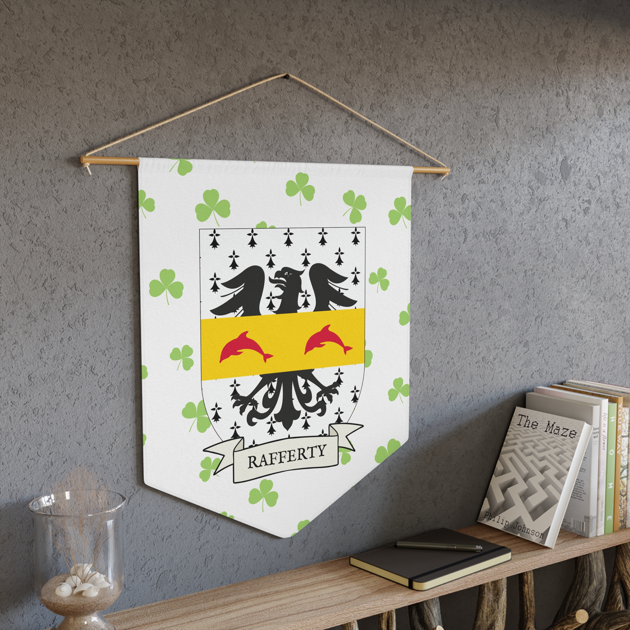 Uplift any room and show off your Irish American roots with this Rafferty Family Coat of Arms Indoor Pennant. Pennant is printed on durable poly twill and comes with a wooden dowel/twine frame for easy hanging. Features your family Coat of Arms printed over a restrained shamrock patterned background.