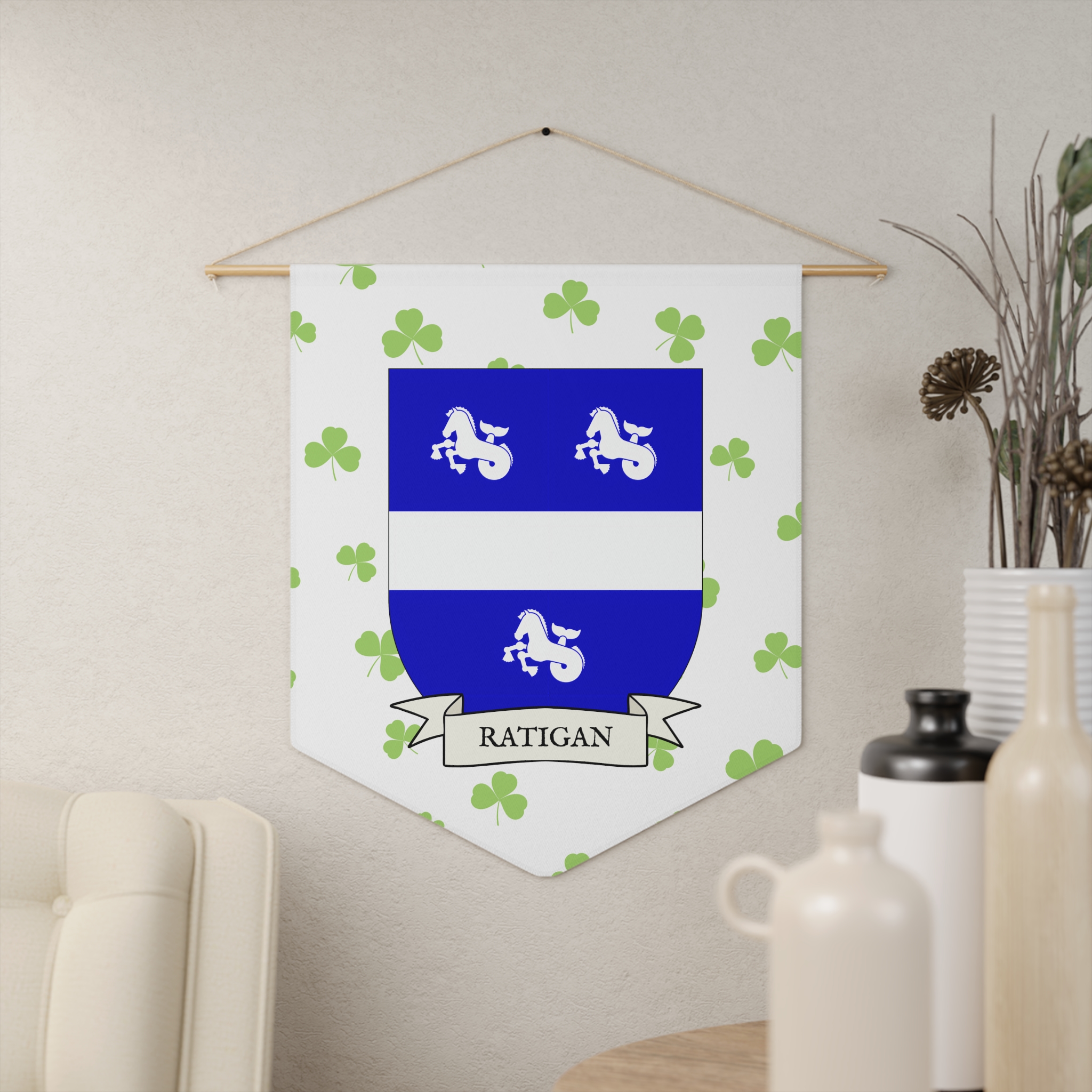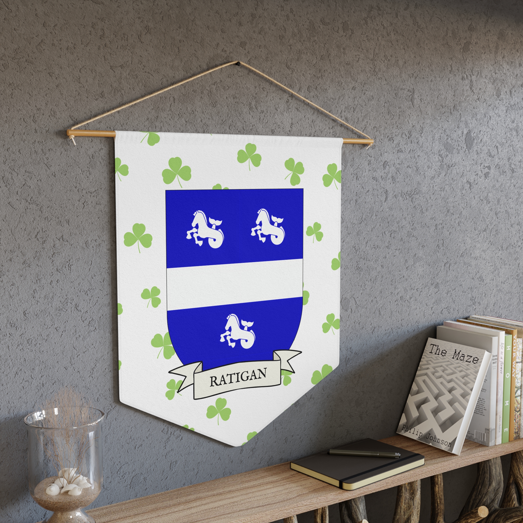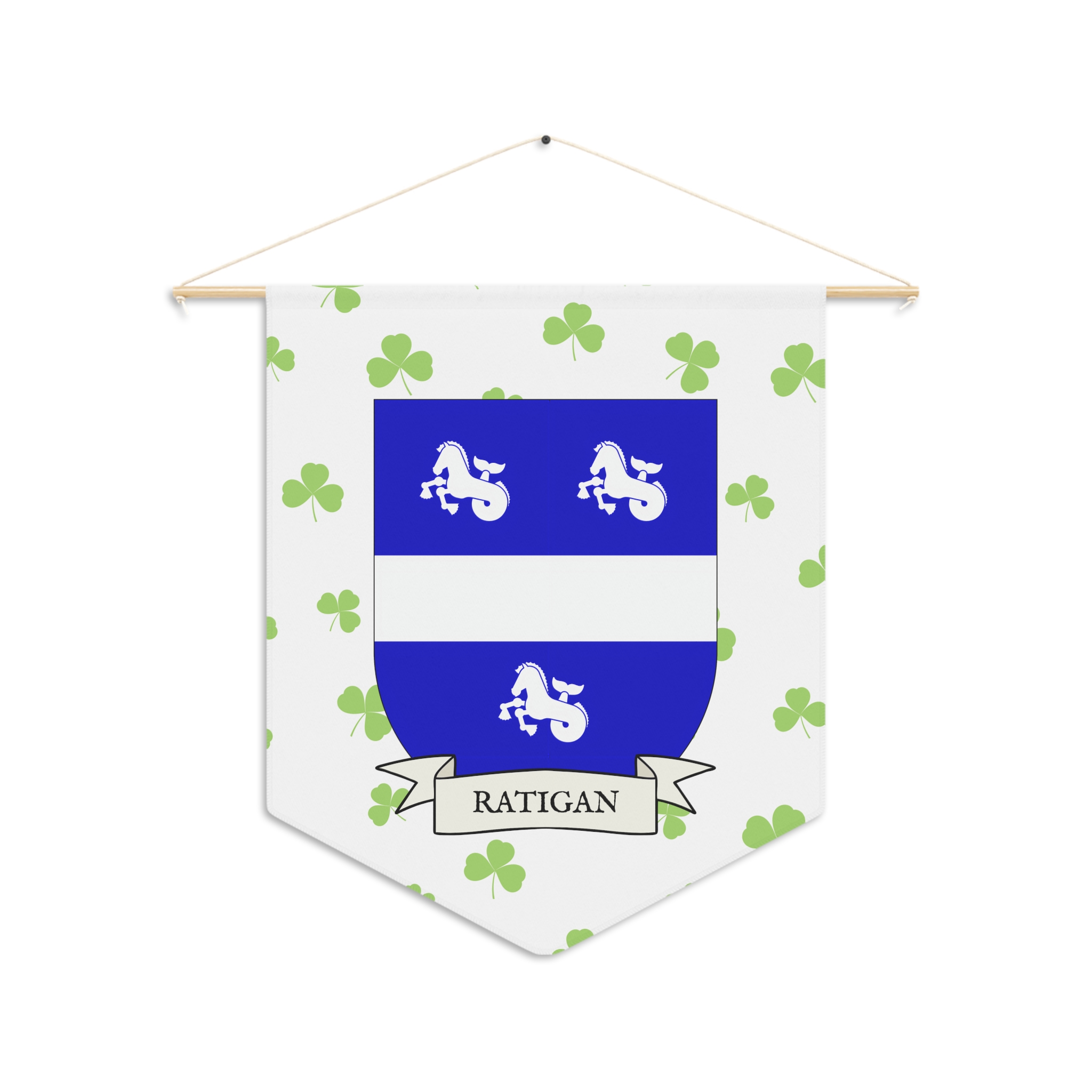 Uplift any room and show off your Irish American roots with this Ratigan Family Coat of Arms Indoor Pennant. Pennant is printed on durable poly twill and comes with a wooden dowel/twine frame for easy hanging. Features your family Coat of Arms printed over a restrained shamrock patterned background.