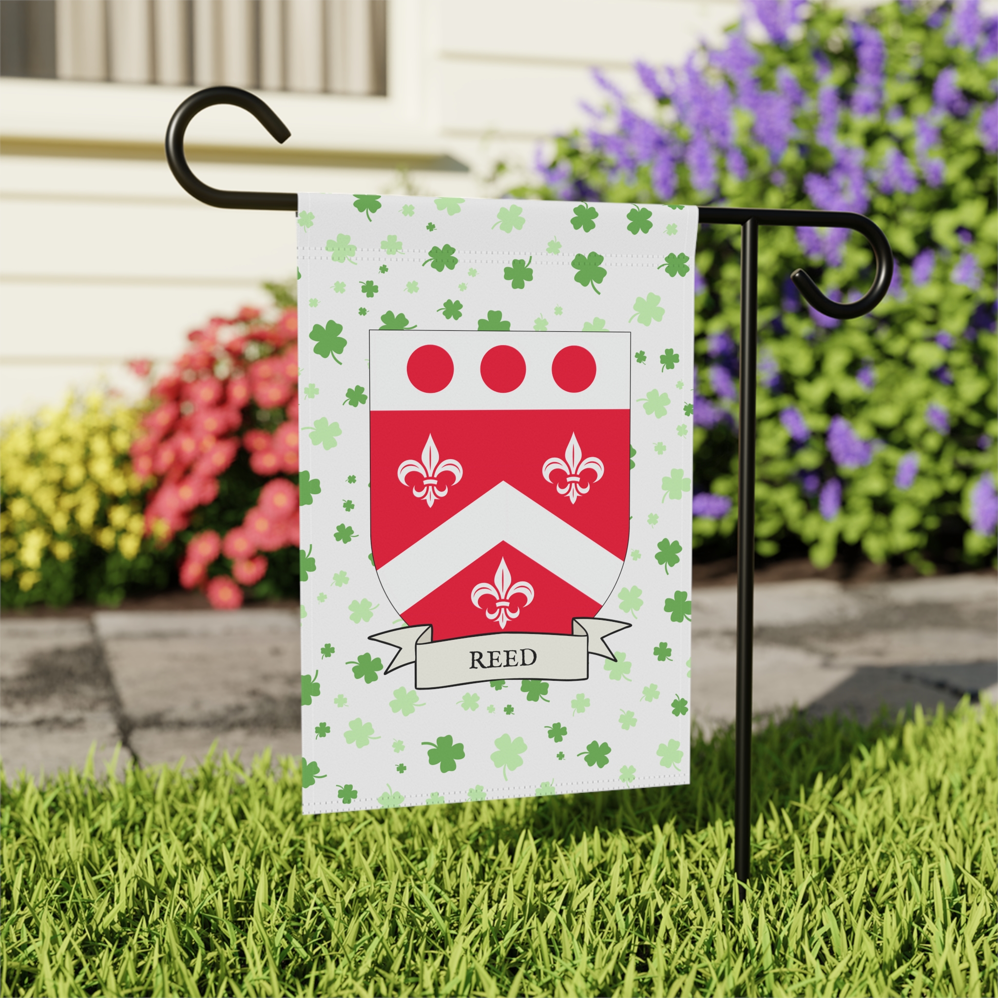 This welcoming Garden Banner will be a great addition to your garden or yard. It displays the Reed Family Coat of Arms over a subtle background showing a field of four-leaf shamrocks. Both sides show identical images.