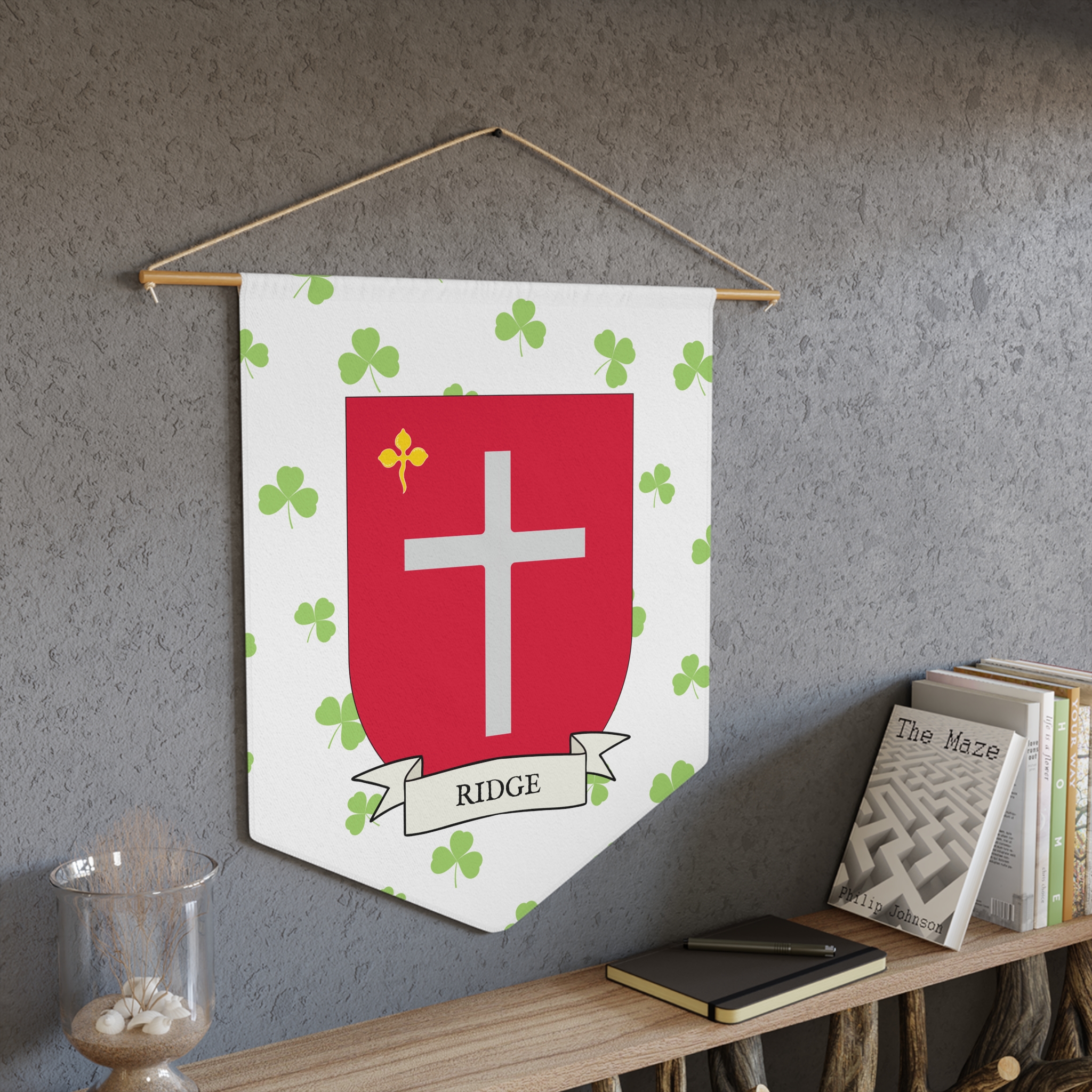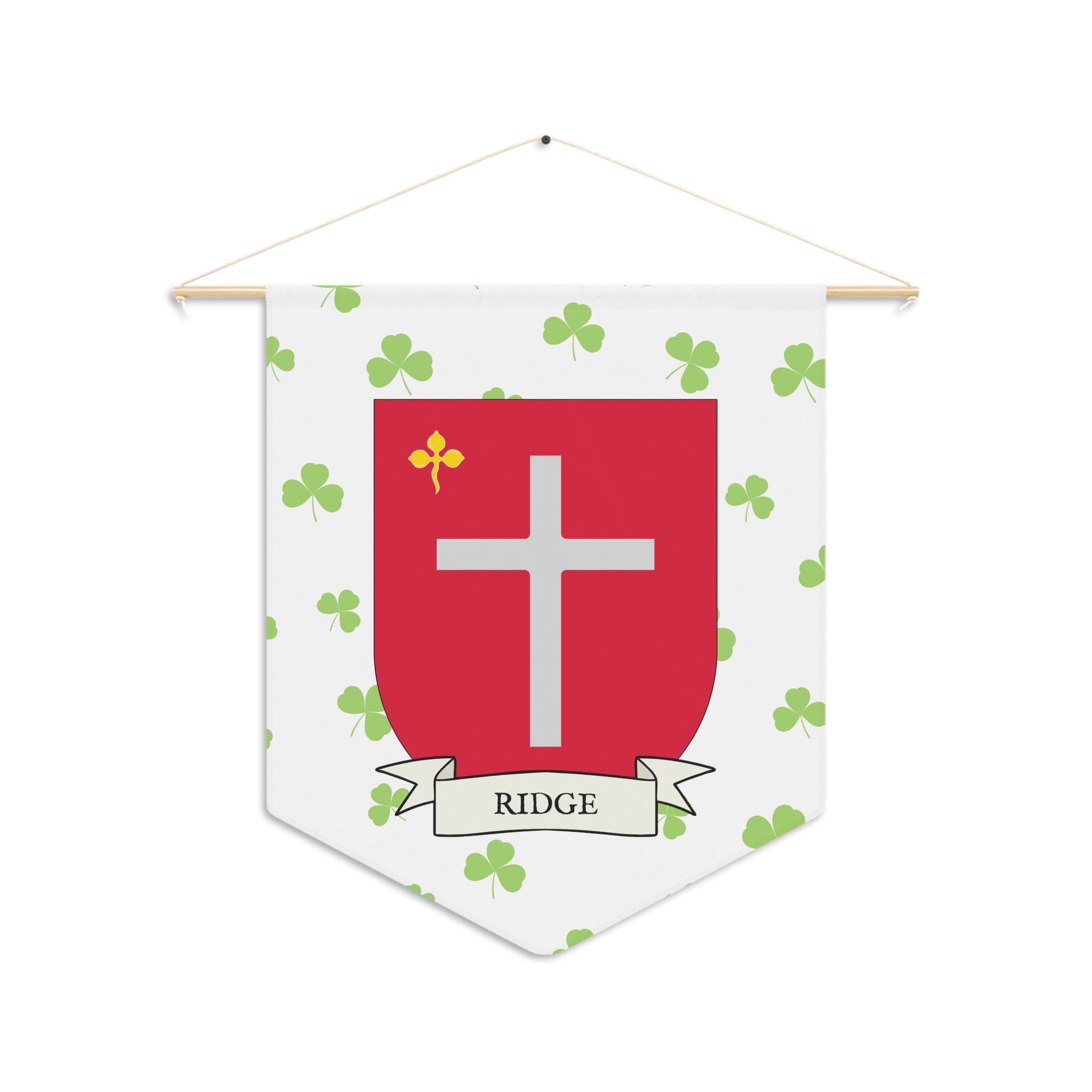 Uplift any room and show off your Irish American roots with this Ridge Family Coat of Arms Indoor Pennant. Pennant is printed on durable poly twill and comes with a wooden dowel/twine frame for easy hanging. Features your family Coat of Arms printed over a restrained shamrock patterned background.