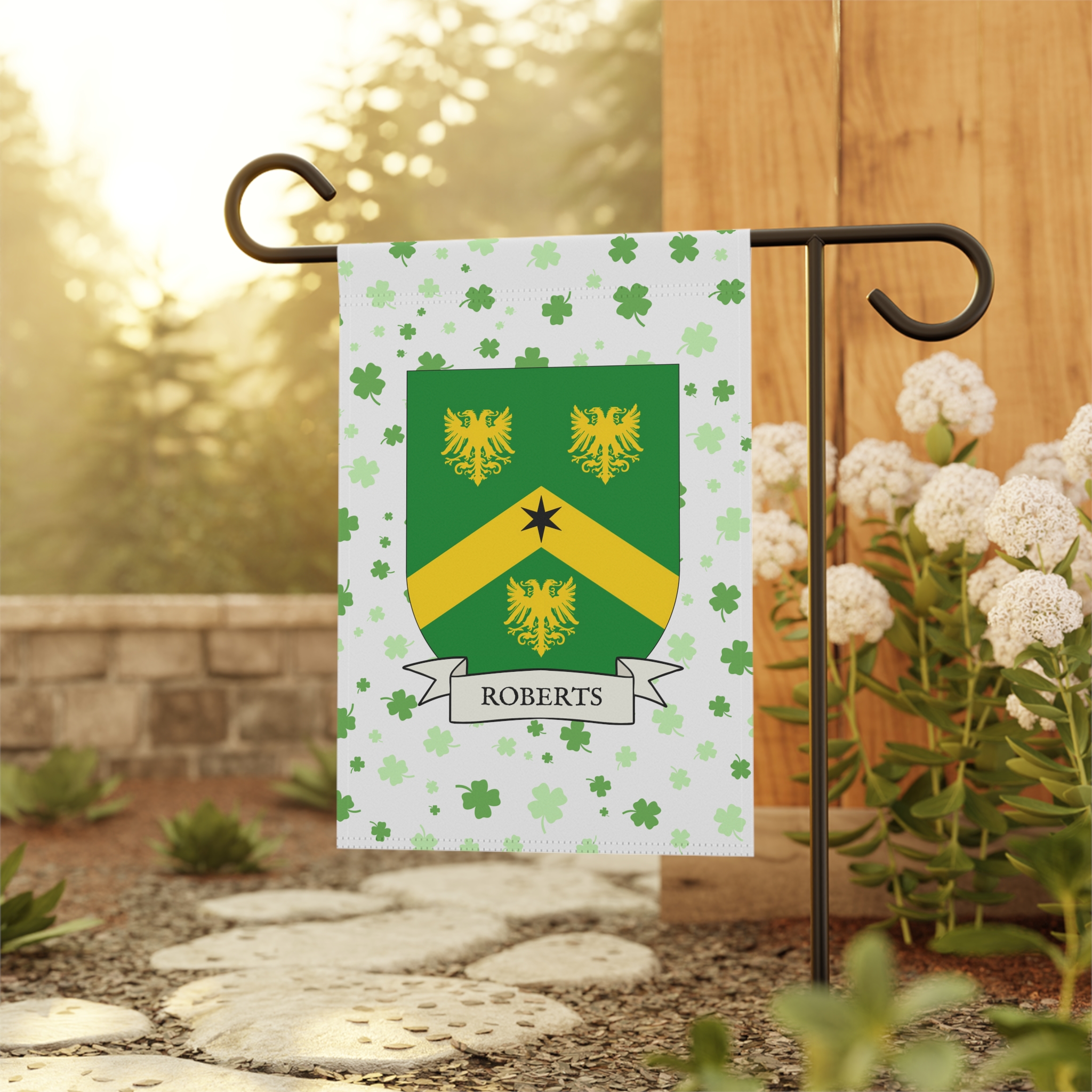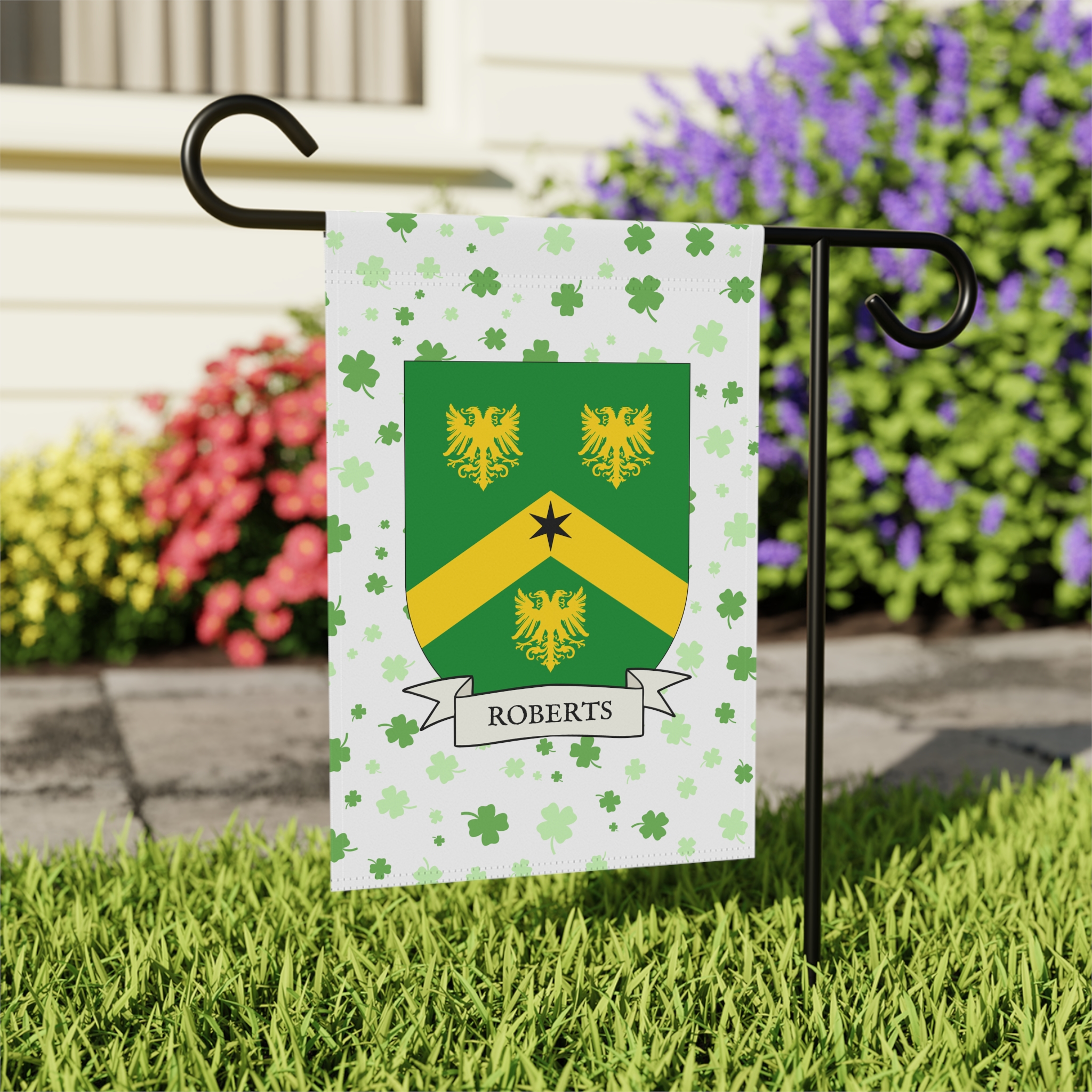 This welcoming Garden Banner will be a great addition to your garden or yard. It displays the Roberts Family Coat of Arms over a subtle background showing a field of four-leaf shamrocks. Both sides show identical images.