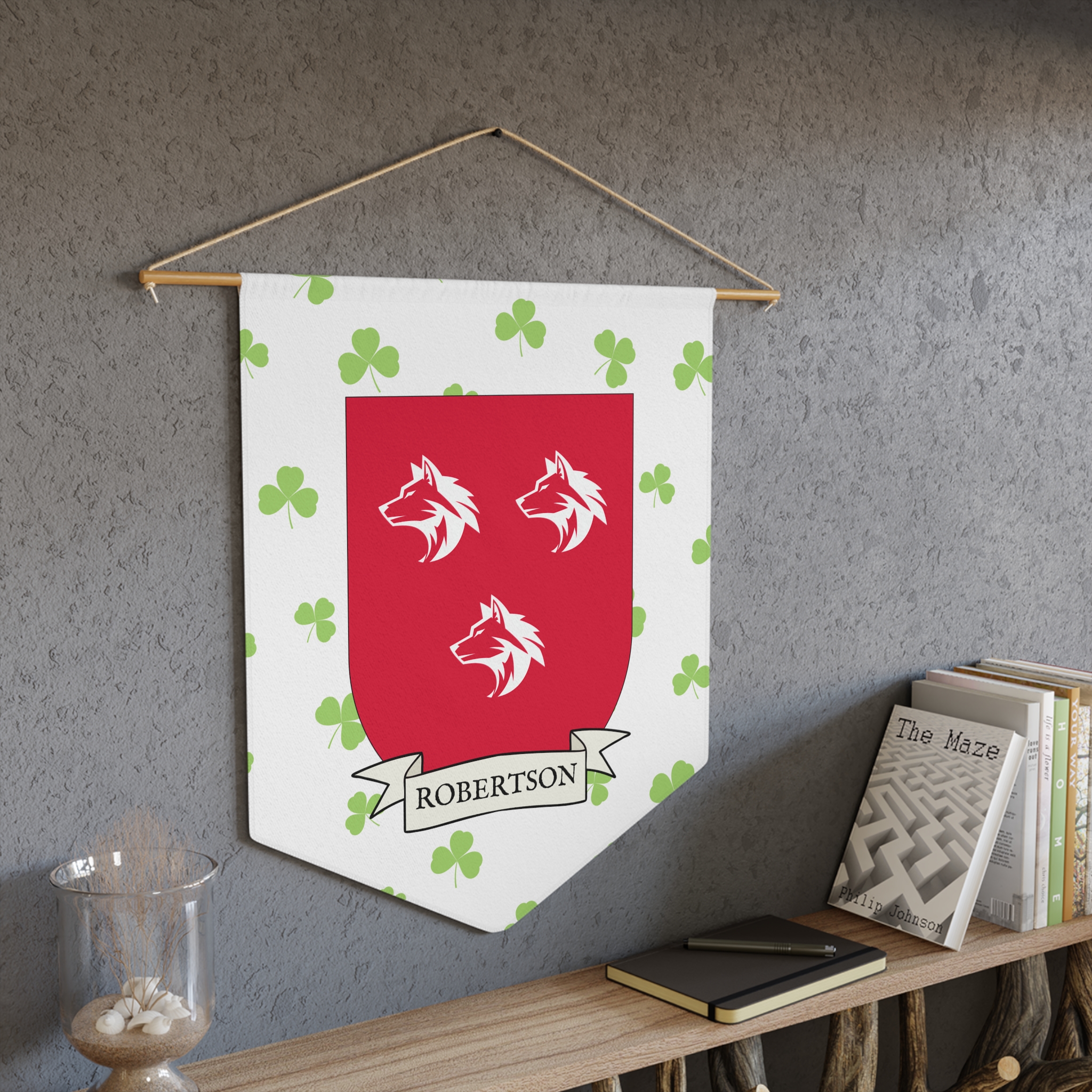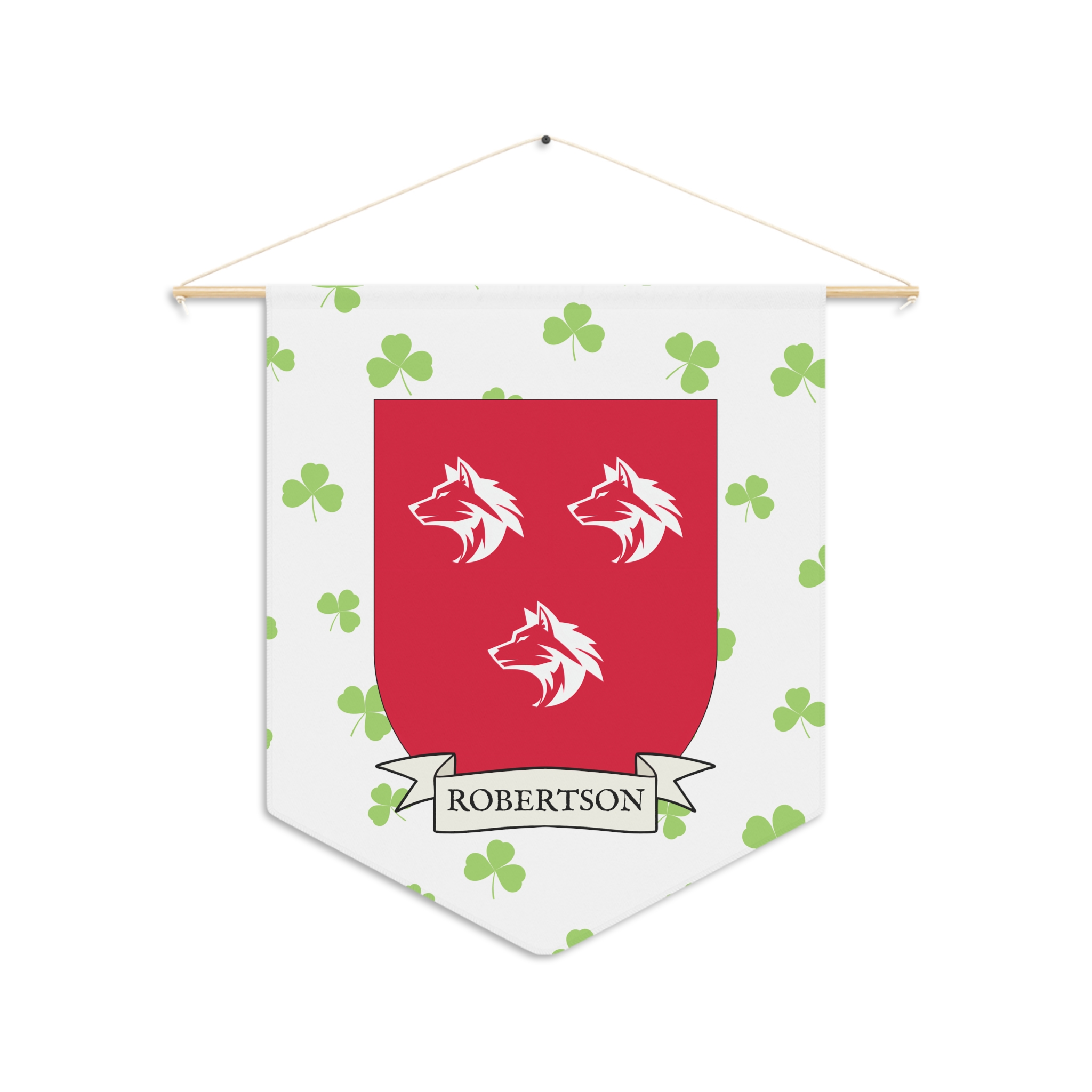 Uplift any room and show off your Irish American roots with this Robertson Family Coat of Arms Indoor Pennant. Pennant is printed on durable poly twill and comes with a wooden dowel/twine frame for easy hanging. Features your family Coat of Arms printed over a restrained shamrock patterned background.
