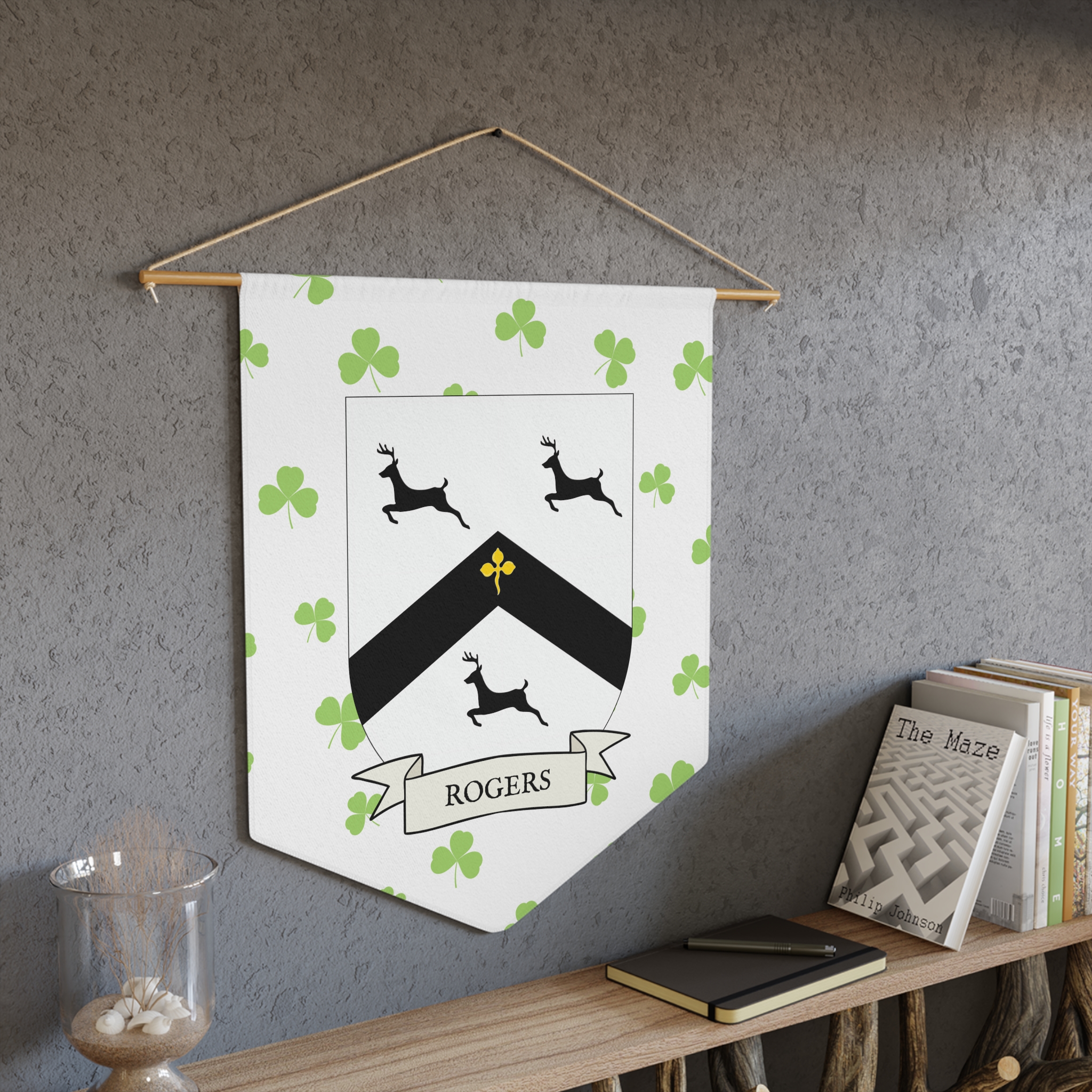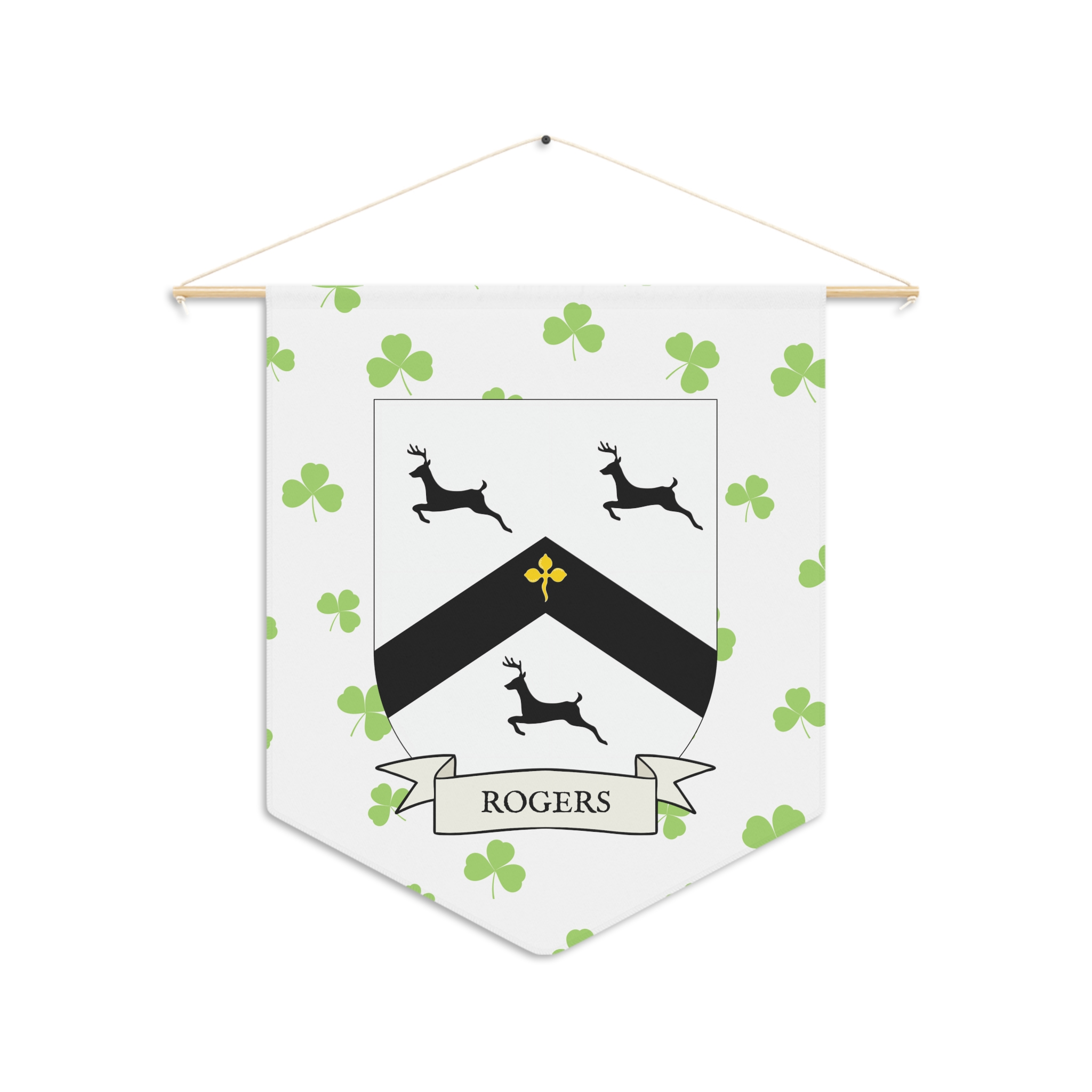 Uplift any room and show off your Irish American roots with this Rogers Family Coat of Arms Indoor Pennant. Pennant is printed on durable poly twill and comes with a wooden dowel/twine frame for easy hanging. Features your family Coat of Arms printed over a restrained shamrock patterned background.