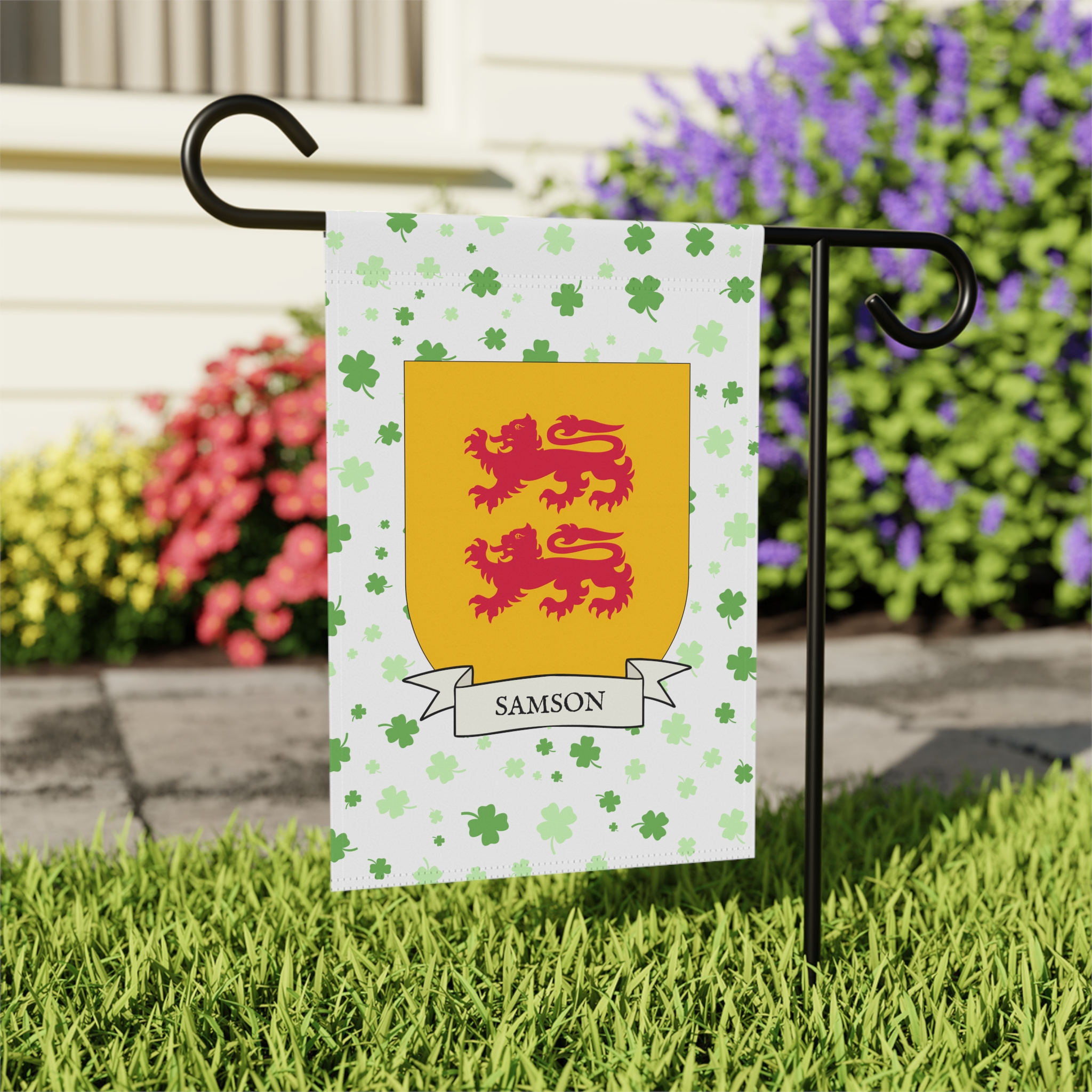 This welcoming Garden Banner will be a great addition to your garden or yard. It displays the Samson Family Coat of Arms over a subtle background showing a field of four-leaf shamrocks. Both sides show identical images.