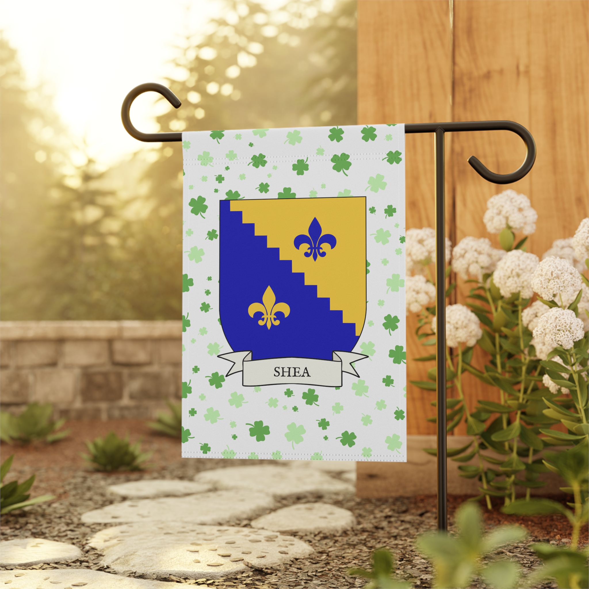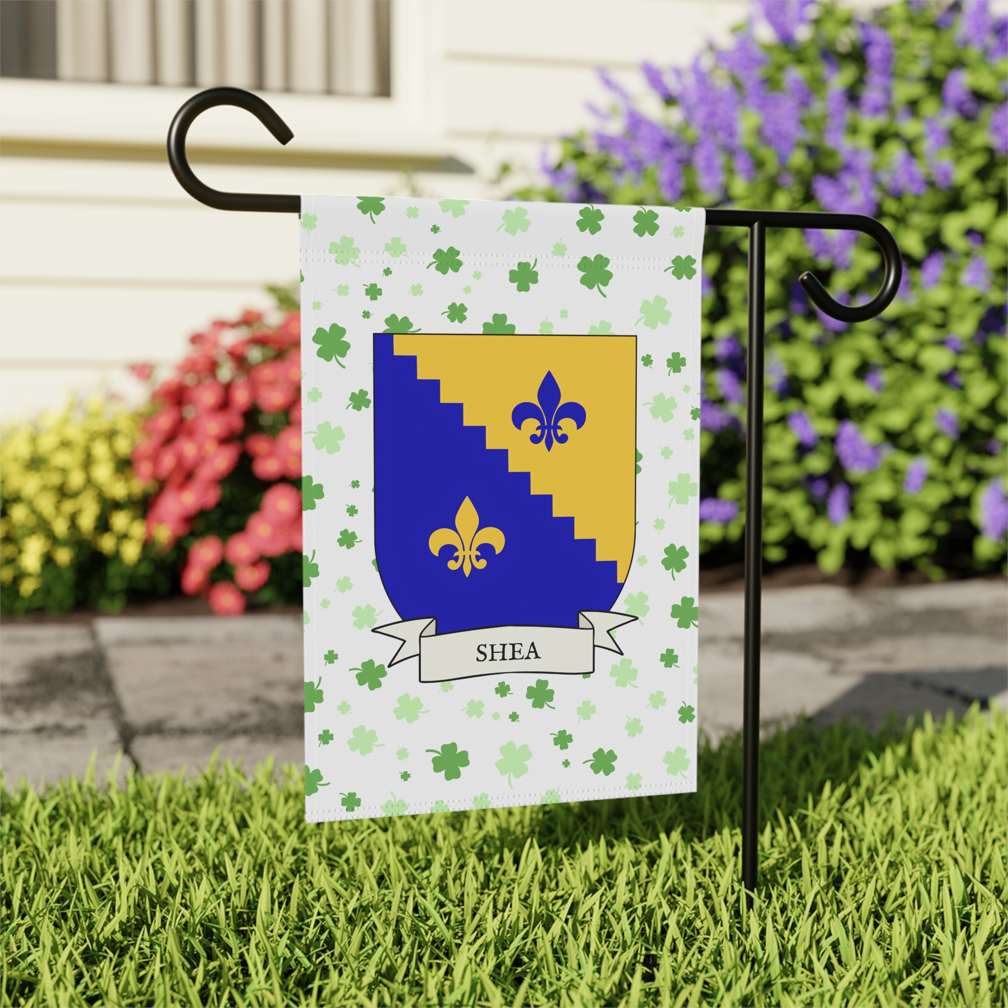This welcoming Garden Banner will be a great addition to your garden or yard. It displays the Shea Family Coat of Arms over a subtle background showing a field of four-leaf shamrocks. Both sides show identical images.