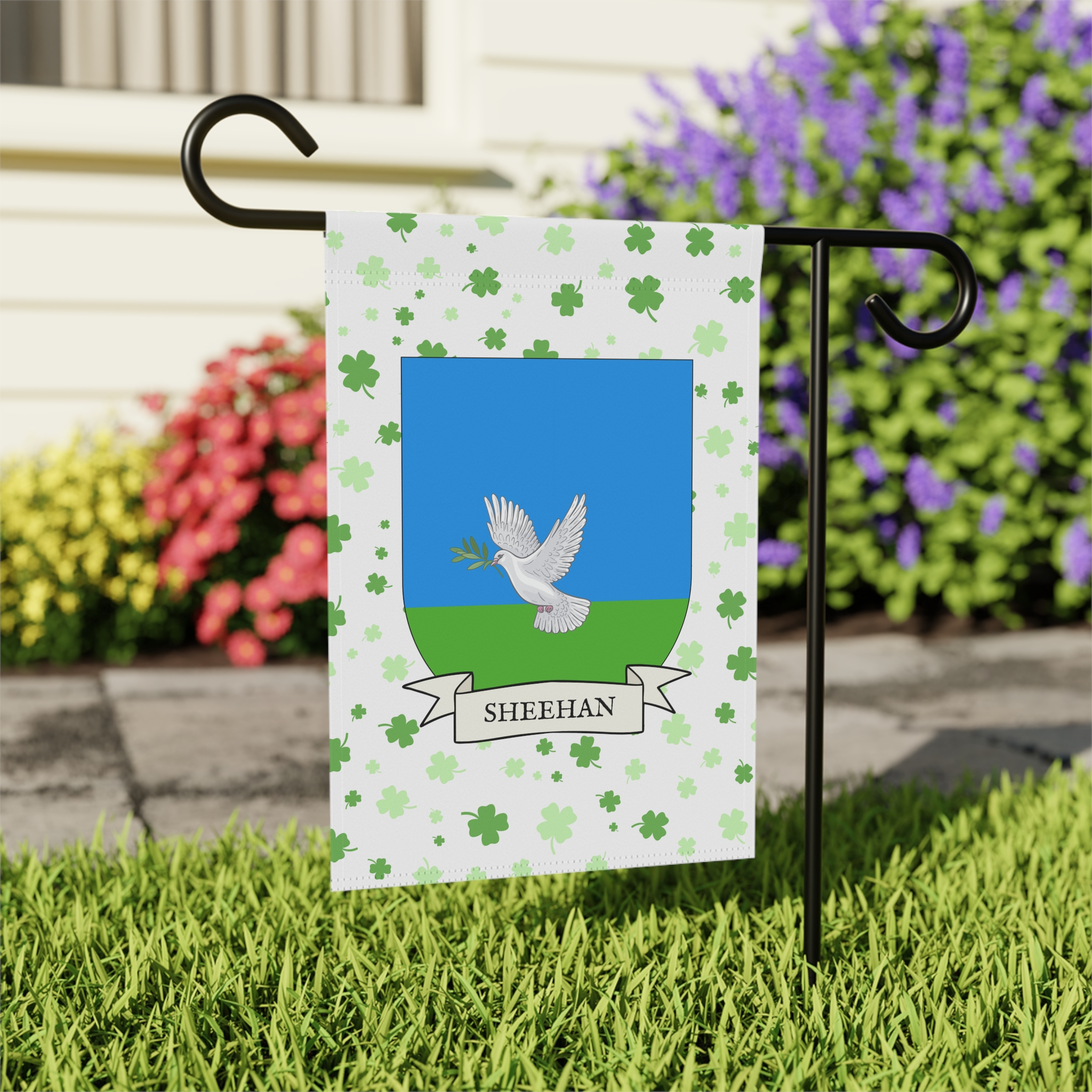 This welcoming Garden Banner will be a great addition to your garden or yard. It displays the Sheehan Family Coat of Arms over a subtle background showing a field of four-leaf shamrocks. Both sides show identical images.