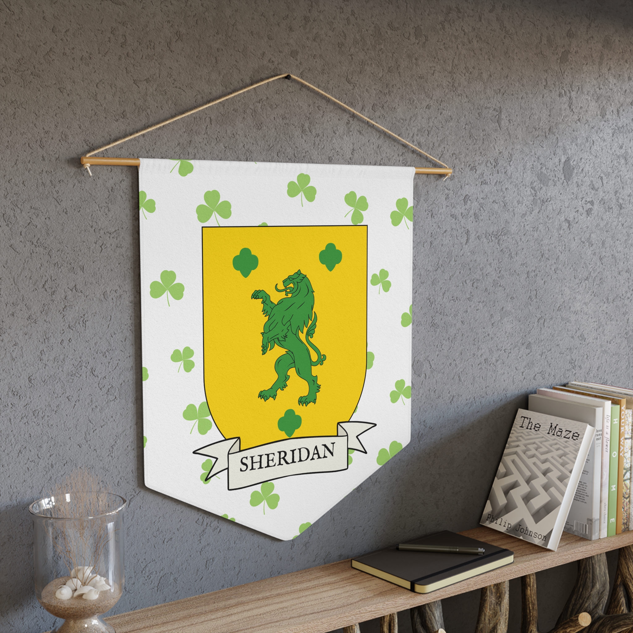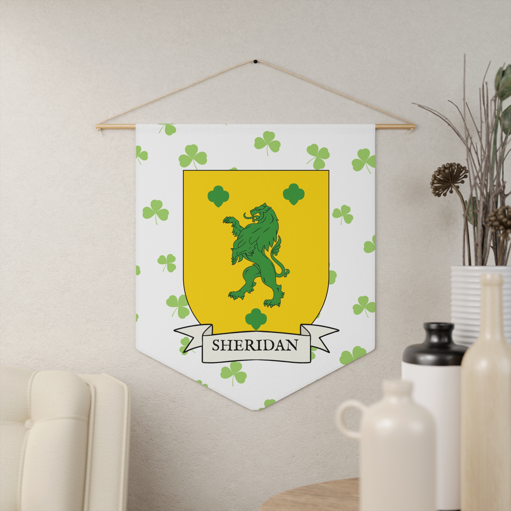 Uplift any room and show off your Irish American roots with this Sheridan Family Coat of Arms Indoor Pennant. Pennant is printed on durable poly twill and comes with a wooden dowel/twine frame for easy hanging. Features your family Coat of Arms printed over a restrained shamrock patterned background.
