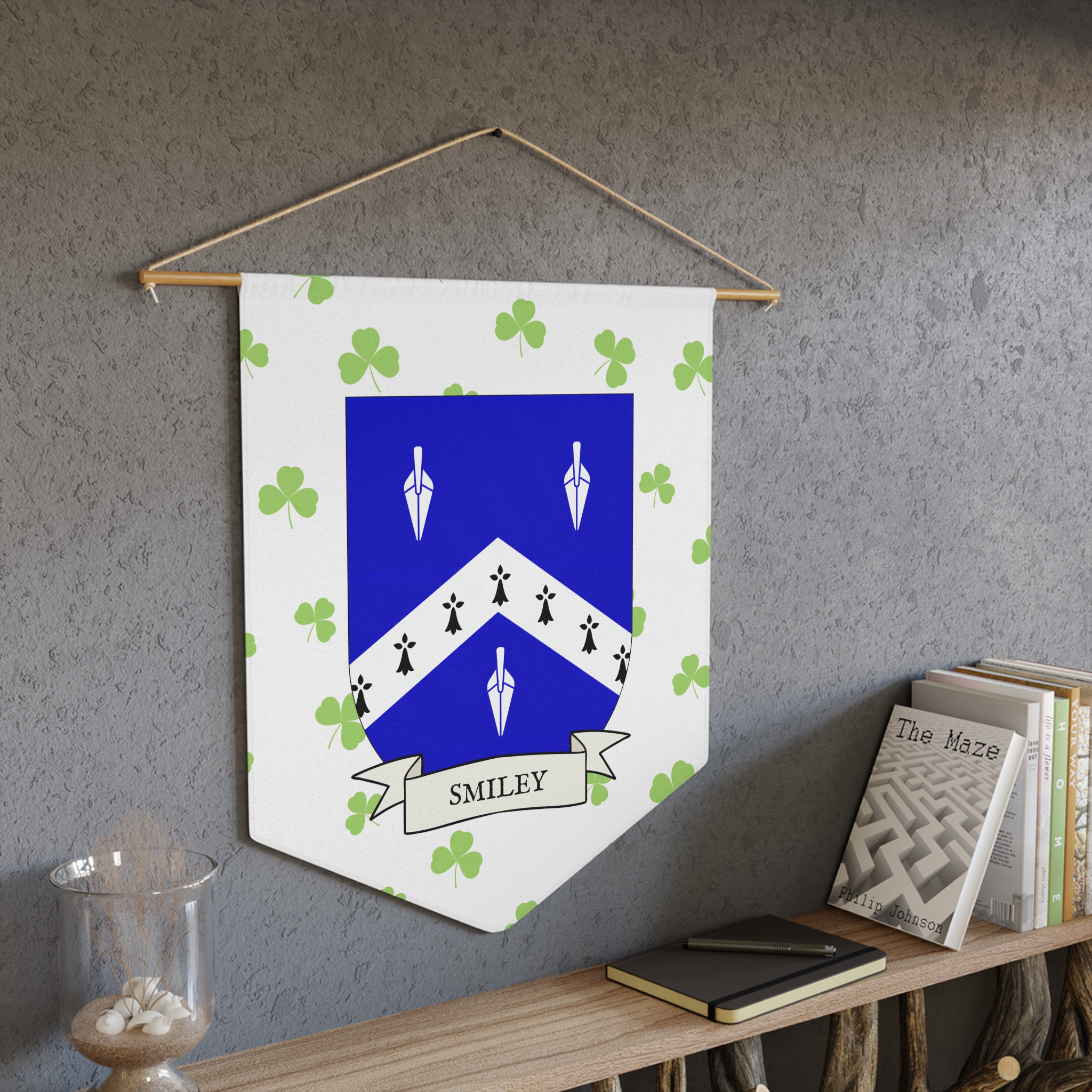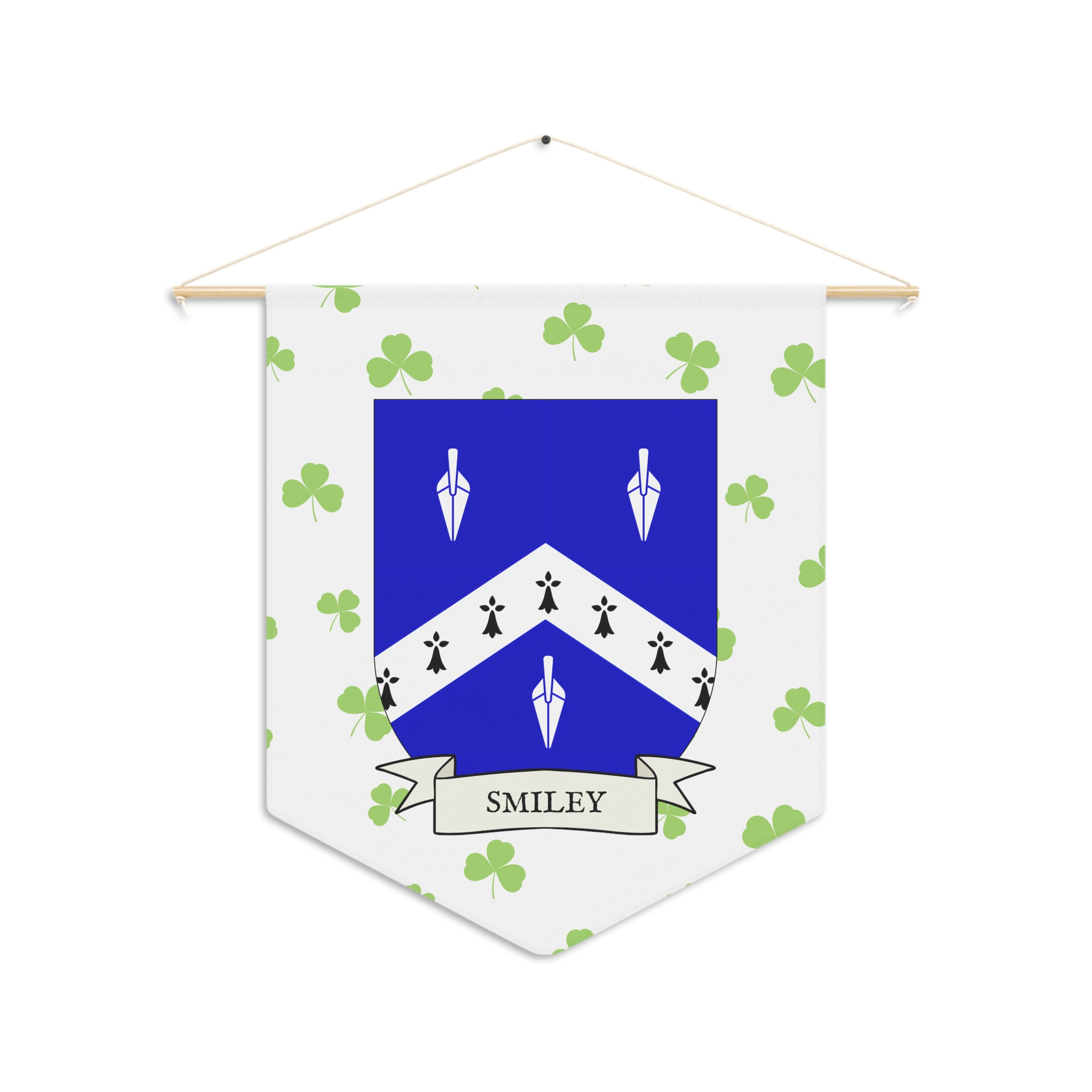 Uplift any room and show off your Irish American roots with this Smiley Family Coat of Arms Indoor Pennant. Pennant is printed on durable poly twill and comes with a wooden dowel/twine frame for easy hanging. Features your family Coat of Arms printed over a restrained shamrock patterned background.