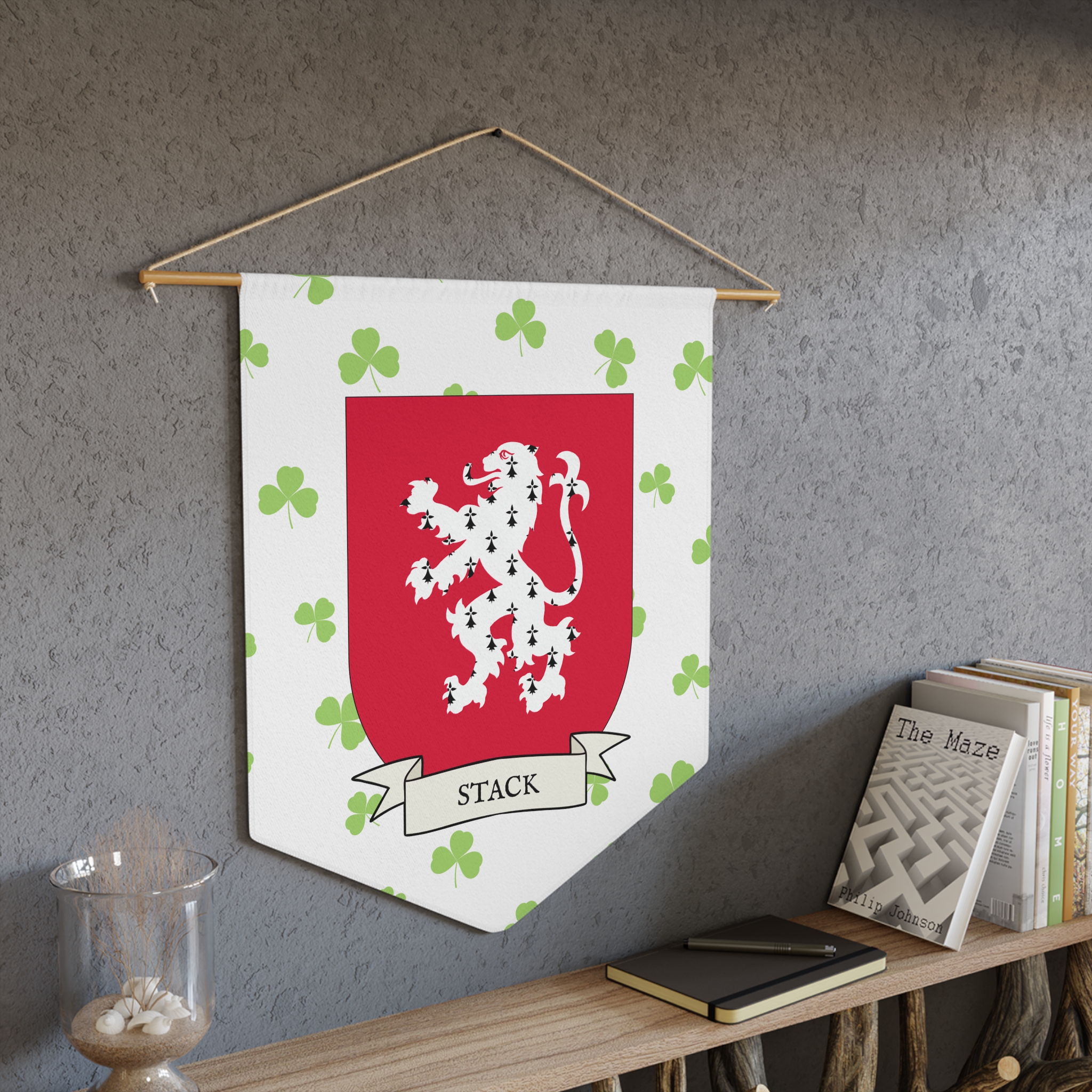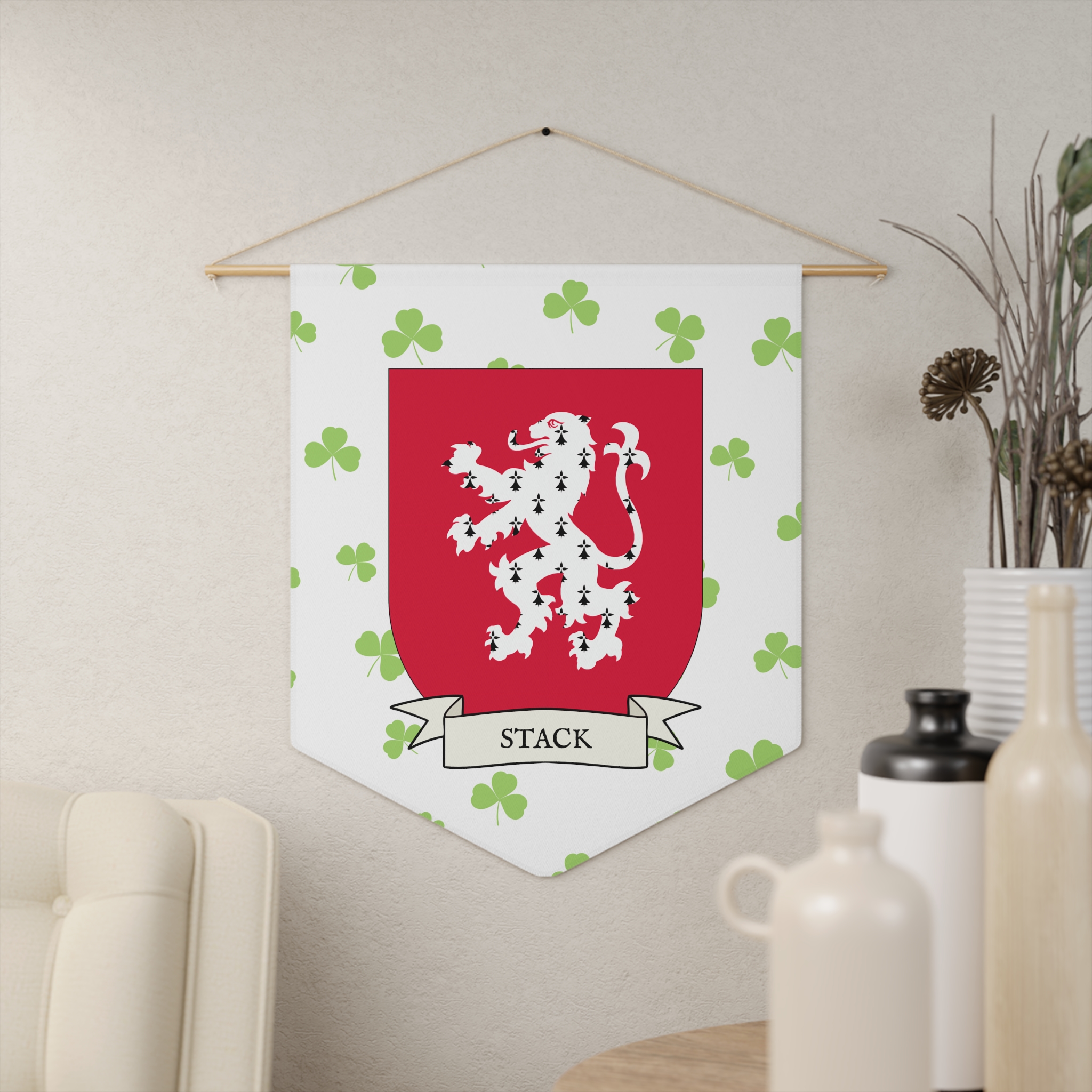 Uplift any room and show off your Irish American roots with this Stack Family Coat of Arms Indoor Pennant. Pennant is printed on durable poly twill and comes with a wooden dowel/twine frame for easy hanging. Features your family Coat of Arms printed over a restrained shamrock patterned background.