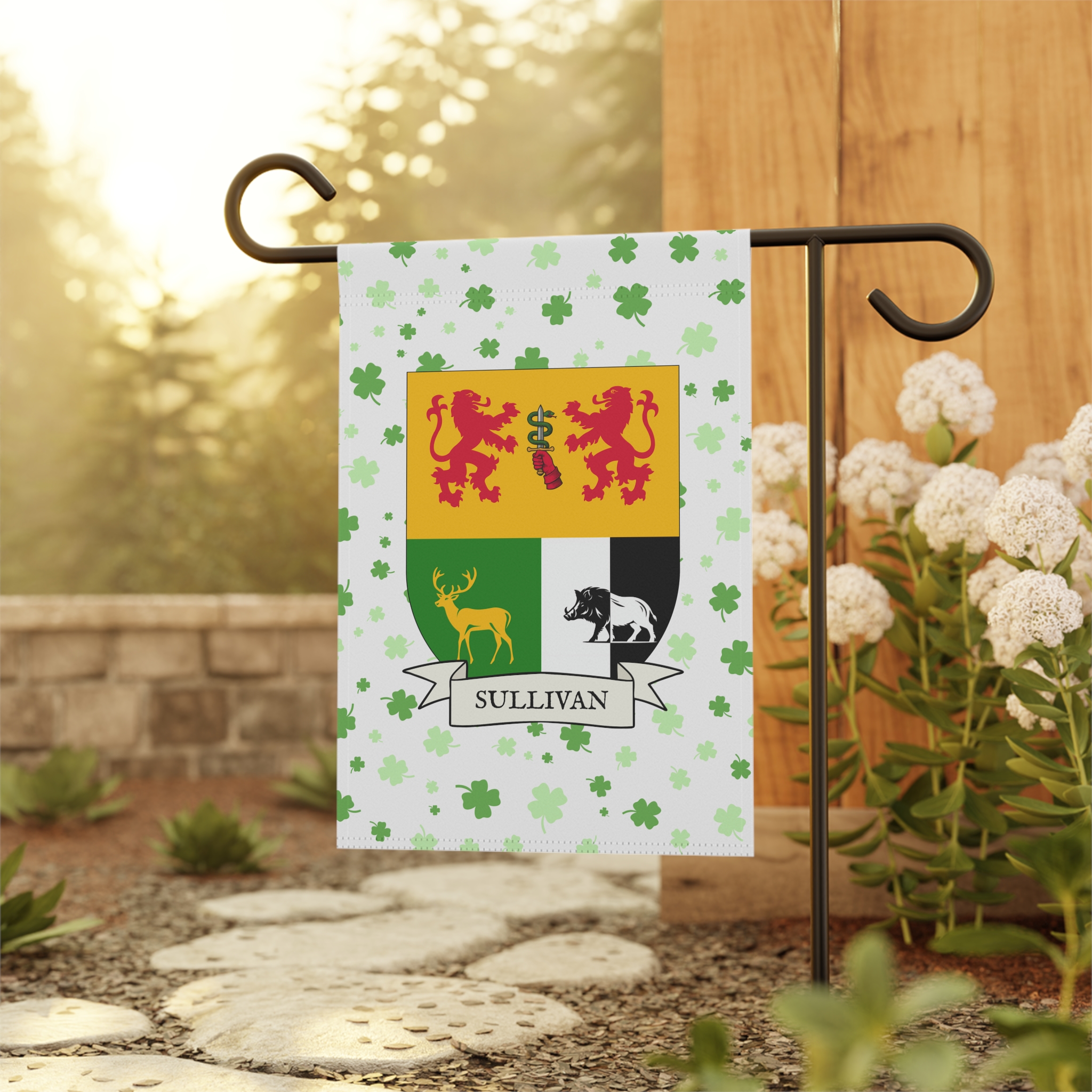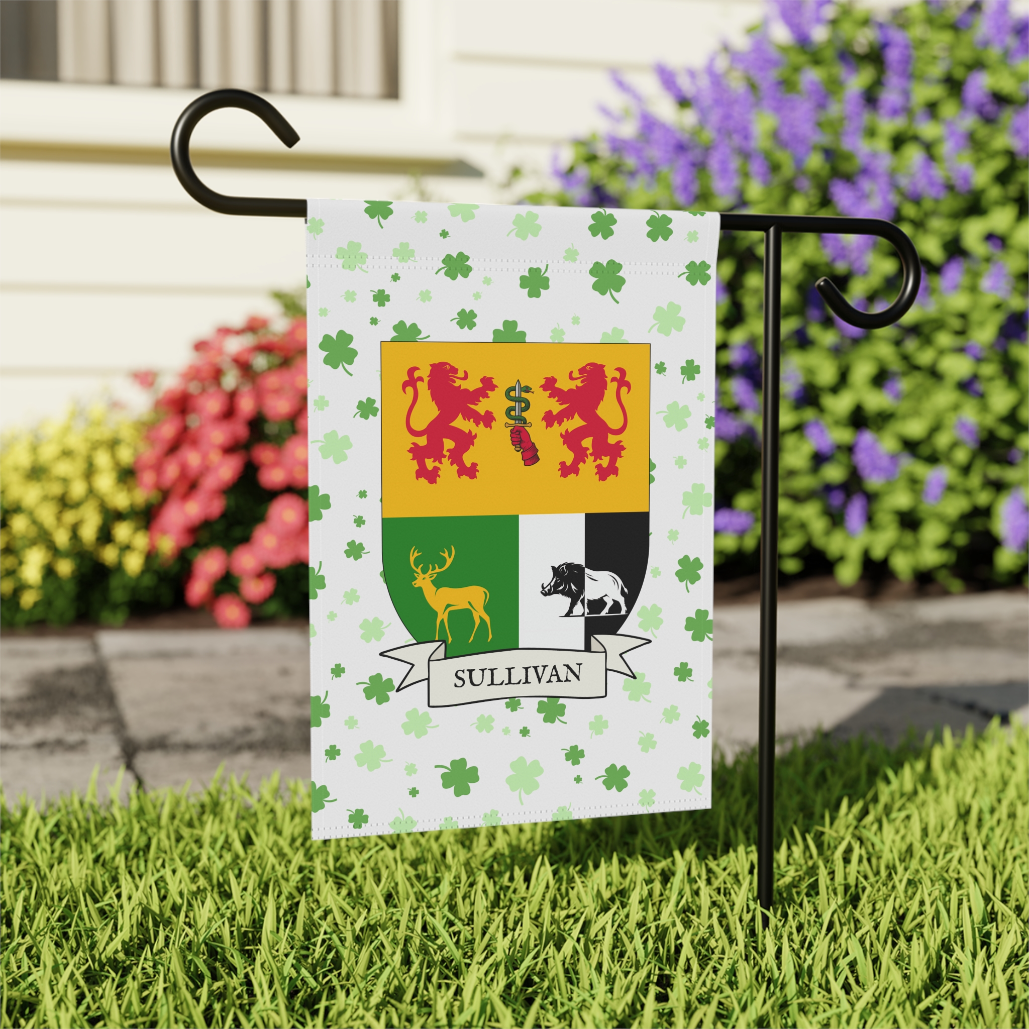 This welcoming Garden Banner will be a great addition to your garden or yard. It displays the Sullivan Family Coat of Arms over a subtle background showing a field of four-leaf shamrocks. Both sides show identical images.