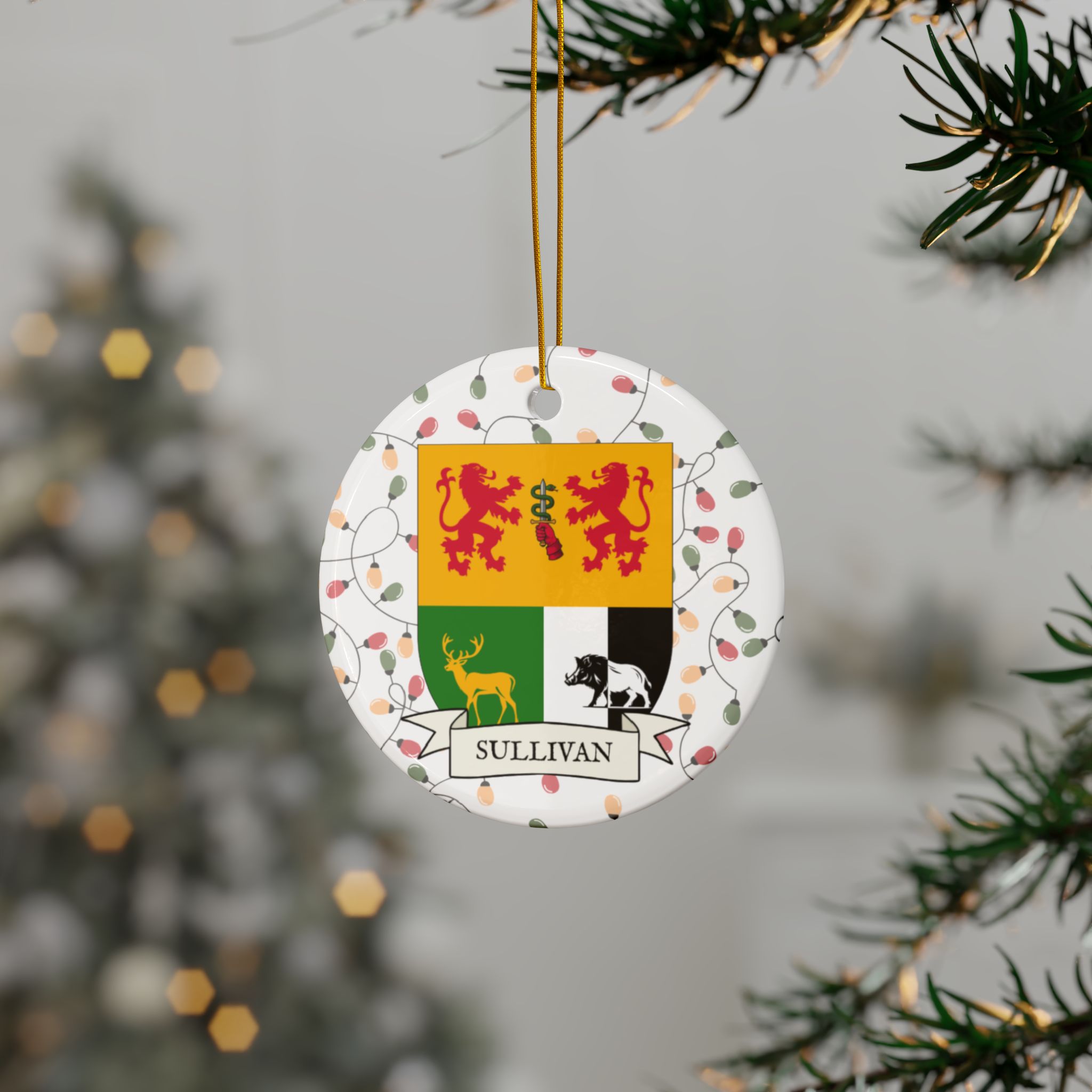Celebrate the Holidays (and your Irish Heritage) with Irish Family Coat of Arms Christmas Tree Ornaments! Your family’s coat of arms printed on a 100% ceramic ornament with a festive Christmas Tree lights background. Great gift idea for the Irish Americans in your life. It’s sure to become a Christmas tradition!