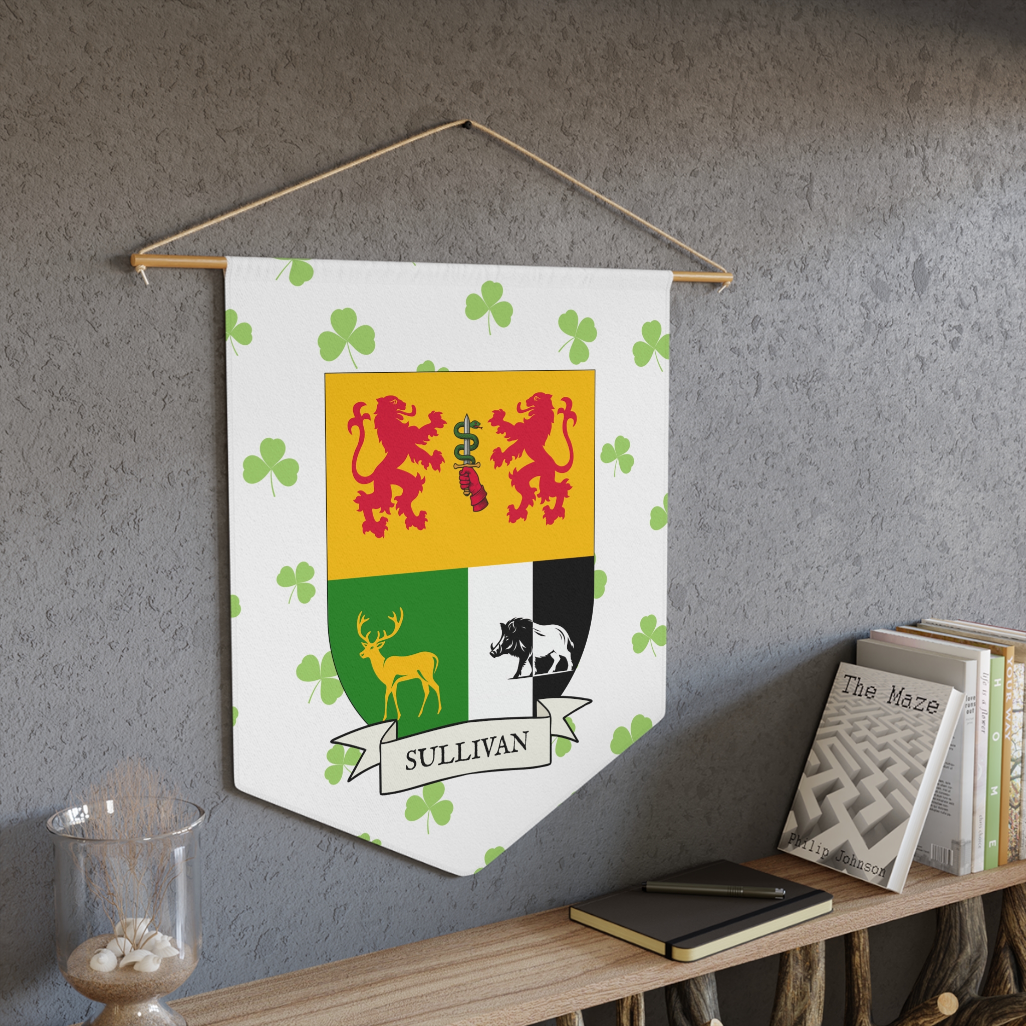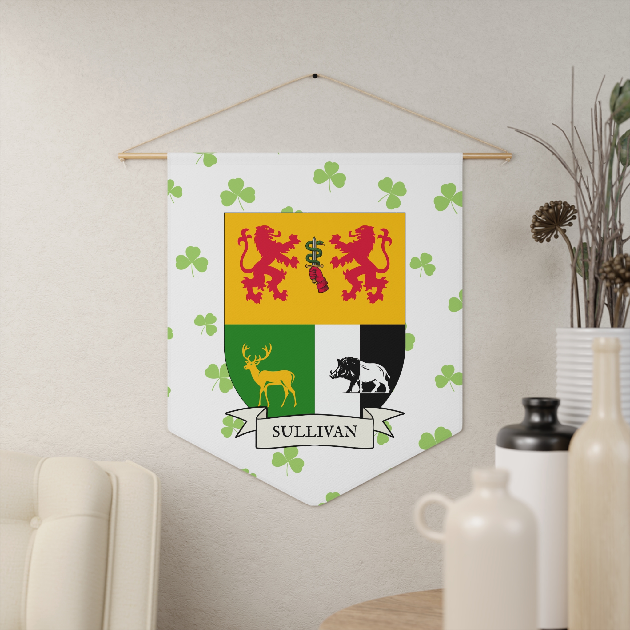 Uplift any room and show off your Irish American roots with this Sullivan Family Coat of Arms Indoor Pennant. Pennant is printed on durable poly twill and comes with a wooden dowel/twine frame for easy hanging. Features your family Coat of Arms printed over a restrained shamrock patterned background.