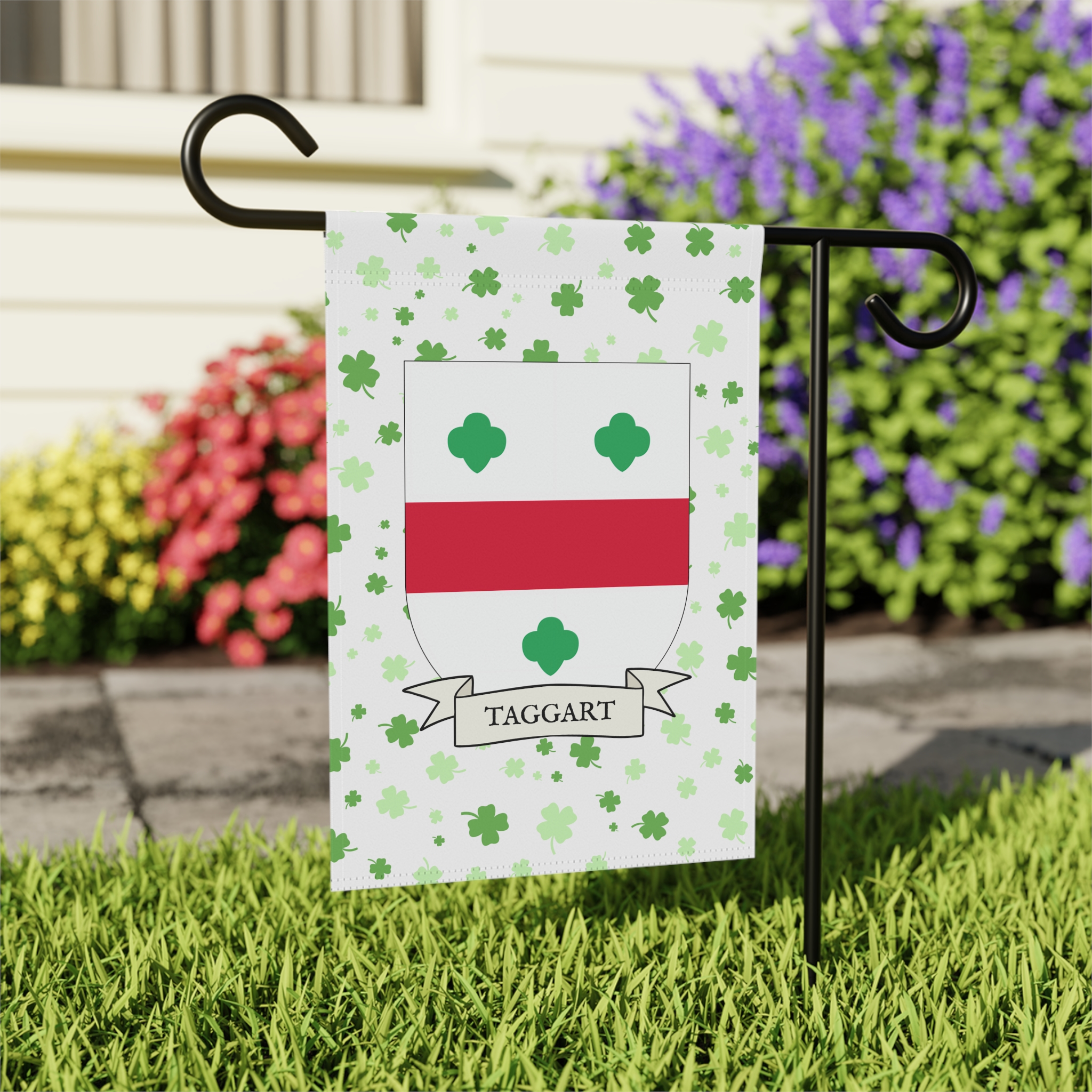 This welcoming Garden Banner will be a great addition to your garden or yard. It displays the Taggart Family Coat of Arms over a subtle background showing a field of four-leaf shamrocks. Both sides show identical images.