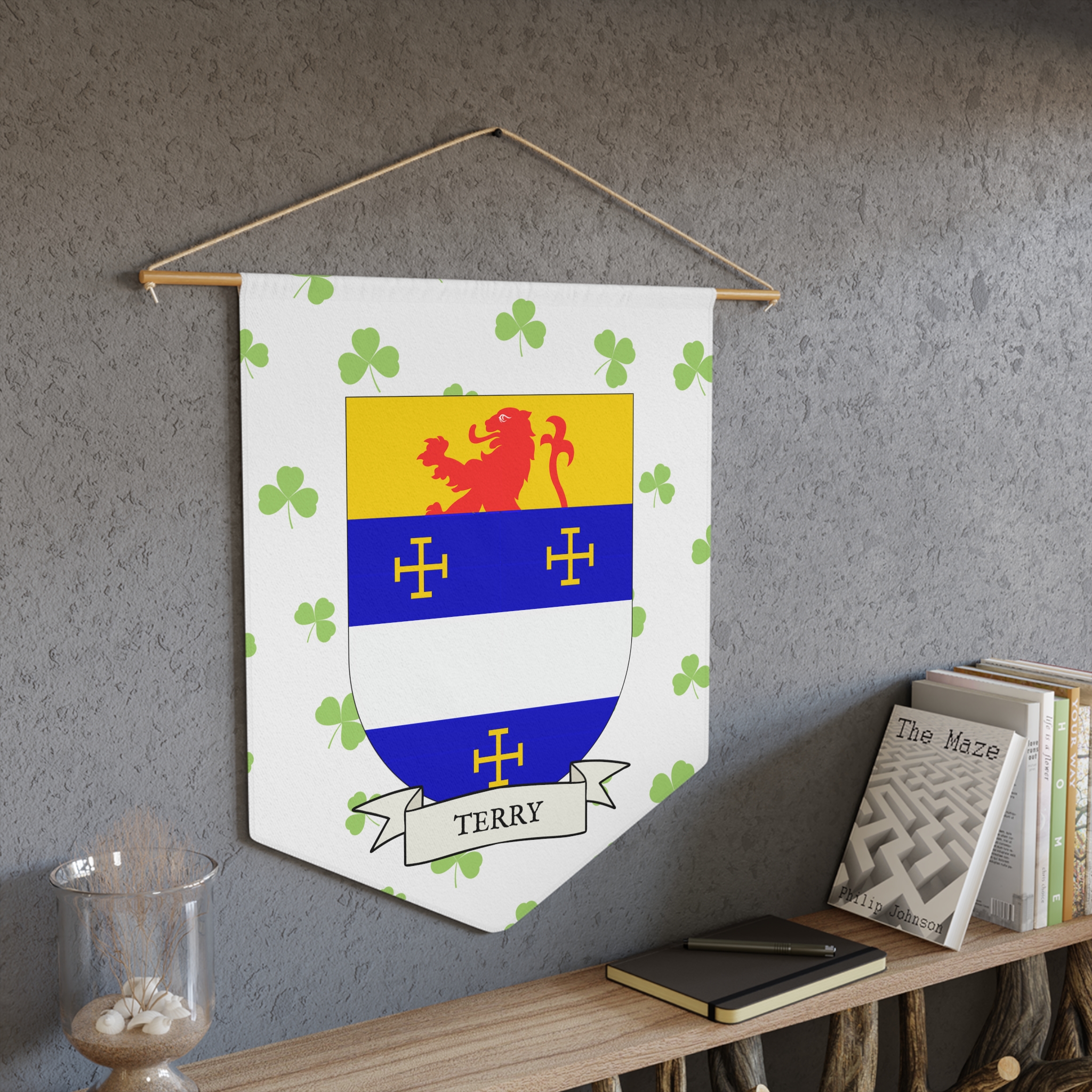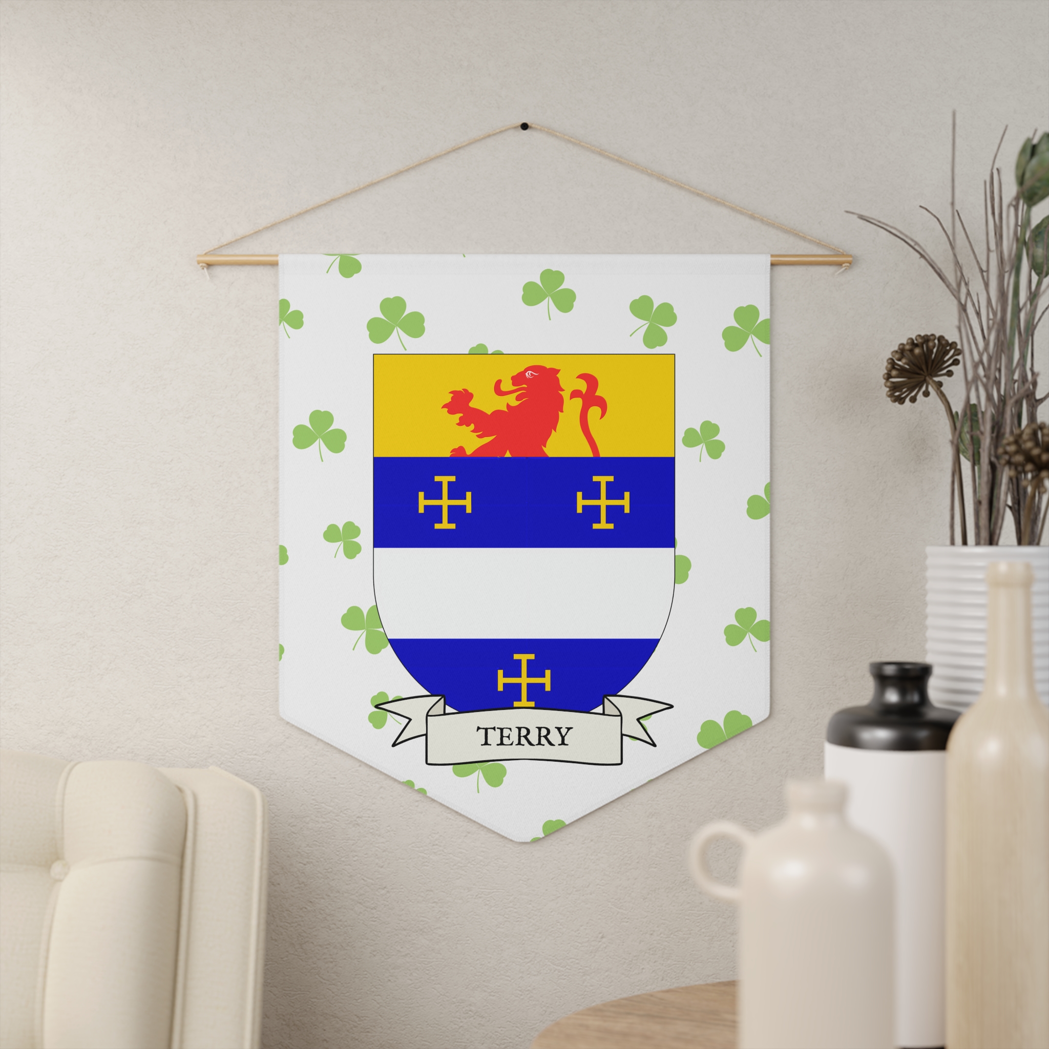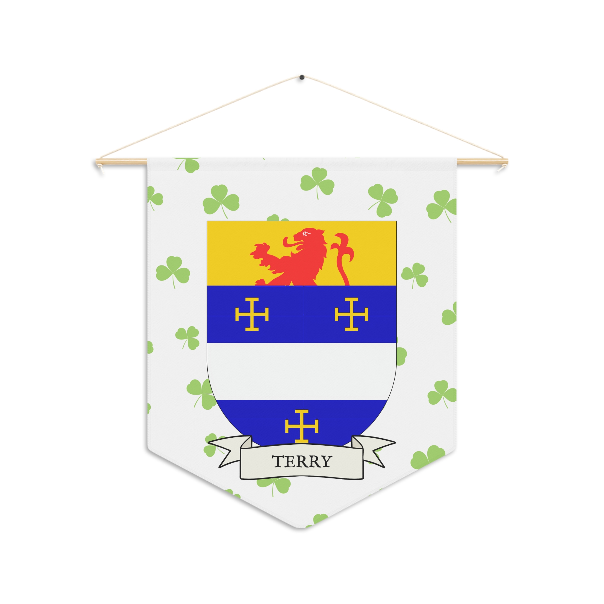 Uplift any room and show off your Irish American roots with this Terry Family Coat of Arms Indoor Pennant. Pennant is printed on durable poly twill and comes with a wooden dowel/twine frame for easy hanging. Features your family Coat of Arms printed over a restrained shamrock patterned background.