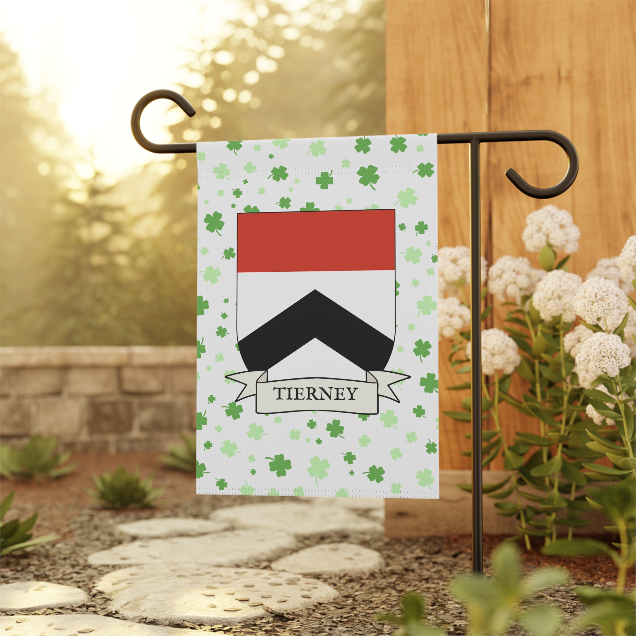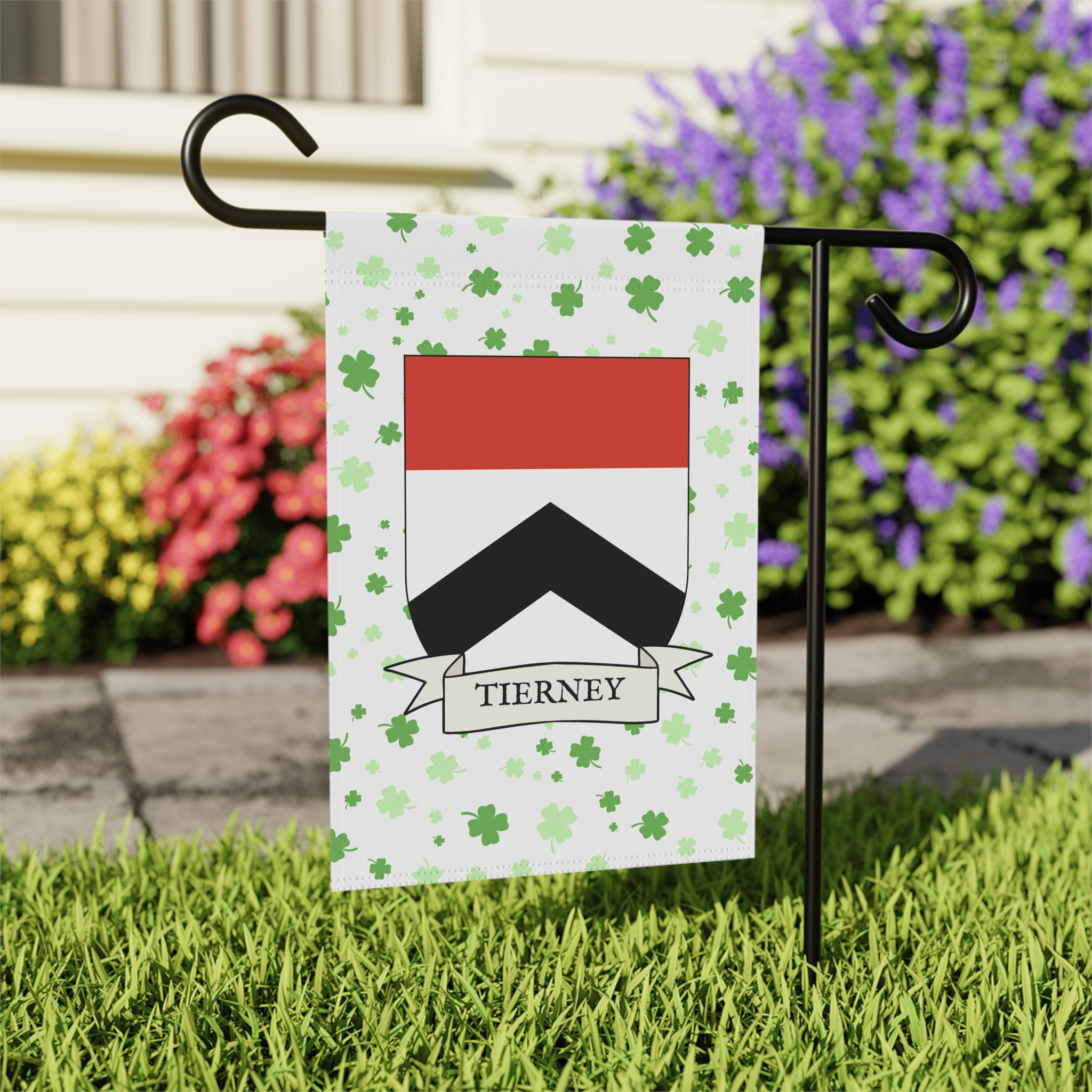 This welcoming Garden Banner will be a great addition to your garden or yard. It displays the Tierney Family Coat of Arms over a subtle background showing a field of four-leaf shamrocks. Both sides show identical images.