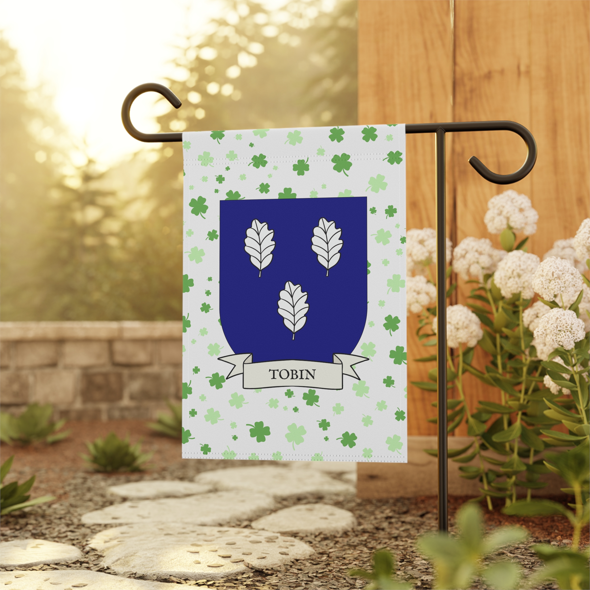 This welcoming Garden Banner will be a great addition to your garden or yard. It displays the Tobin Family Coat of Arms over a subtle background showing a field of four-leaf shamrocks. Both sides show identical images.