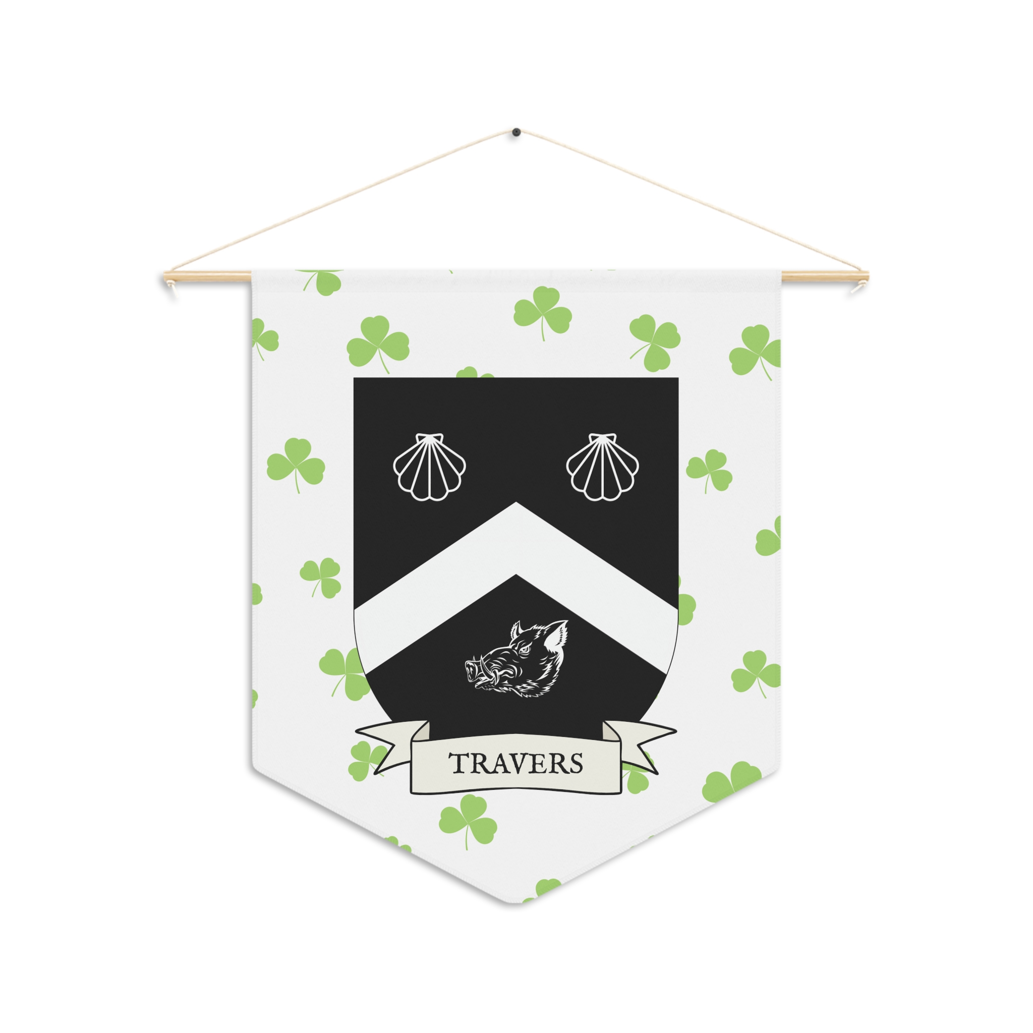 Uplift any room and show off your Irish American roots with this Travers Family Coat of Arms Indoor Pennant. Pennant is printed on durable poly twill and comes with a wooden dowel/twine frame for easy hanging. Features your family Coat of Arms printed over a restrained shamrock patterned background.