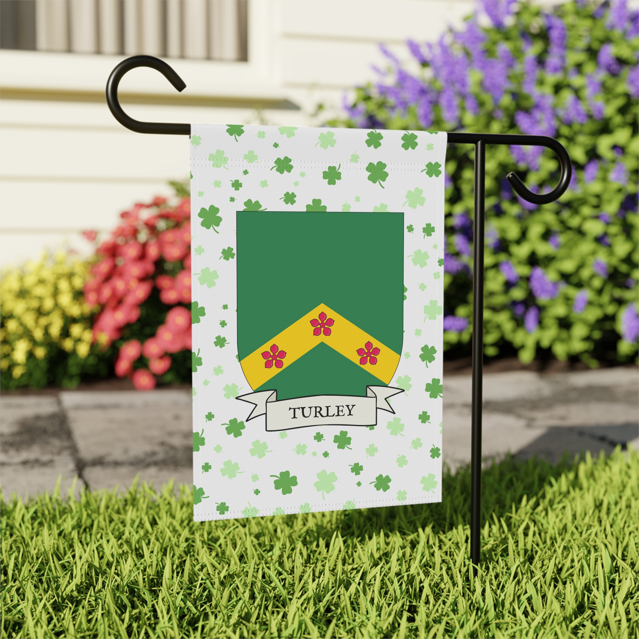 This welcoming Garden Banner will be a great addition to your garden or yard. It displays the Turley Family Coat of Arms over a subtle background showing a field of four-leaf shamrocks. Both sides show identical images.