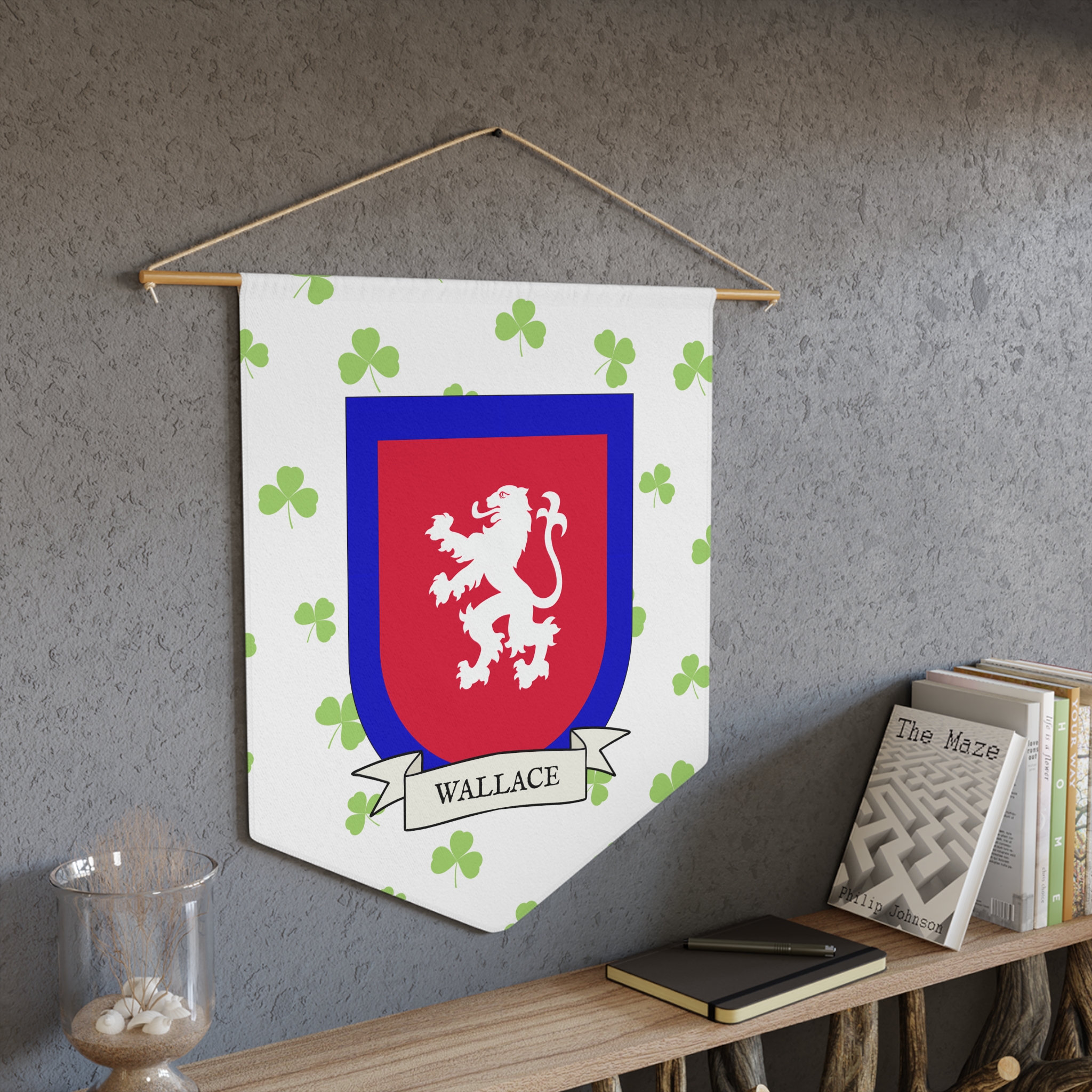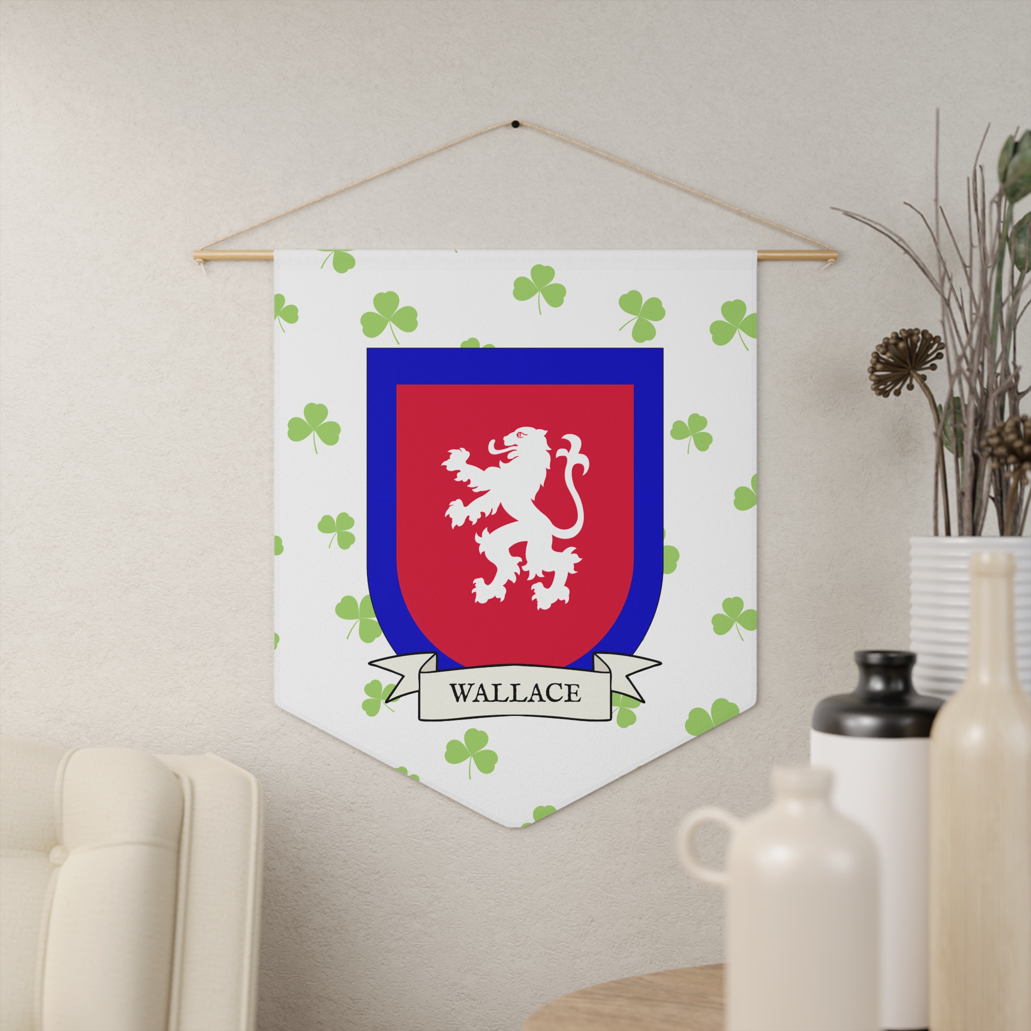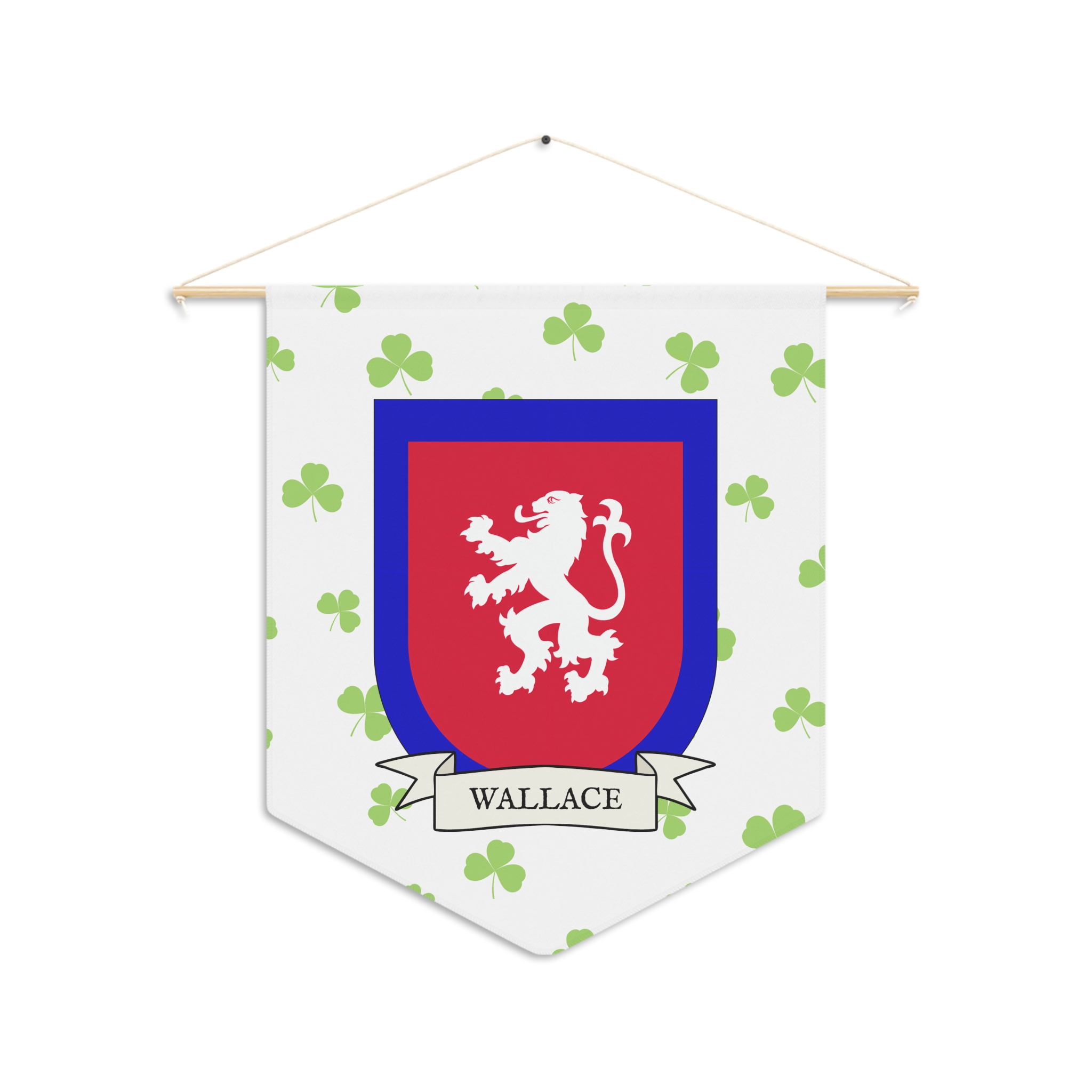 Uplift any room and show off your Irish American roots with this Wallace Family Coat of Arms Indoor Pennant. Pennant is printed on durable poly twill and comes with a wooden dowel/twine frame for easy hanging. Features your family Coat of Arms printed over a restrained shamrock patterned background.